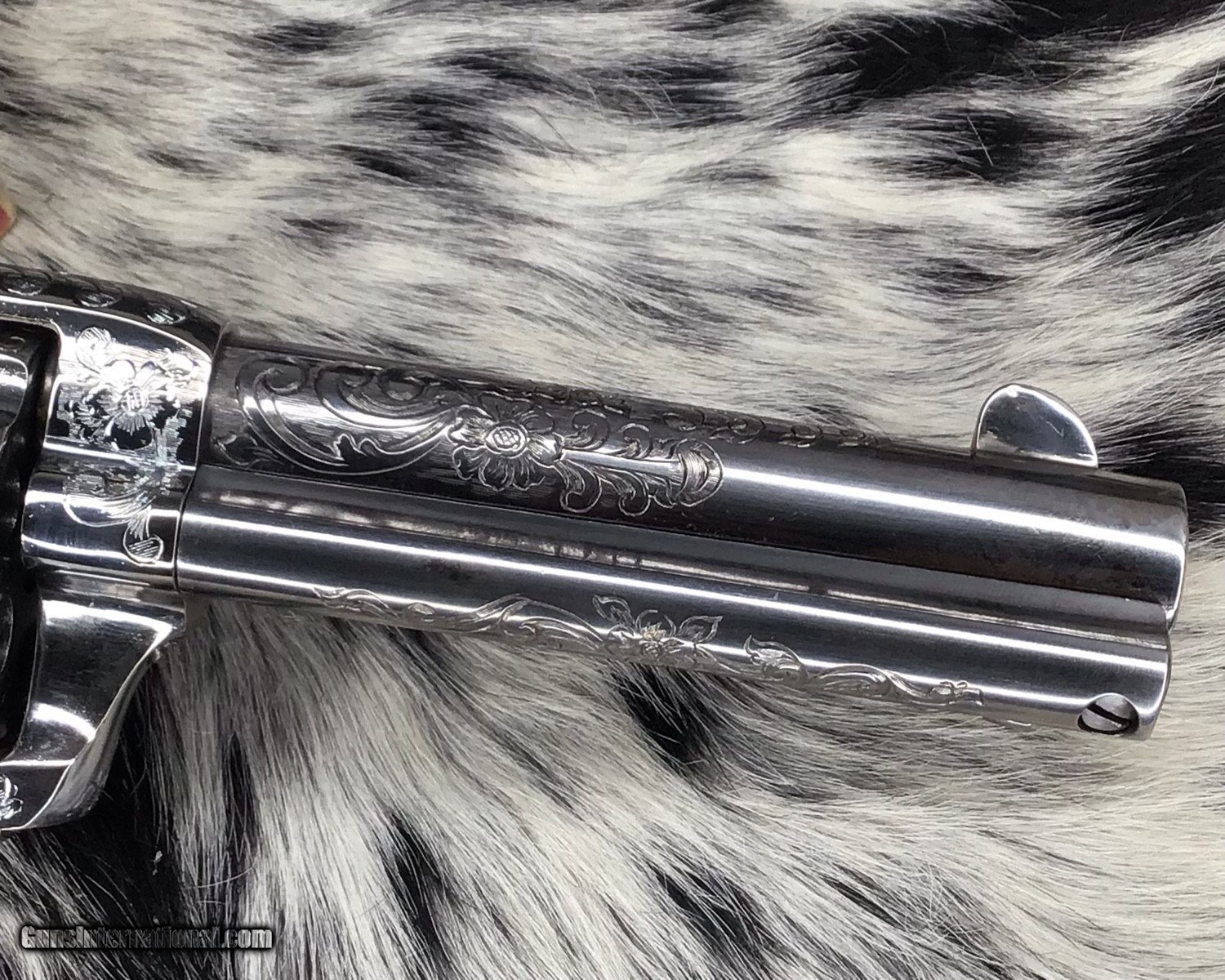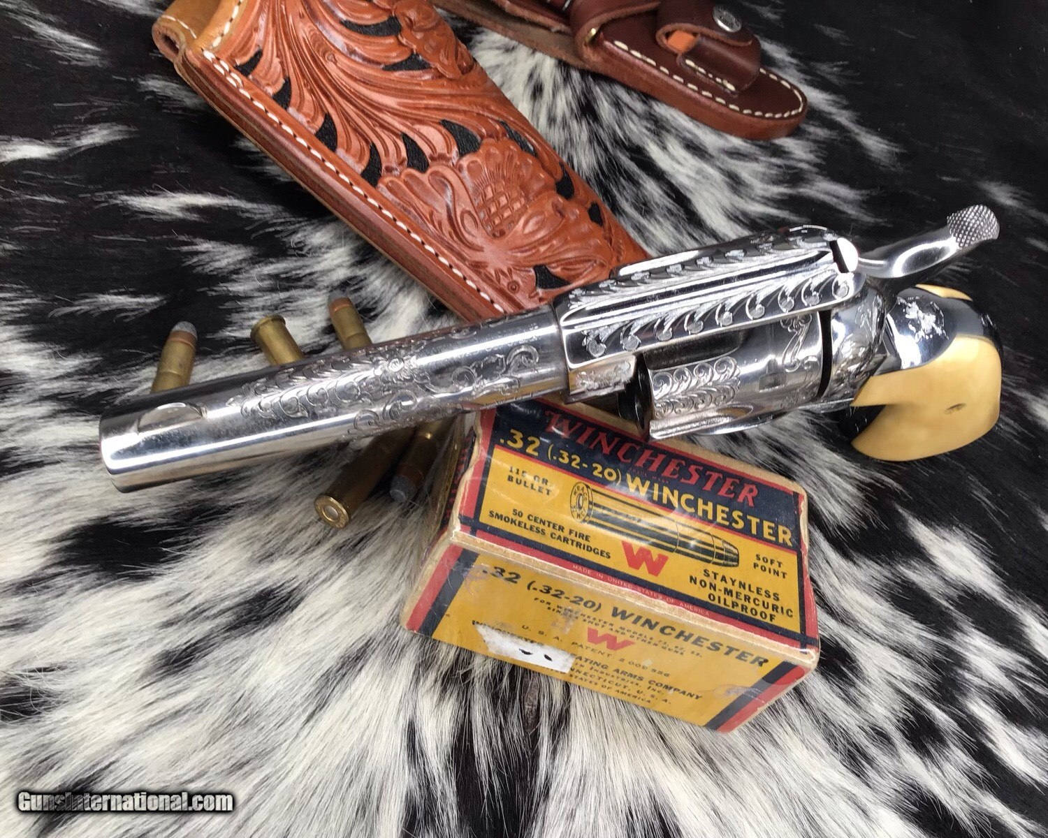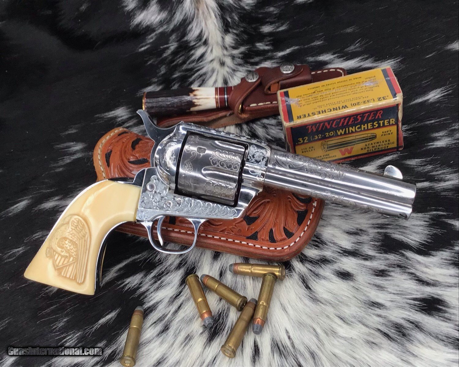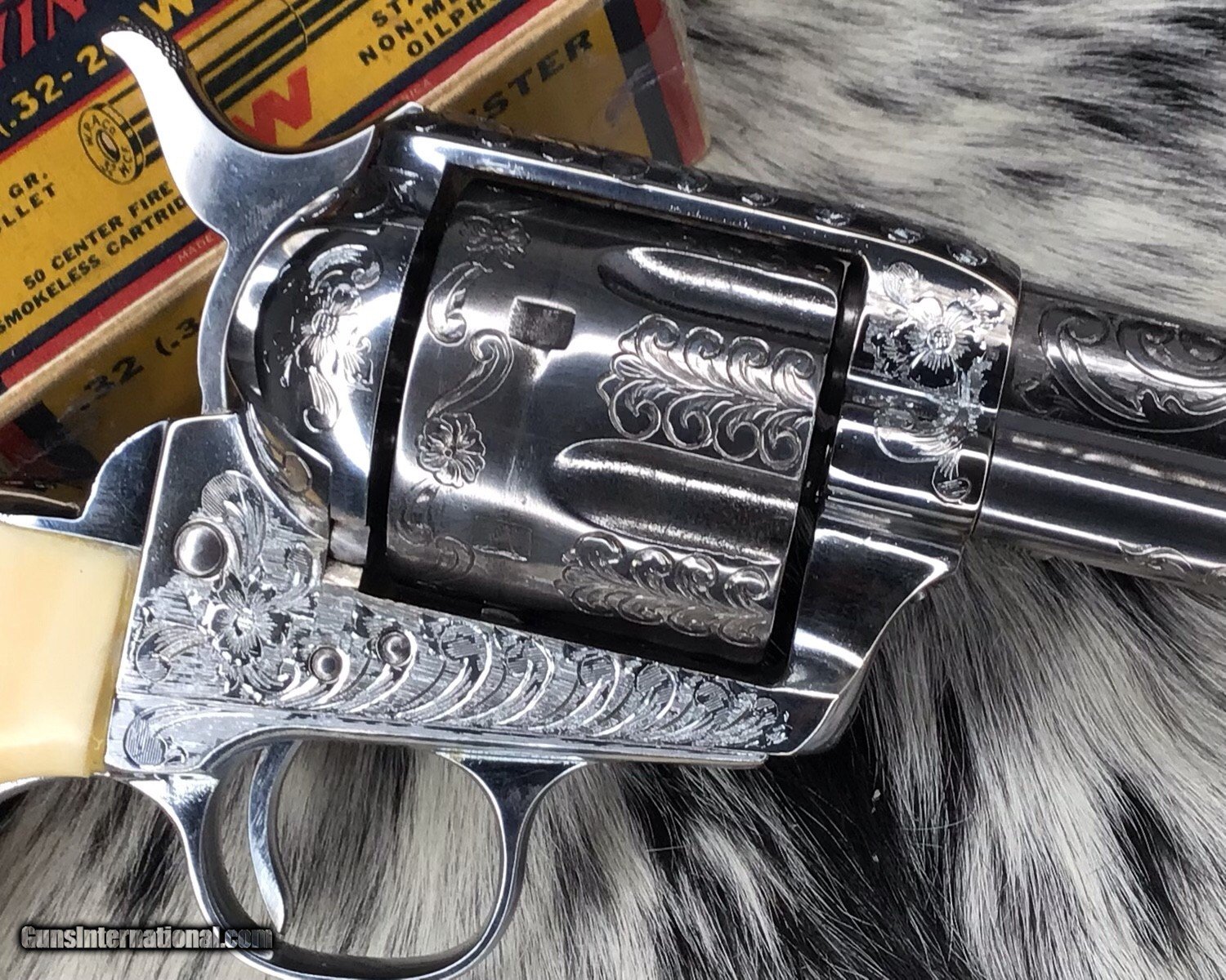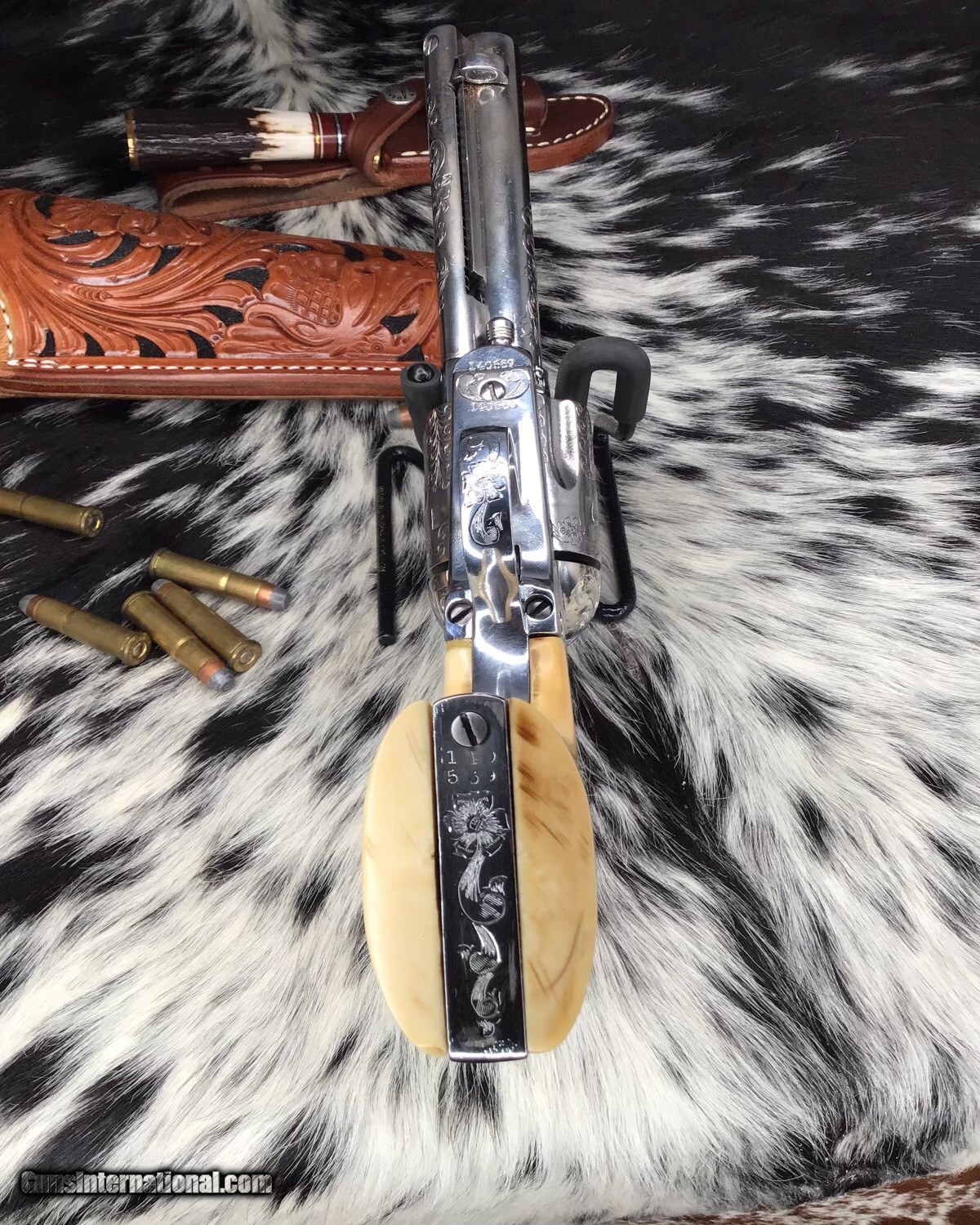 Description: Colt SAA made in 1892, wearing a 4.75 inch barrel, floral hand engraved , Nickel finish with antique carved Elephant Ivory grips. Chambered in 32 WCF/25-20 caliber. Numbers match on frame, trigger guard and butt. Bright Nickel finish intact with no flaking . Barrel address and patent dates crisp and legible. Good bore with strong rifling, action cycles well with tight lockup. The hand engraving follows a floral theme with well placed flowers centering tasteful scrolled engraving. 65% to 75% coverage hand engraving. Overall in high condition for a 129 years young Colt. Grips show some shrinkage with age but still have a beautiful honey gold luster. A unique and special antique Colt SAA in a style maybe owned by a businessman banker or carried by a well accessorized female. Antique firearm requires no transfer or FFL , can be shipped direct to your address, insurance highly recommended on shipment . Add 3% if paying with credit card. Holster shown in pics not included, God Bless America from a proud American, and a Viet Nam Vet , thankful for our freedoms.. paid for by the Blood ,Sweat and Tears of our brave men and women in uniform. Ten Below Firearms is a Veteran owned and operated business. We specialize in out of production models of high quality firearms. We love to ship! If you are out of state or can't make it to our store, just give us a call! Handguns normally ship for $30 and Long guns for $40 to $55 for extra length long guns. That's 2-3 day USPS Priority shipping, Delivery conformation and with tracking number. Optional Postal insurance is additional $1.50 per $100 and highly recommended. SOLD Antique: Yes Handgun Caliber: .32-20 Winchester (.32 WCF, .32-20 Marlin, .32 Colt Lightning ) Manufacturer: Colt Model: Single Action Army Serial Number: 140569 Barrel Length: 4.75 inch Condition: Very good Metal Condition: Very good Bore Condition: Very good Action: SA Finish: Nickel Manufacture Date: 1892 Engraving: Hand Floral with scrolls |