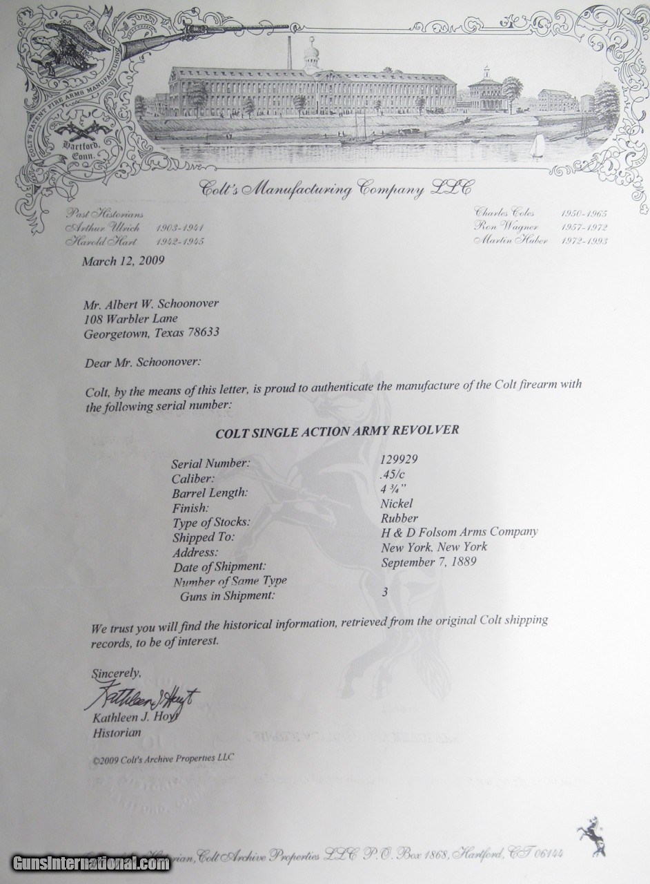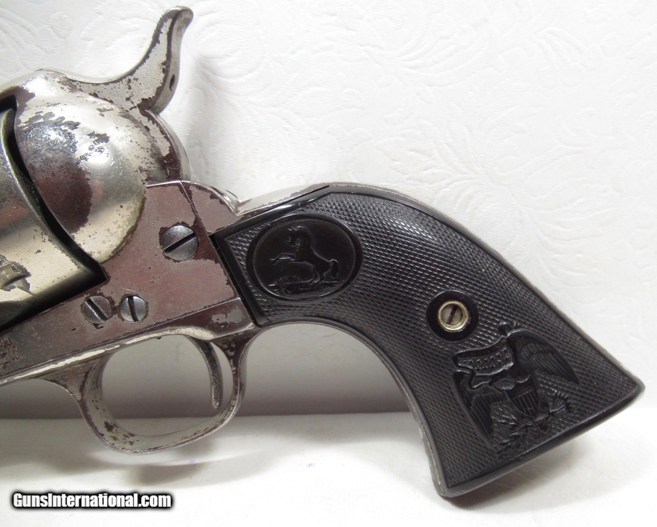 Description: Colt Single Action Army Revolver; Serial No. 129929; Per Included Factory Letter: .45 Caliber with 4 ¾” Barrel, Nickel Finish, and Rubber Grips; Shipped as Part of a 3 Gun Shipment to Colt Master Distributor H&D Folsom Arms Company of New York, NY on September 7, 1889; Addressed to Individual from Georgetown, Texas (Austin, TX Area) in 2009; 100% Correct and Matching; Good Old Texas Dirty Nickel Gun with Lots of Metal Finish; Nice Original Eagle Grips; Perfect Action; Strong Bore with some chattering; Full Front Sight; Nice Original Screws; From the Collection of Dr. H.H. Miller of Abilene, Texas; See All Photos for Condition; No Texts; Call (254)541-5765 or Email Only; PERSONAL PROPERTY of Harold Wieser; Price: $5,975 + $45 S&H Via USPS PRIORITY MAIL; Payment Address: Harold Wieser - 1466 U.S. Hwy 77 - Rosebud, TX 76570; SEND PAYMENTS VIA USPS PRIORITY MAIL; BEWARE of SCAMS!!! – DO NOT SEND MONEY or CORRESPONDENTS ELECTRONICALLY UNLESS YOU HAVE SPOKEN to HAROLD WIESER FIRST! 254-541-5765 SOLD Antique: Yes Manufacturer: Colt Model: 1873 Serial Number: 129929 |