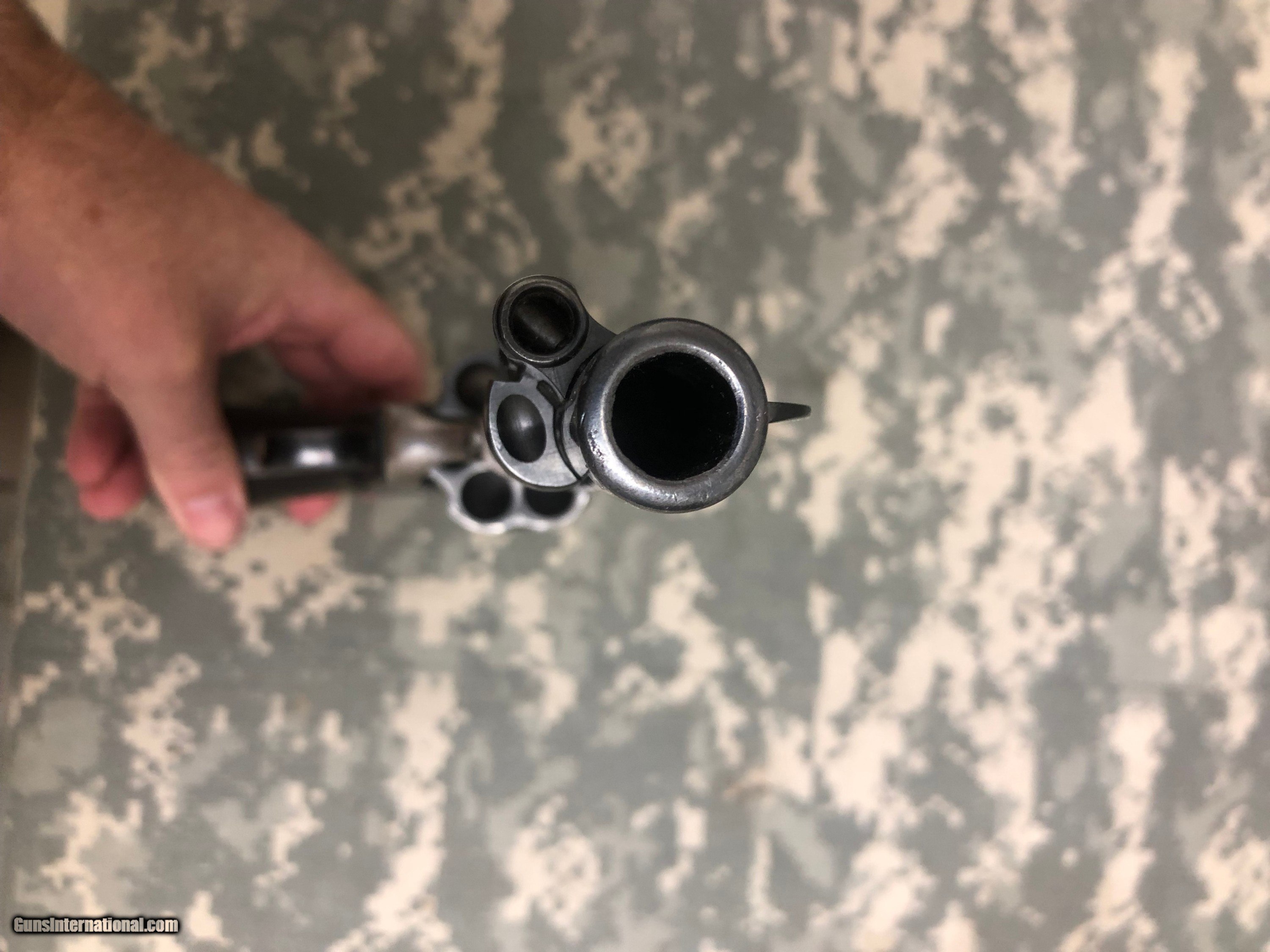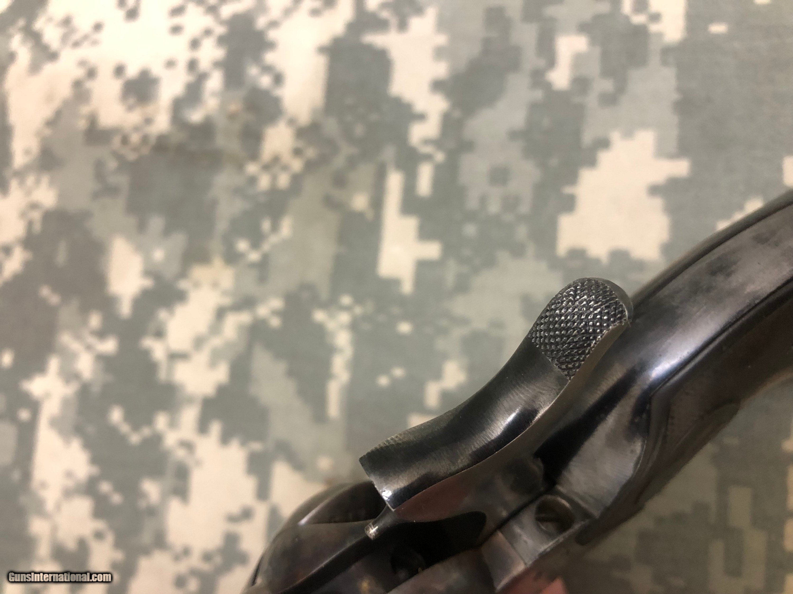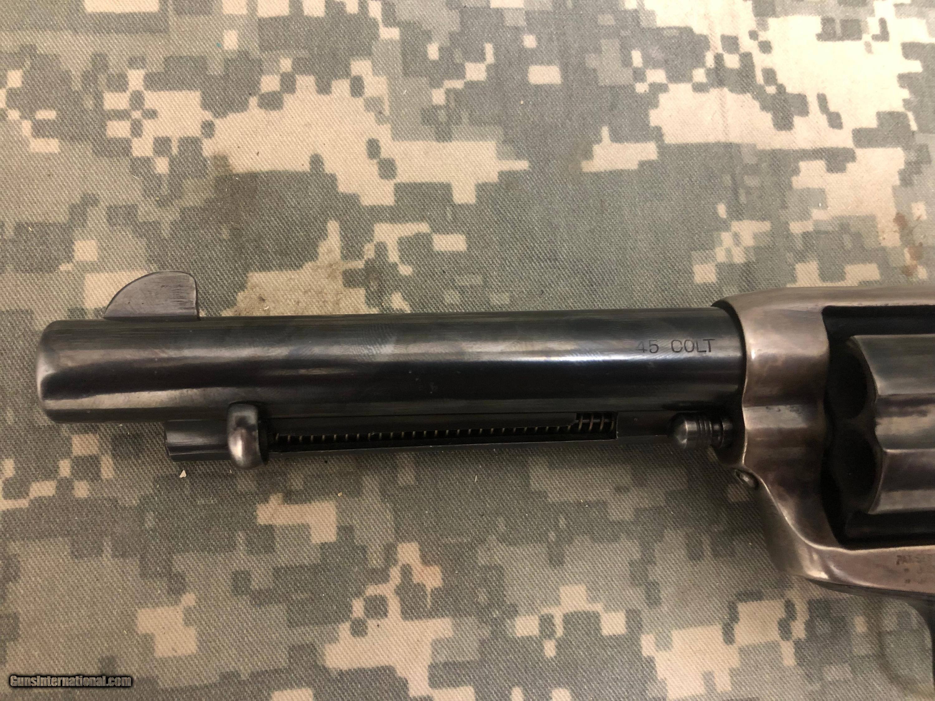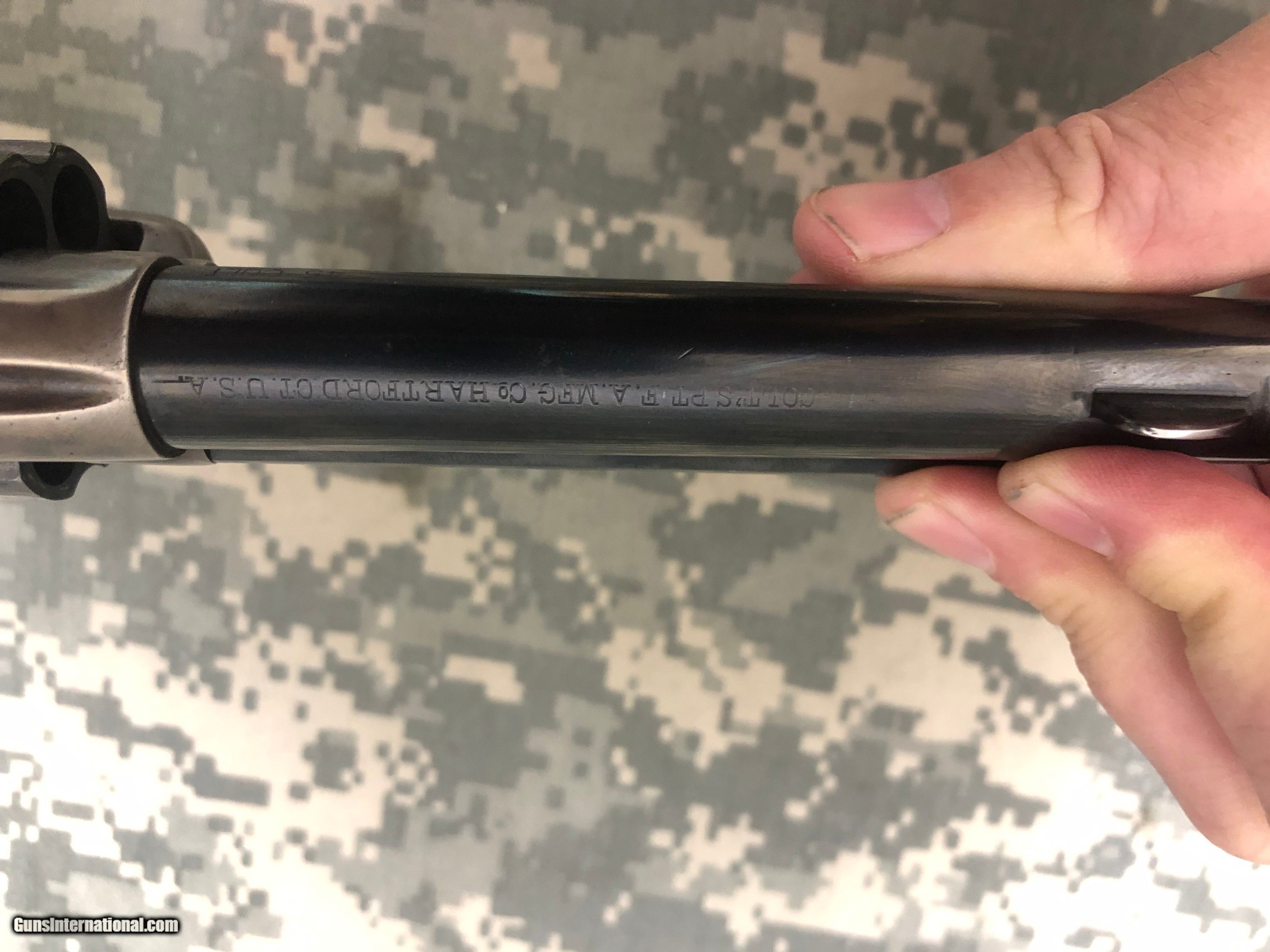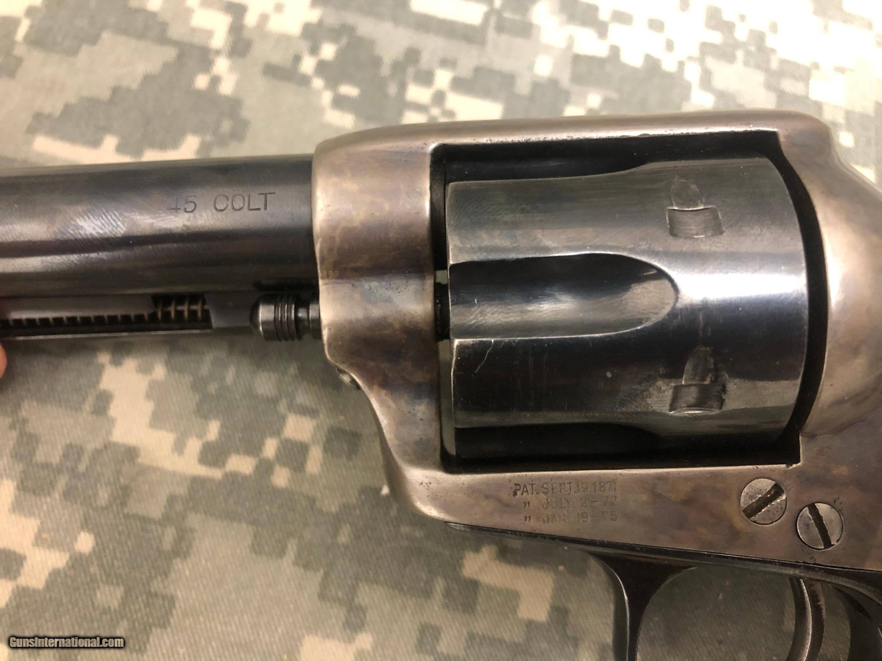 Description: Antique 1st Gen Colt Model 1873 (aka Single Action Army or “Peacemaker”). This revolver was manufactured in 1890 and is chambered in 45 Colt. Barrel is 5-1/2” long. The two piece hard rubber grips with rampant colt motif show significant wear. Patent marking is three line, three date. Oval shaped ejector. Caliber marked on left side of barrel. Matching serial number on butt, trigger guard, and frame. Cylinder pin retained by vertical screw (Black Powder). Hammer has been replaced as evidenced by lacking the border around the knurling and line underneath. The frame is color case hardened and still retains some color. We believe the barrel, cylinder, and trigger guard have been re-blued but are not verified. Barrel, cylinder, ejector assembly, and trigger guard retain 98% of blued finish. Back strap is about 80%. Bore has minor pitting and is still shiny. Our Standard shipping is $50 for 2nd Day; add $20 for Insurance Price reflects a 3% cash discount. For credit card purchases, add 3% for the loss of discount. SOLD Antique: Yes Handgun Caliber: .45 Colt Manufacturer: Colt Model: 1873 (Peacmaker, Single Action Army) Serial Number: 130192 Barrel Length: 5-1/2 |