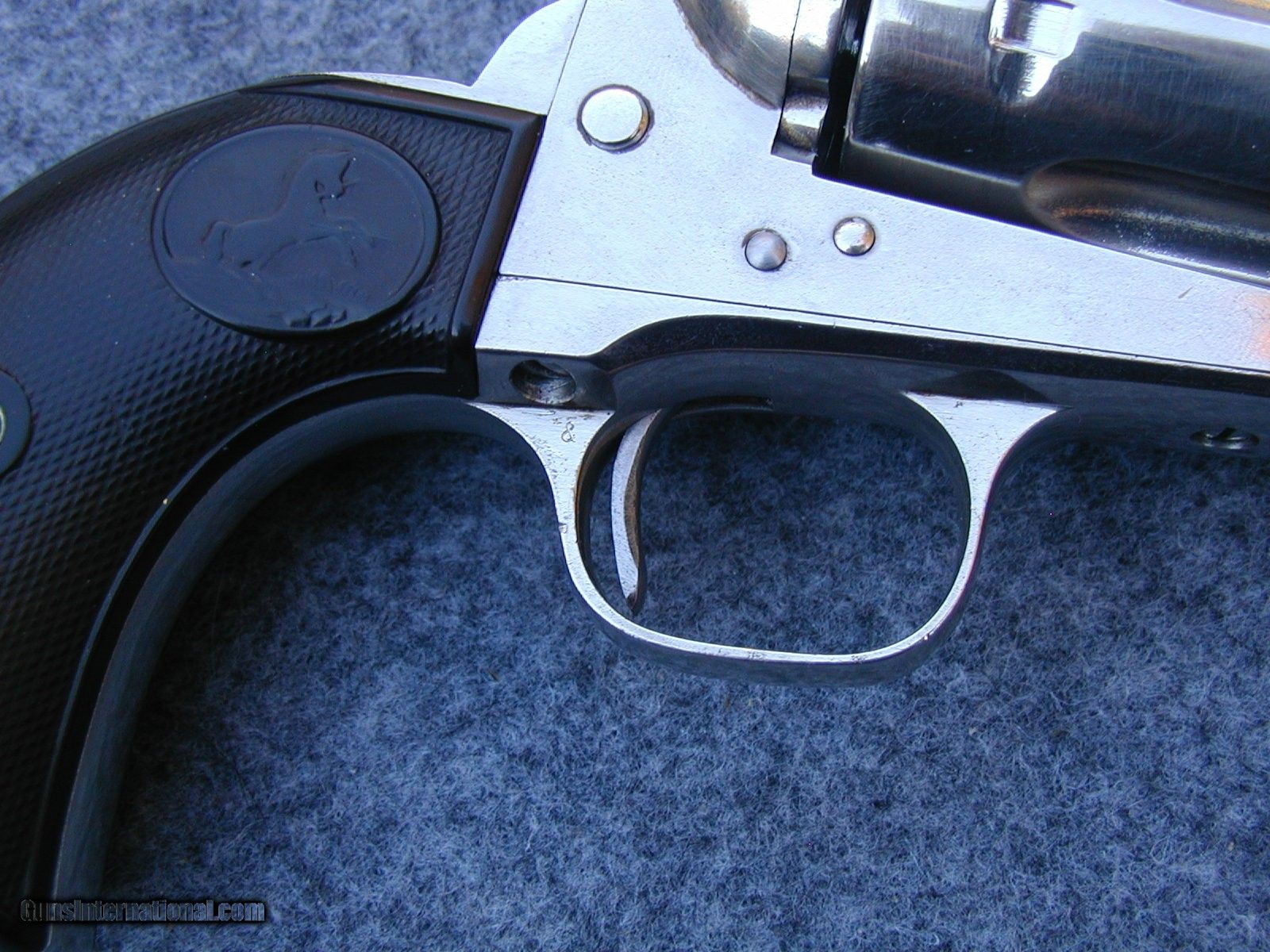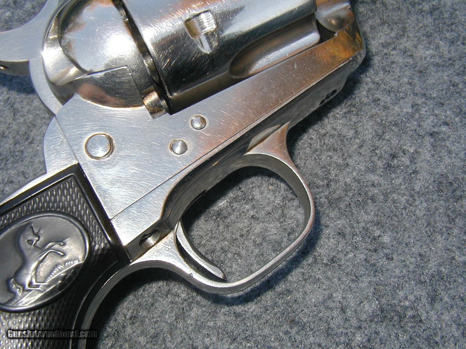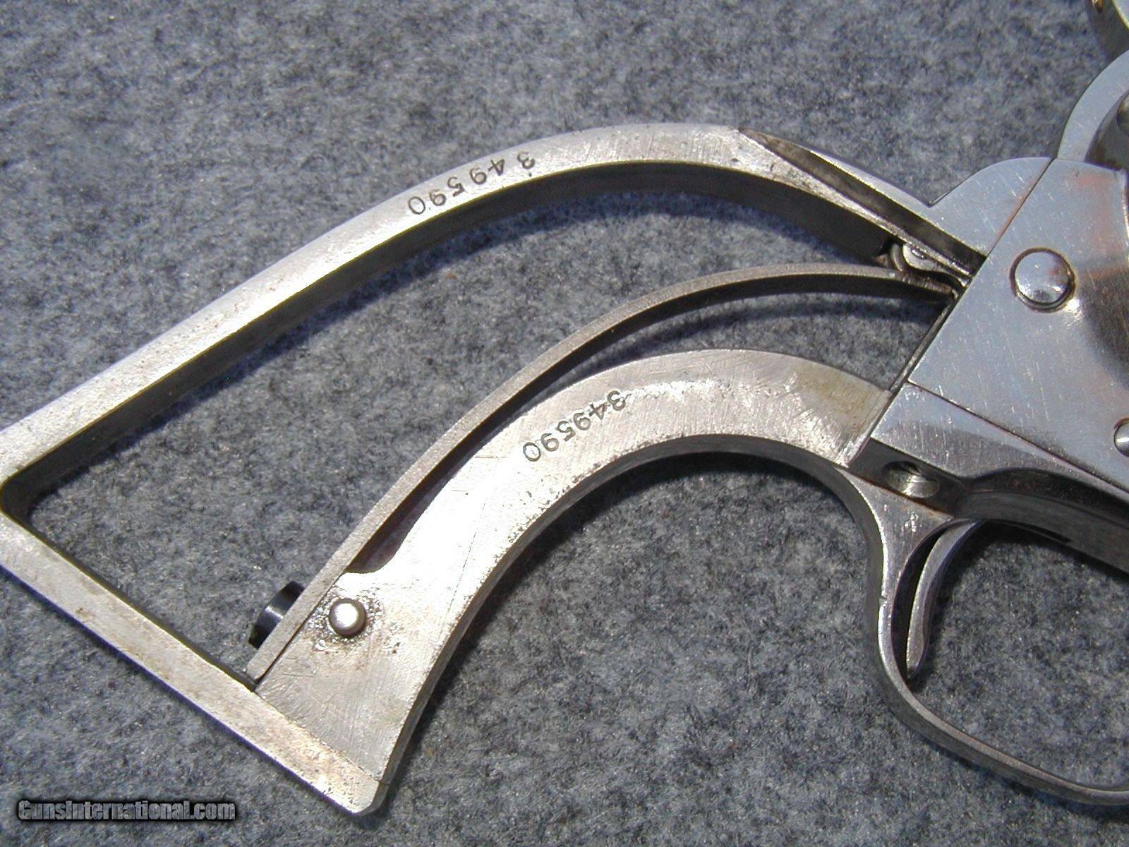 Description: THIS IS A VERY ATTRACTIVE 1ST GEN. COLT . 45 NICKEL SAA, MADE IN 1927.....IT IS MATCHING THROUGHOUT, SHOWING LIGHT USE AND WEAR, WITH EXCELLENT NUMBERED GRIPS THAT FIT PERFECTLY ....ACTION IS TIGHT AND CRISP WITH ALL 4 CLICKS, BORE IS EXCELLENT!.....IT RETIANS VIRTUALLY ALL / 98% OF IT'S NICKEL FINISH, BUT SHOWS AN AMPERSAND ON THE RIGHT REAR TRIGGER GUARD, INDICATING IT WENT BACK TO THE FACTORY, MOST LIKEY TO REFINISH, WE BELIEVE, BUT HARD TO TELL, SO WE ARE SELLING IT AS A FACTORY REFINISHED COLT ......ALL MARKINGS ARE PERFECTLY CLEAR AND SHARP THROUGHOUT... C&R OK... SOLD Curio/Relic: Yes |