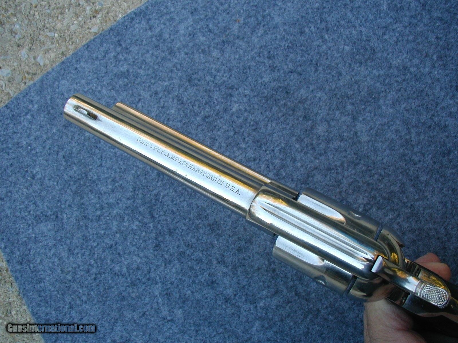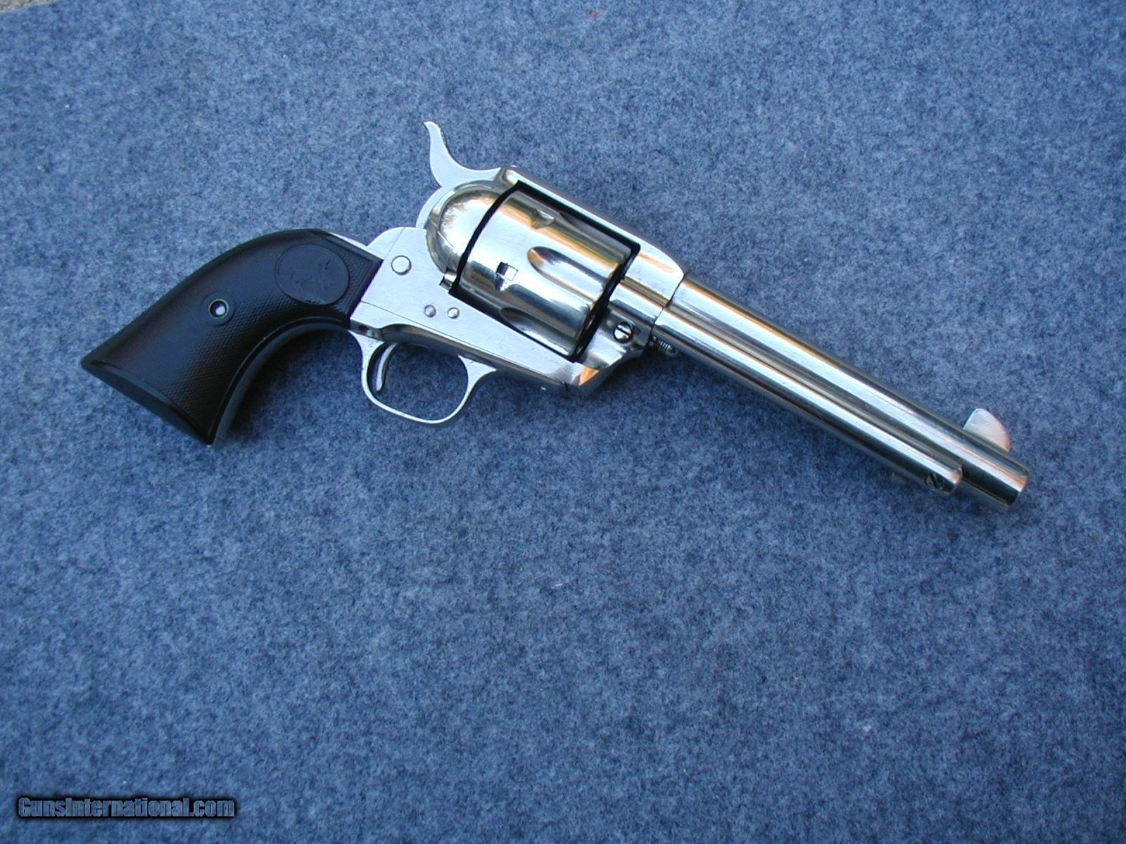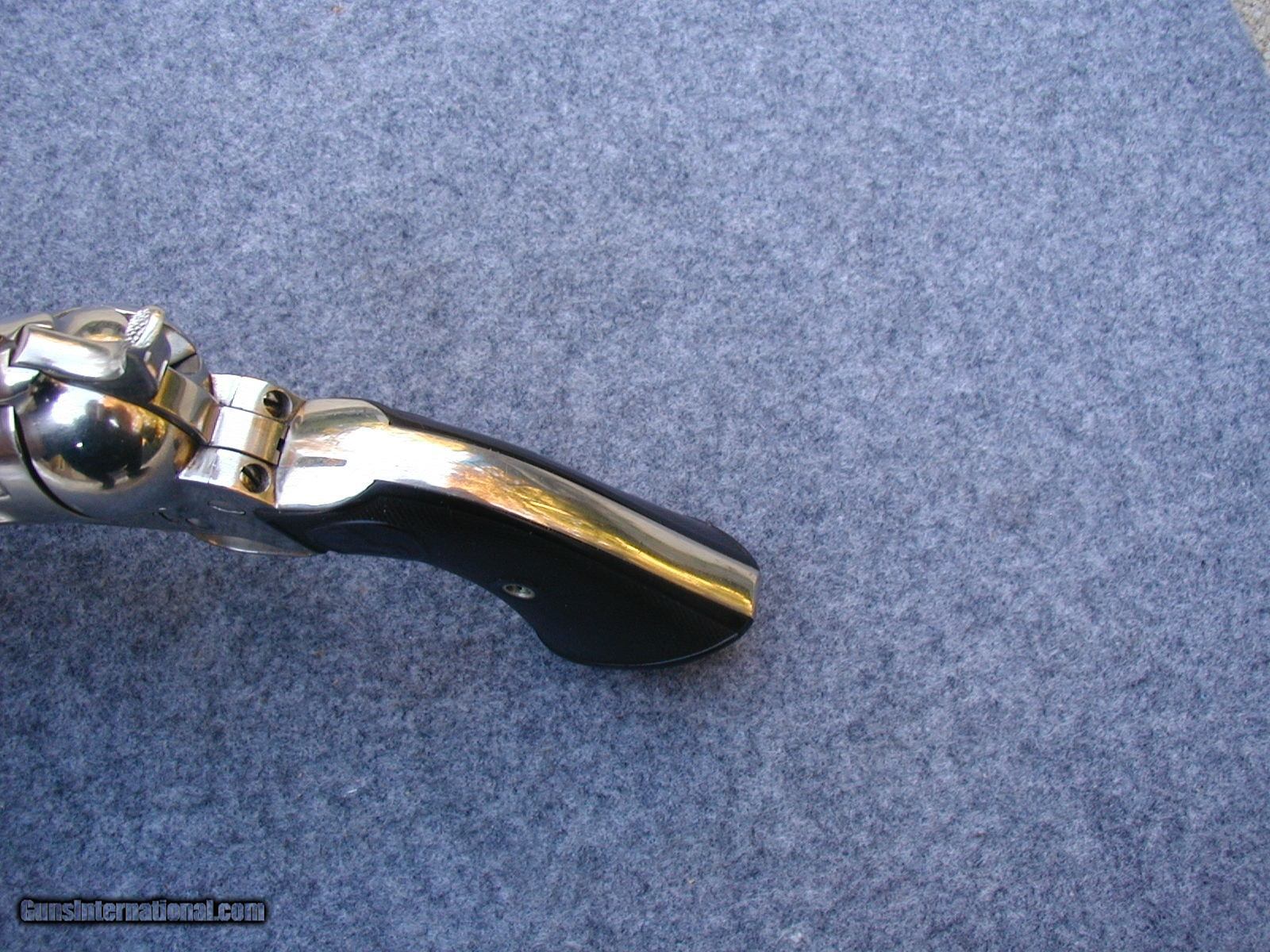 Description: THIS IS A VERY ATTRACTIVE 1ST GEN. COLT . 45 NICKEL SAA, MADE IN 1927.....IT IS MATCHING THROUGHOUT, SHOWING LIGHT USE AND WEAR, WITH EXCELLENT NUMBERED GRIPS THAT FIT PERFECTLY ....ACTION IS TIGHT AND CRISP WITH ALL 4 CLICKS, BORE IS EXCELLENT!.....IT RETIANS VIRTUALLY ALL / 98% OF IT'S NICKEL FINISH, BUT SHOWS AN AMPERSAND ON THE RIGHT REAR TRIGGER GUARD, INDICATING IT WENT BACK TO THE FACTORY, MOST LIKEY TO REFINISH, WE BELIEVE, BUT HARD TO TELL, SO WE ARE SELLING IT AS A FACTORY REFINISHED COLT ......ALL MARKINGS ARE PERFECTLY CLEAR AND SHARP THROUGHOUT... C&R OK... SOLD Curio/Relic: Yes |