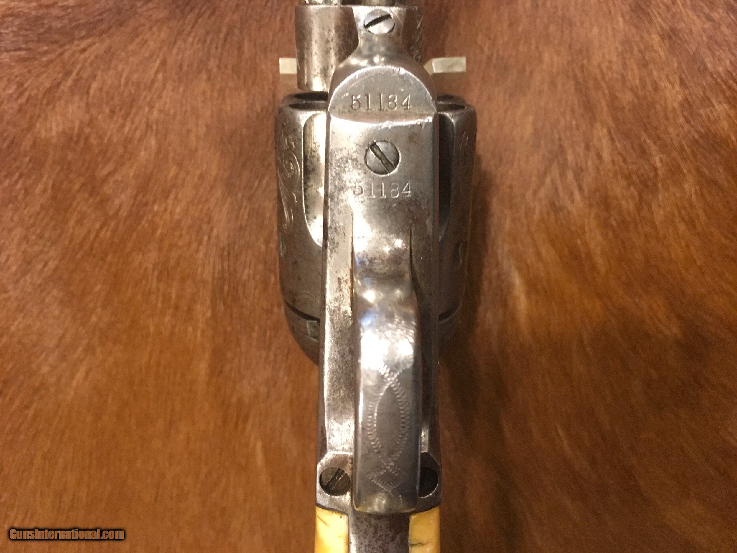 Description: Fantastic New York Engraved Colt Single Action Army Etched Panel with carved snake & eagle ivory grips! Serial number 51184 is accompanied by a Colt archive letter confirming the characteristics of the Colt as it left the factory as a .44/40 cal, barrel length not listed, blue finish, grips not listed and shipped to J.P. Moores & Sons in New York on February 5, 1879 in a shipment of 50 guns. The remarks on the letter indicate the barrel length would have been 7 1/2” and the stocks would have been walnut as those were the standard features during this time period. The Colt Factory did not start shipping “soft” finish guns for engraving outside the factory until 1881. Prior to that time, it was common practice for retailers to pull a blue gun from inventory and send it to a local engraver to fill a customer’s order. The gun is beautifully engraved in a typical New York style pattern with Germanic scrolls and punch dot backgrounds, likely from the L.D. Nimschke shop. The engraving remains sharp and deep with very little wear. The is a significant amount of the original nickel remaining that was NY applied to the gun after engraving. The markings are all clear and well struck. The serial numbers match on the frame, triggerguard and backstrap with the last 4 digits on the cylinder. There is a very minor amount of pitting on the cylinder. The “COLT FRONTIER SIX SHOOTER” etched panel is a little faint but all readable on the side of the barrel. All factory applied markings are clear and sharp. The carved, ivory grips are in beautiful condition and slightly undersized to the grip frame. The action functions flawlessly and the bore is very good. This is an outstanding Colt that would be welcome in any advanced collection. Free, Insured Shipping direct to your door where allowed by law in the contiguous US states. More photos can be provided upon request. Please email any questions to kcathlina at aol. SOLD Antique: Yes |