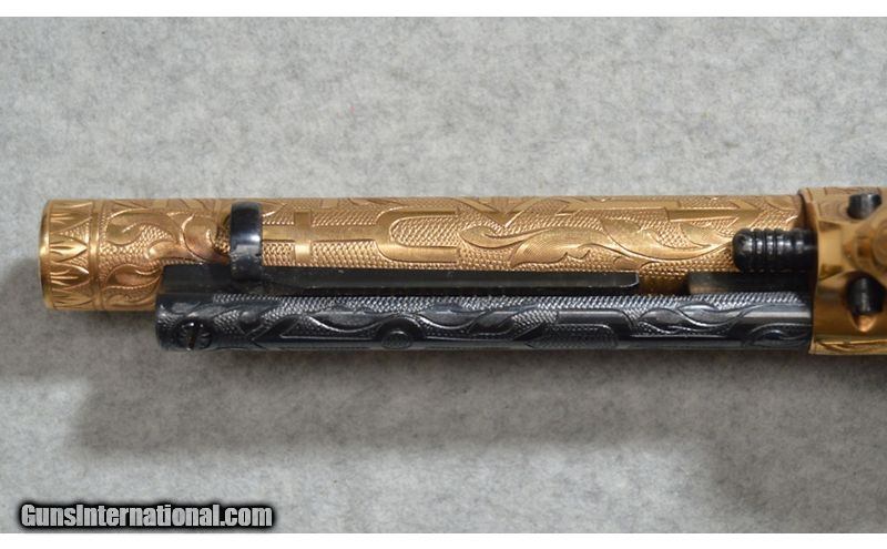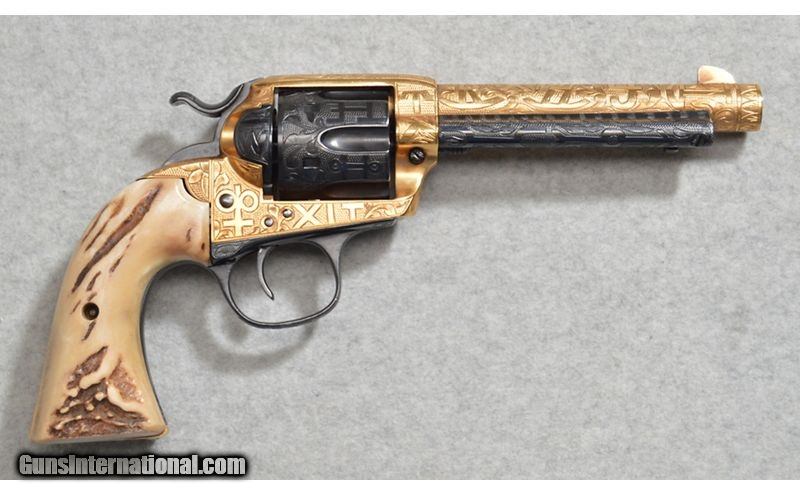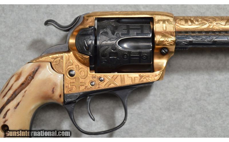 Description: Colt 1st Generation, Single Action Army Bisley Model, serial number 317586. Manufactured in 1911, this Colt is chambered in .38 Special. It is covered in a Cattlebrand engraving, Gold Wash barrel and partial frame, and stag grips that is attributed to Cole Agee. It has matching serial numbers on the frame, trigger guard, and bottom of the grip. It shows very few handling marks and has a clean bore with strong rifling. Hammer does not lock back & no clicks present. .38 S&W Special SOLD Curio/Relic: Yes Metal Condition: Excellent Bore Condition: Clean and strong rifling Barrels: 5 1/2 Butt Pad: Stag grips Weight: 2 lb 13 oz Sights: Fixed front sight and frame notch rear sight Item Location: Fort Worth, TX |