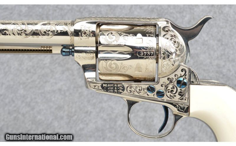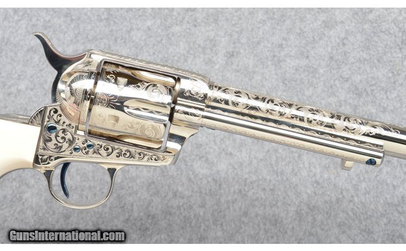 Description: Colt 1st Generation Single Action Army Custom . Intermediate black powder configuration built in 1878, later professionally enhanced with " New York style" foliate engraving , finished in high polished nickel with fire blued screws and smaller components . Clear lettering, address lines and four visible matching serial numbers. Natural grips displays a fine line crack on the right side. Overall retains all its custom finishes with a couple very minimal handling marks. None SOLD Metal Condition: Bright nickel, Fireblued screws Bore Condition: Bright and Sharp Barrels: 7 1/2 Inch Triggers: Single Action Weight: 2 lbs. Sights: Notched Rear, Blade Front Item Location: Buda, TX |