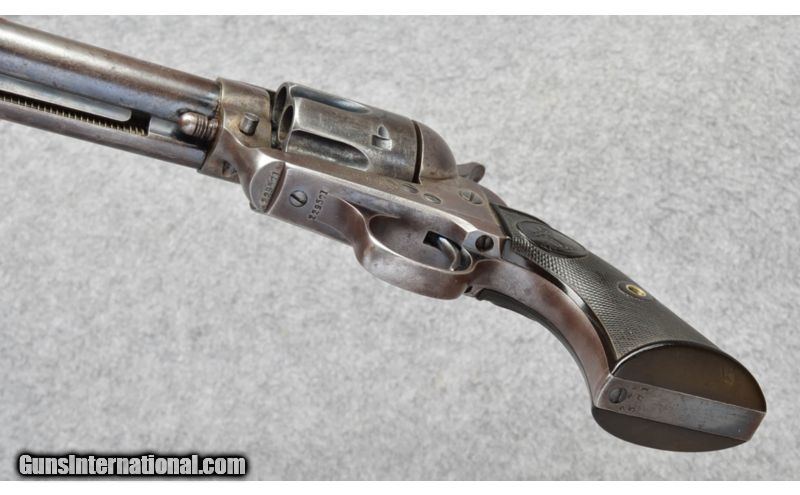 Description: Colt Single Action Army chambered in 45 Colt. Early smokeless configuration produced in 1902. Matching visable numbers. Mostly smooth gray appearance with suggestions of original case colors and bluing in the protected areas. Action offers 4-clicks , solid lock-up and good bore. SOLD Curio/Relic: Yes Manufacturer: 1902 Caliber Info: 45 ACP Metal Condition: Blued and Cases Hardened Bore Condition: Bright and Sharp, patches of light piting Barrels: 4 3/4 Inch Triggers: Single Action Stock: Colt Rubber Weight: 37 Ozs Sights: Notched frame, Blade front Item Location: Buda, TX |