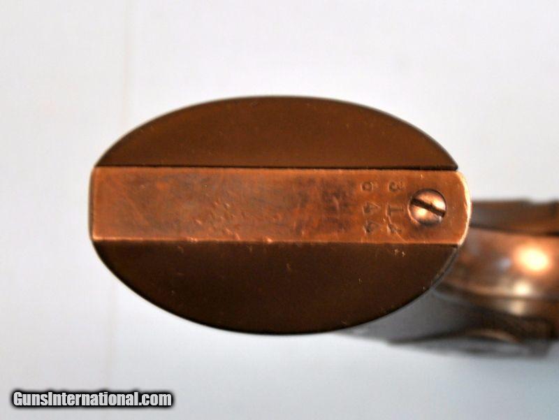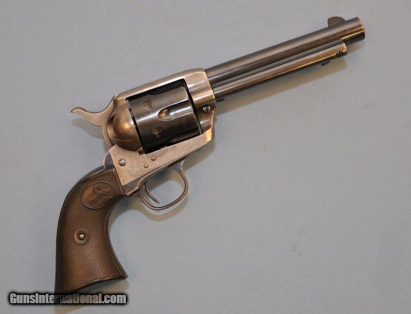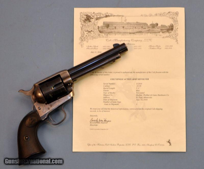 Description: 32 WCF. Serial number 312644. 5-1/2"barrel. 6 shot fluted cylinder. Blue & case colored finish. 2 peice checkered hard rubber rampant colt grips. Includes Colt Manufacturing Co.letter confirming configuration & further listing; "Shipped to: Hackett Walther & Gates Hardware Co. Address: St. Paul, Minnesota. Date of Shipment: June 14, 1910." 75% lightly faded blue. 60% light case colors showing spots of freckling. Bottom of bbl & butt have small dents. Grips show moderate wear. Sound mechanics. Bore has strong rifling with spots of very light corrosion near muzzle. Priority mail to FFL or C&R $20.00 SOLD Curio/Relic: Yes |