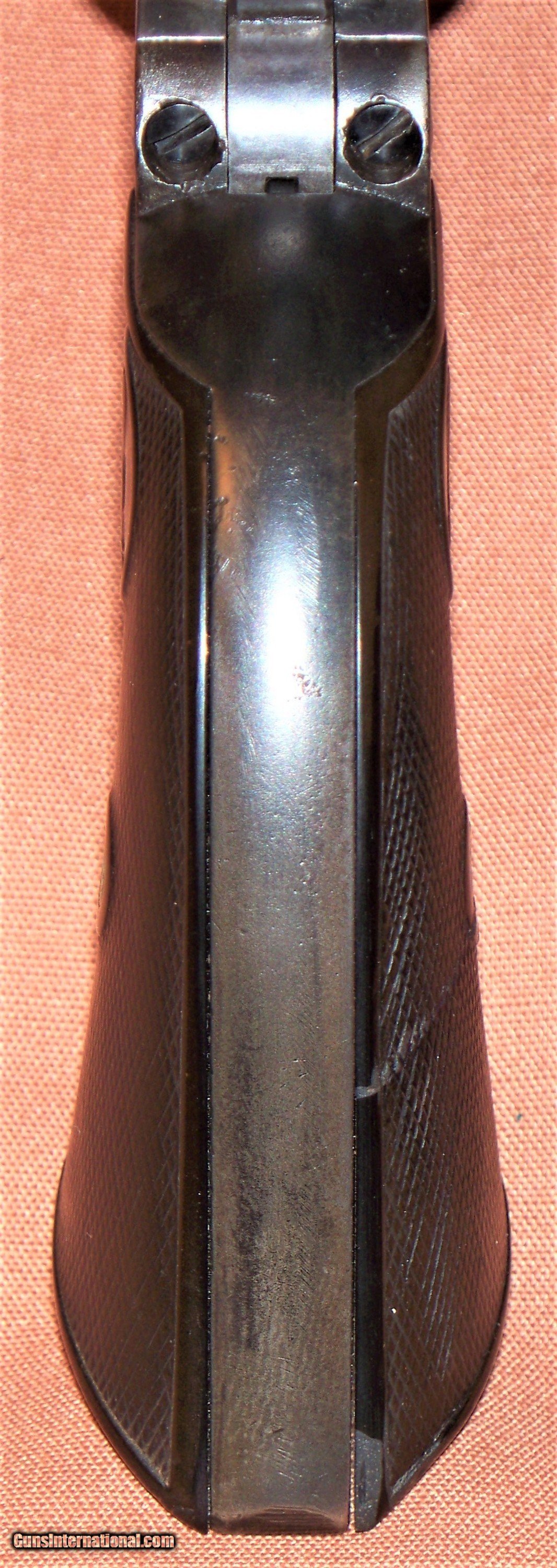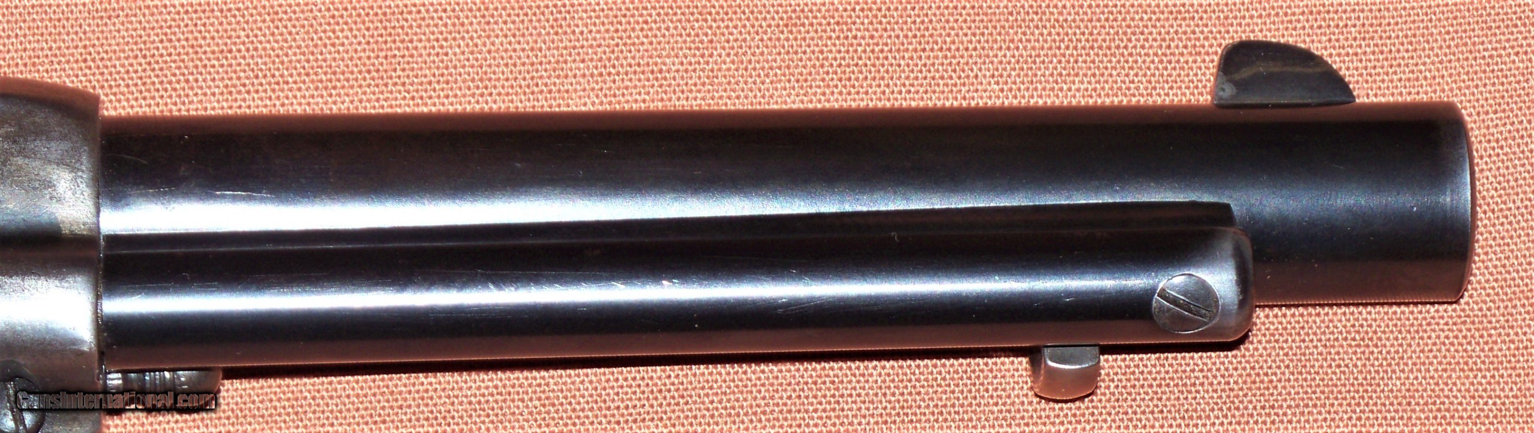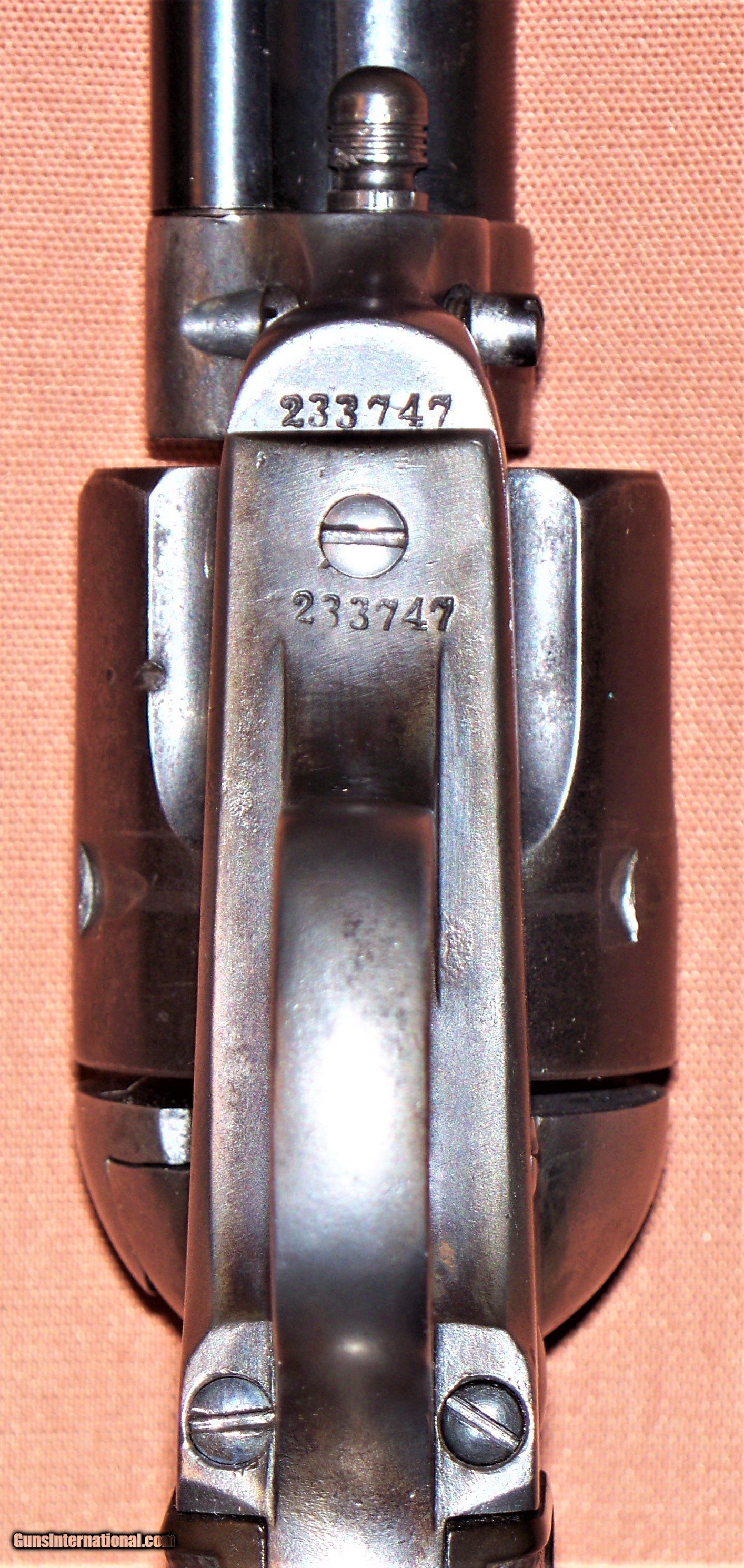 Description: This Colt Single Action Army revolver was shipped to Lee Hardware Company, Salina, Kansas, October 11, 1902, with 8 other guns (serial #233747). It is in .32 WCF (.32-20) and has a 5.5” barrel with hard rubber grips. It has all four clicks and three notches, locks up tight and has a very good bore. The barrel and ejector housing retain much of their original blue, with other blue parts bare or turning to patina. The frame is bare metal with no case color remaining. The right grip is sound, but has been mended. The Colt is housed in a ‘20’s or ‘30’s holster made by H. H. Heiser, Denver, Colorado in very good condition. Shipping is $75.00, Priority, insured. SOLD Curio/Relic: Yes Handgun Caliber: .32-20 Winchester (.32 WCF, .32-20 Marlin, .32 Colt Lightning ) Manufacturer: Colt Model: SAA Serial Number: 233747 Barrel Length: 5.5 |