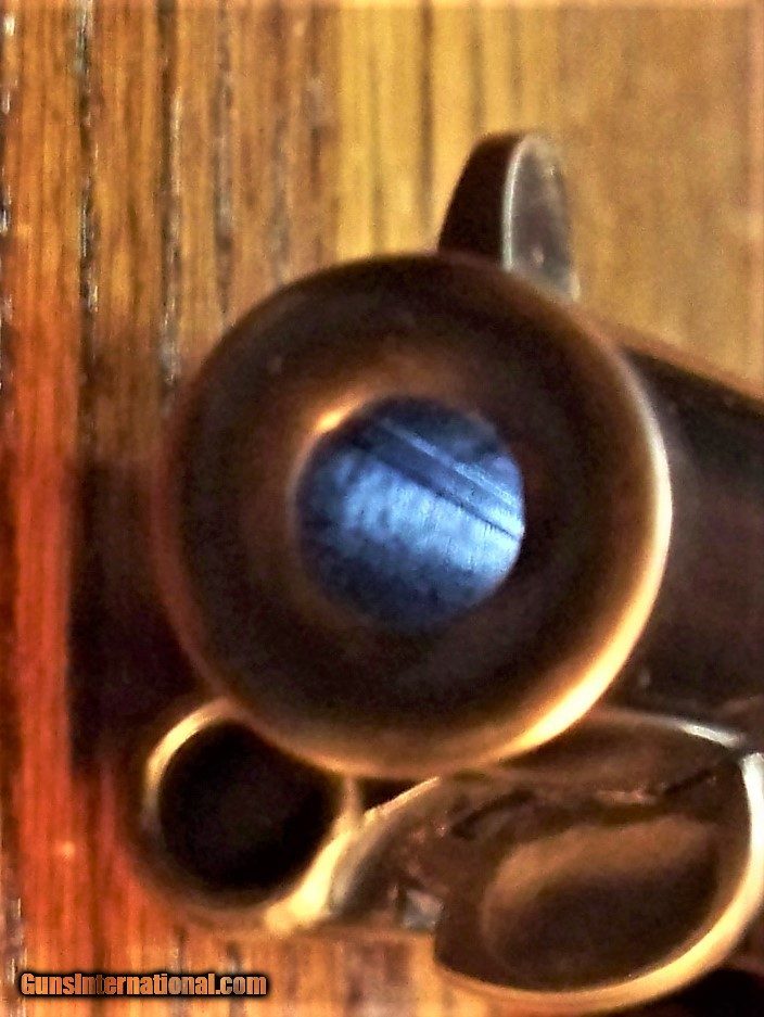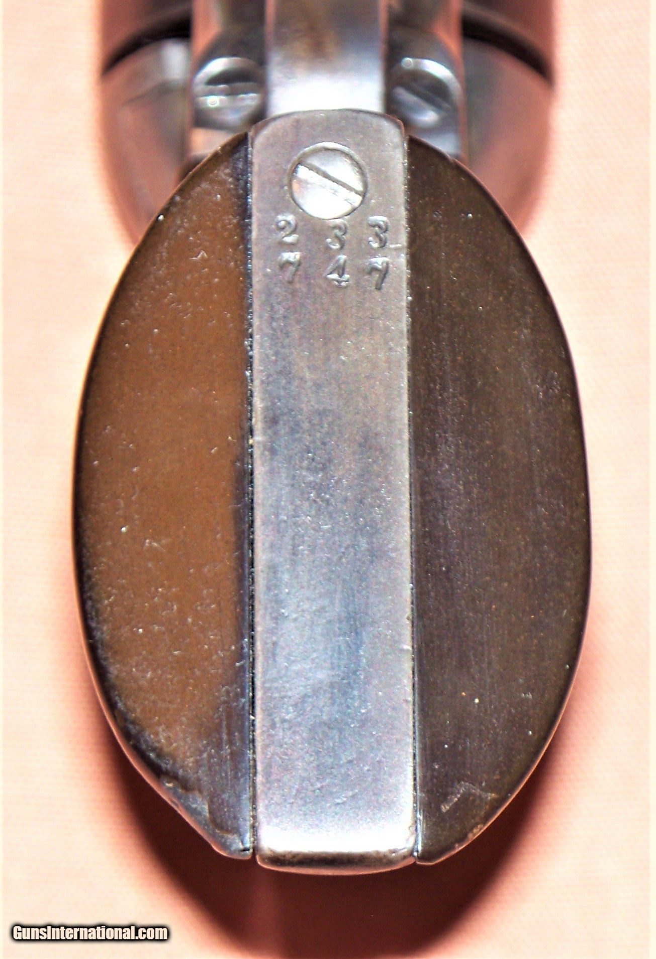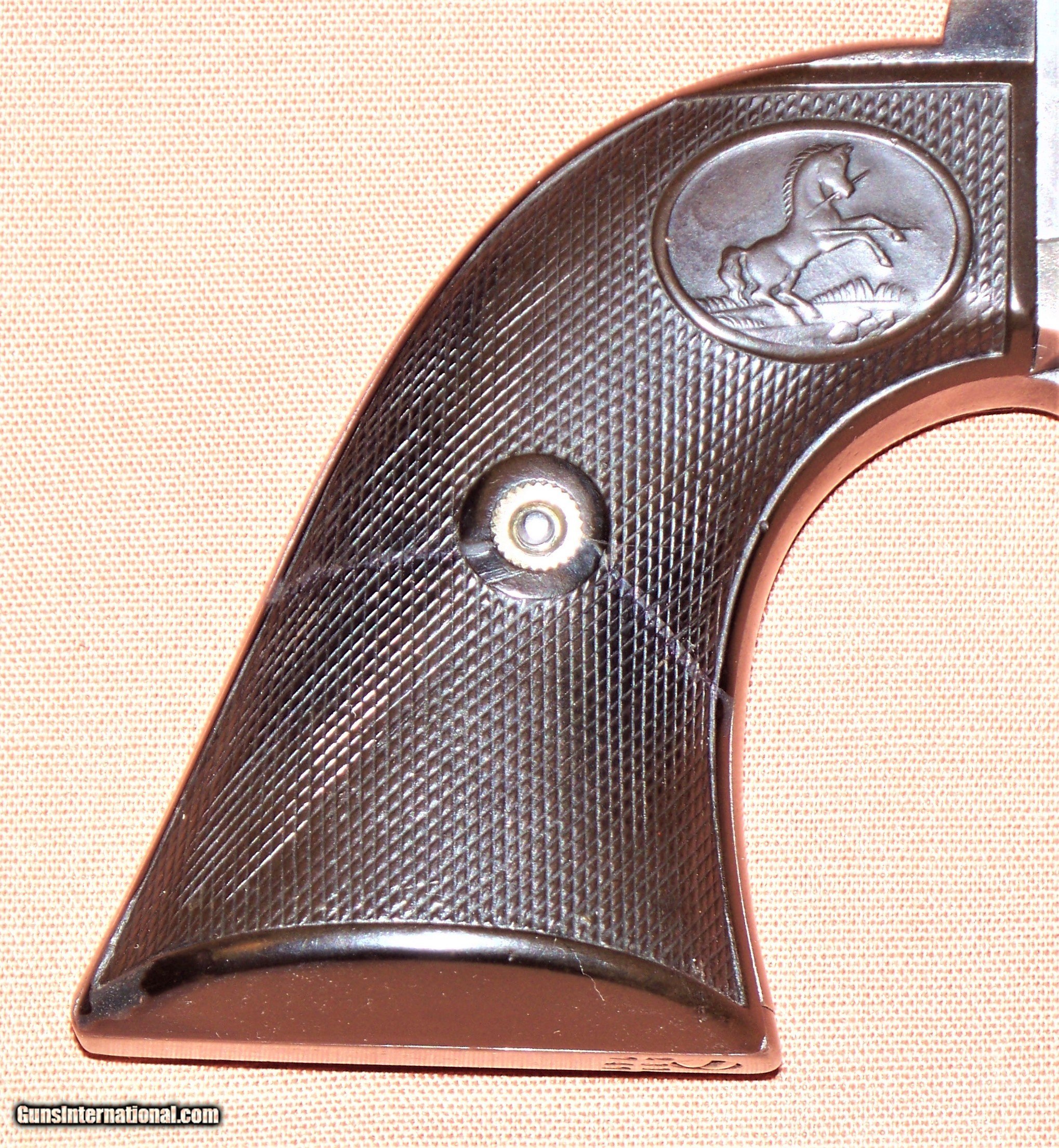 Description: This Colt Single Action Army revolver was shipped to Lee Hardware Company, Salina, Kansas, October 11, 1902, with 8 other guns (serial #233747). It is in .32 WCF (.32-20) and has a 5.5” barrel with hard rubber grips. It has all four clicks and three notches, locks up tight and has a very good bore. The barrel and ejector housing retain much of their original blue, with other blue parts bare or turning to patina. The frame is bare metal with no case color remaining. The right grip is sound, but has been mended. The Colt is housed in a ‘20’s or ‘30’s holster made by H. H. Heiser, Denver, Colorado in very good condition. Shipping is $75.00, Priority, insured. SOLD Curio/Relic: Yes Handgun Caliber: .32-20 Winchester (.32 WCF, .32-20 Marlin, .32 Colt Lightning ) Manufacturer: Colt Model: SAA Serial Number: 233747 Barrel Length: 5.5 |