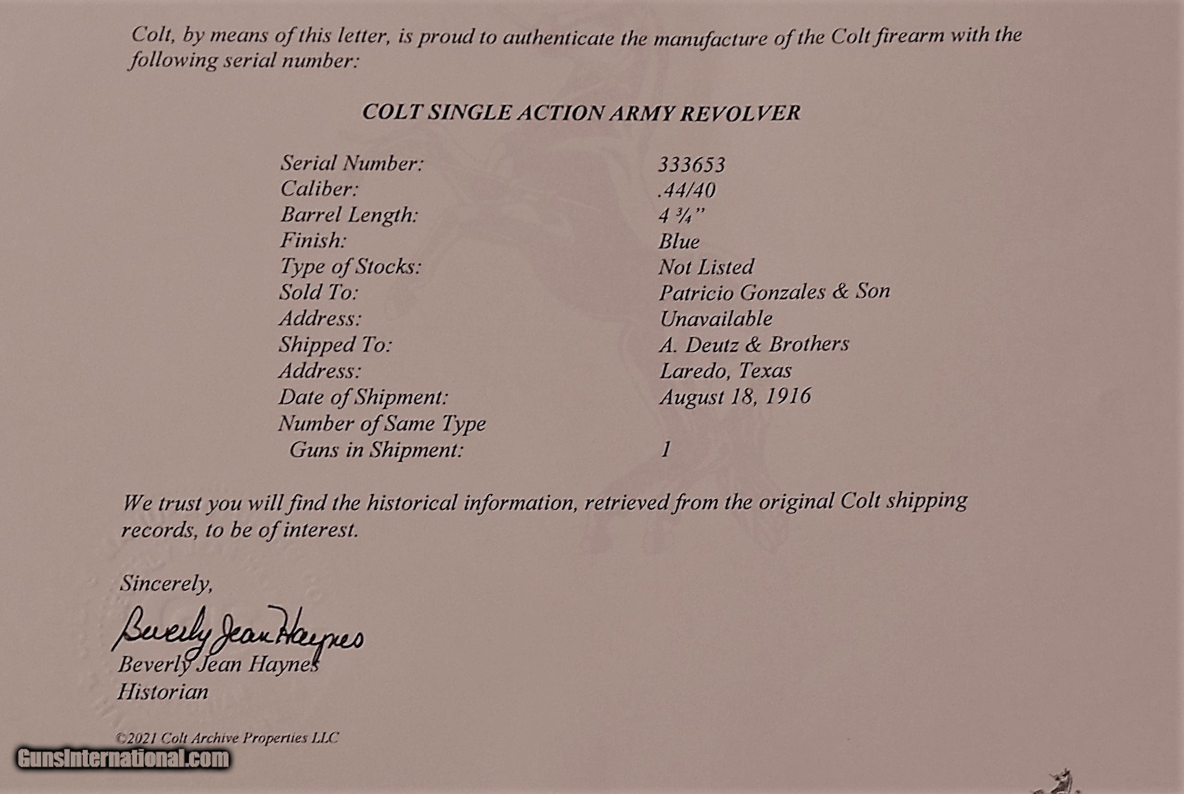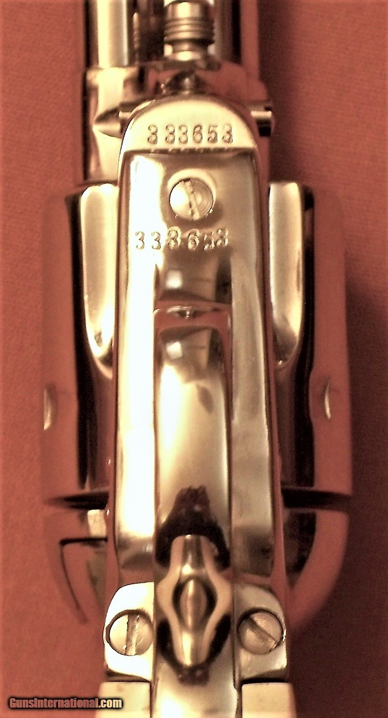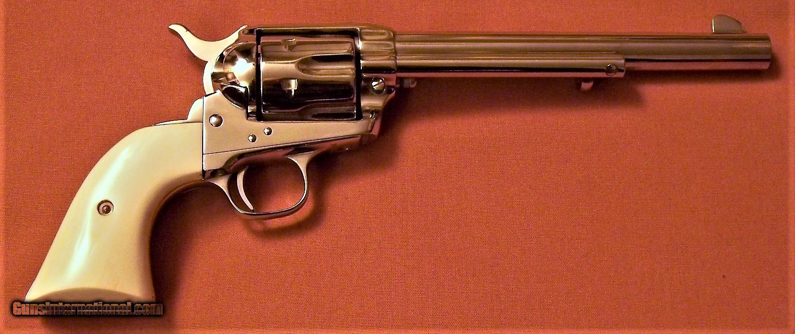 Description: This Colt Single Action Army revolver was shipped August 18,1916 (serial #333653). It has a 7.5” barrel, is a Frontier Six Shooter (.44 WCF or .44-40) and has been refurbished at some point, with the barrel length changed, and is now nickeled. It now has well fit, two-piece elephant ivory grips. It was shipped as a 4.75" barrel, .44-40, blue and case, to A. Deutz & Brothers in Laredo, Texas, specifically to a Patricio Gonzales & Son, as a single gun shipment. This would lead one to believe it was originally destined for somewhere south of the border. It is housed in a dark wood case, lined in red satin, with a Colt Manufacturing plaque on the outside top and a vintage Colt inner top label. The gun appears to be rarely turned and never fired since the re-finish. The bore is near mint. Four clicks and lock up is good. There is no 3 Day return policy. Look at the pictures, read the description carefully and ask questions. We accept returns only if we have misrepresented an item. Our prices reflect a 4% discount for cash or certified funds (Cashier’s Check, USPS Money Order – no Western Union or other type money order). Credit card payments do not receive this discount. We can take VISA or MasterCard and will consider trades for U.S. gold and silver coins at spot value. Contact information can be found by Googling Columbia Precision (tang sights). Prices are generally firm, but some trades are excepted for partial payment. Cashier's Checks are the preferred method of payment, USPS Money Orders, 2nd choice. Personal checks are held for two weeks, and discouraged. No PayPal. Foreign sales are possible with proper age, payment (usually credit card) and shipping arrangements. We will ship to California (which is almost a foreign country!) Layaway is possible for items priced over $2000, with payments including 1/3 down, 1/3 at 30 days and final payment with shipping at 60 days. Card fees are 4% with VISA and MasterCard preferred. Shipping is generally USPS Priority, insured. Shipping amounts quoted may be changed to the exact cost if requested, and overseas shipping will be charged on specific individual item shipping cost. With two partners, I own Pawnee Sportsmens Center LLC, near Fort Collins, Colorado. We have rifle/pistol ranges, 1000-yard range, 3-gun, cowboy action shooting, trap and skeet, and upland game bird hunting. SOLD Curio/Relic: Yes Handgun Caliber: .44-40 Winchester (.44 WCF) Manufacturer: Colt Model: SAA Serial Number: 333653 Barrel Length: 7.5 |