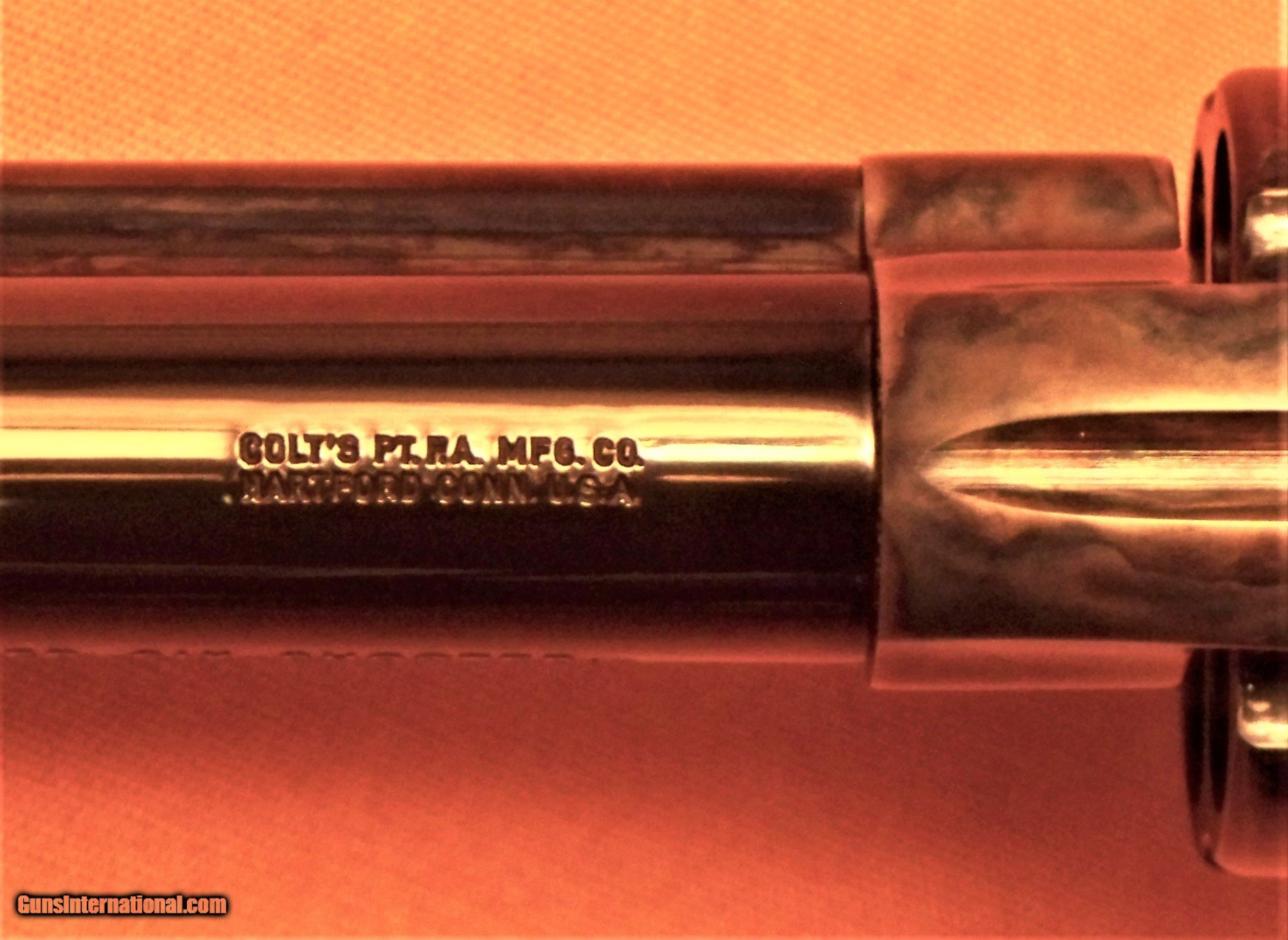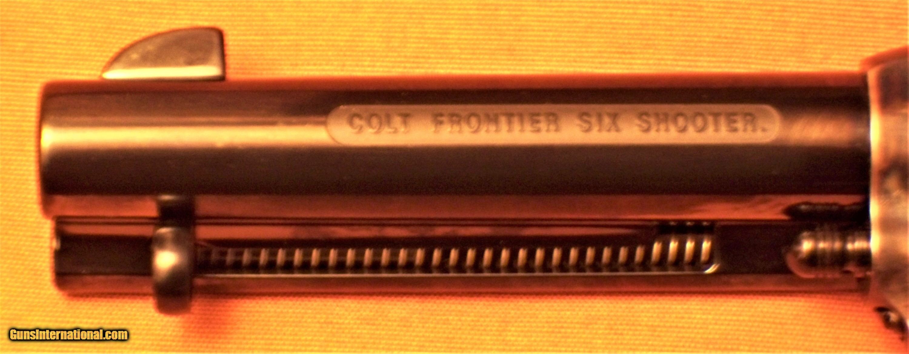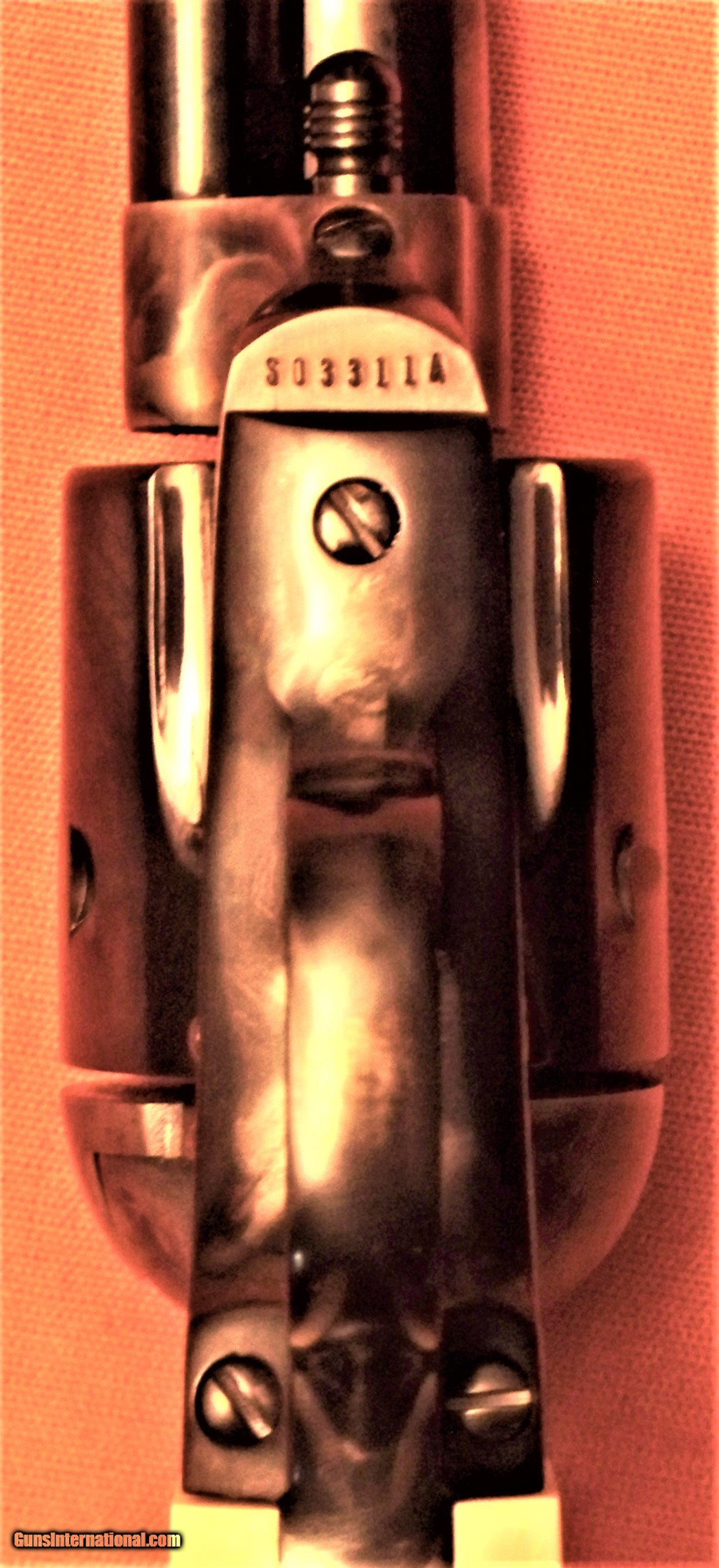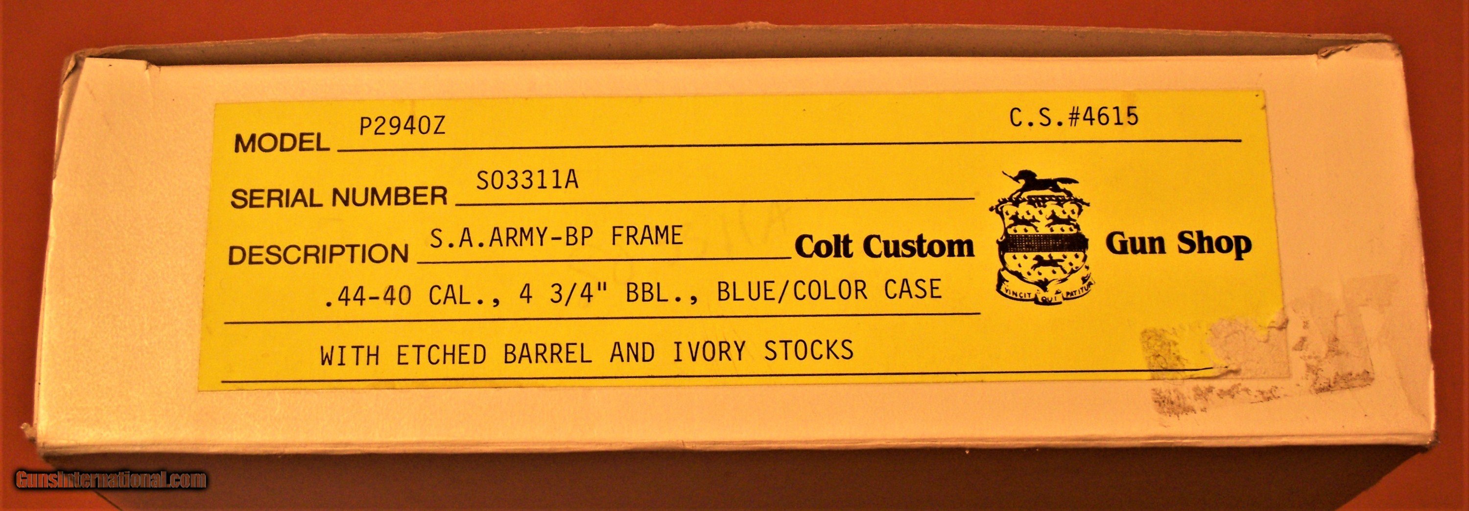 Description: This is a 3rd Generation Colt Single (SAA) Army revolver made in the Custom Shop 1993 (serial #S03311A). It is a Colt Frontier Six Shooter (.44-40 or .44 WCF) with 4.75” barrel, blue and case colored black powder frame, etched panel on barrel, bullseye ejector rod and one-piece factory ivory grips. It is New-in-the-Box, unturned and unfired, with all original papers, blue Custom Shop box in white sleeve cover, with the original factory label for this specific gun. Part of what makes this gun relatively rare is the etched panel on the left side of the barrel, rather than a standard roll die or caliber designation. Most etched panel guns came out between 2008 and 2010 (blued guns only produced for one year – discontinued in 2009). From my research I discovered some etched guns were made possibly as early as 1983 on special order, and another group made for distributor Lew Horton in early 1993. Serial numbers of these 200 or so guns may have had an extra “C” added before the SA in the serial prefix. Colt announced at some point after 2010 that they would not make the etched panel guns again to “,,,protect the investment of those who bought them…”. Most, if not all, etched panel guns had black powder frames (single base pin retaining screw in front rather than the spring-loaded cross release pin design). Shipping is $100.00 Priority, insured. SOLD Handgun Caliber: .44-40 Winchester (.44 WCF) Manufacturer: Colt Model: SAA Serial Number: S03311A Barrel Length: 4.75 |