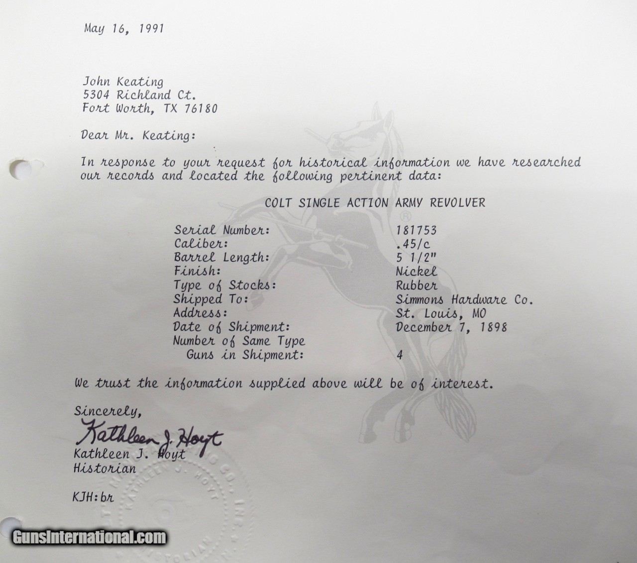 COLT 45 SINGLE ACTION ARMY REVOLVER from COLLECTING TEXAS – MADE 1898 – FACTORY LETTER