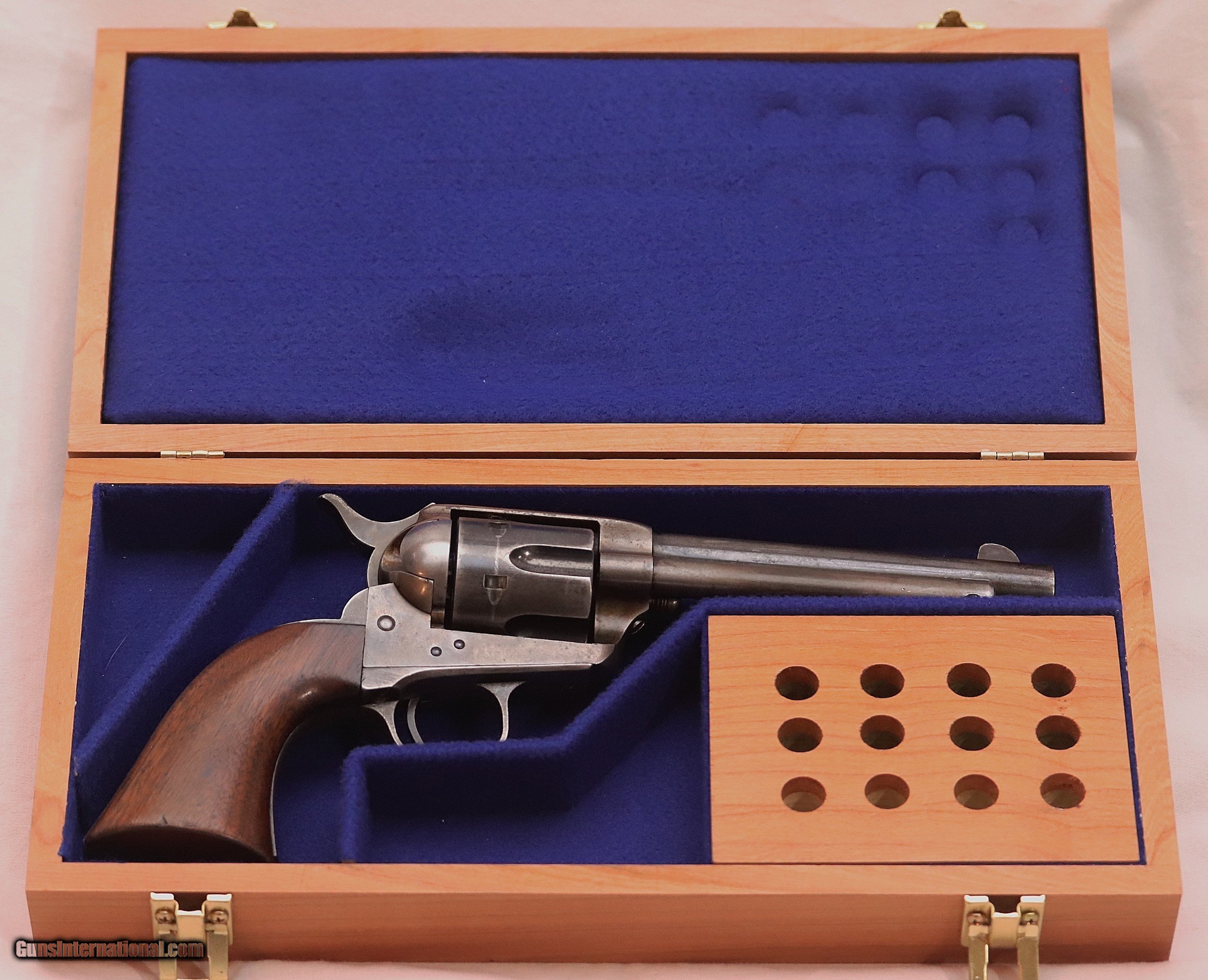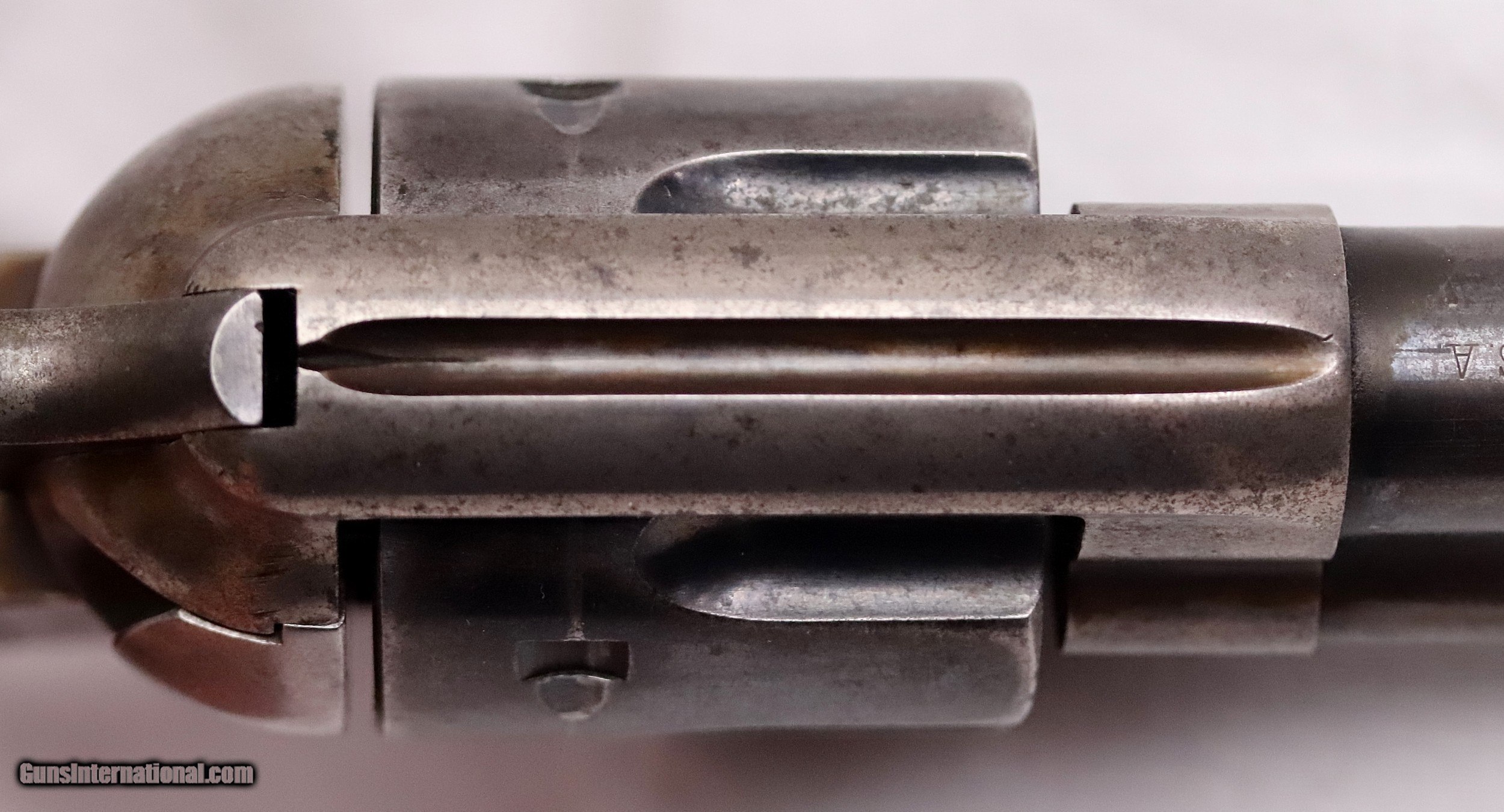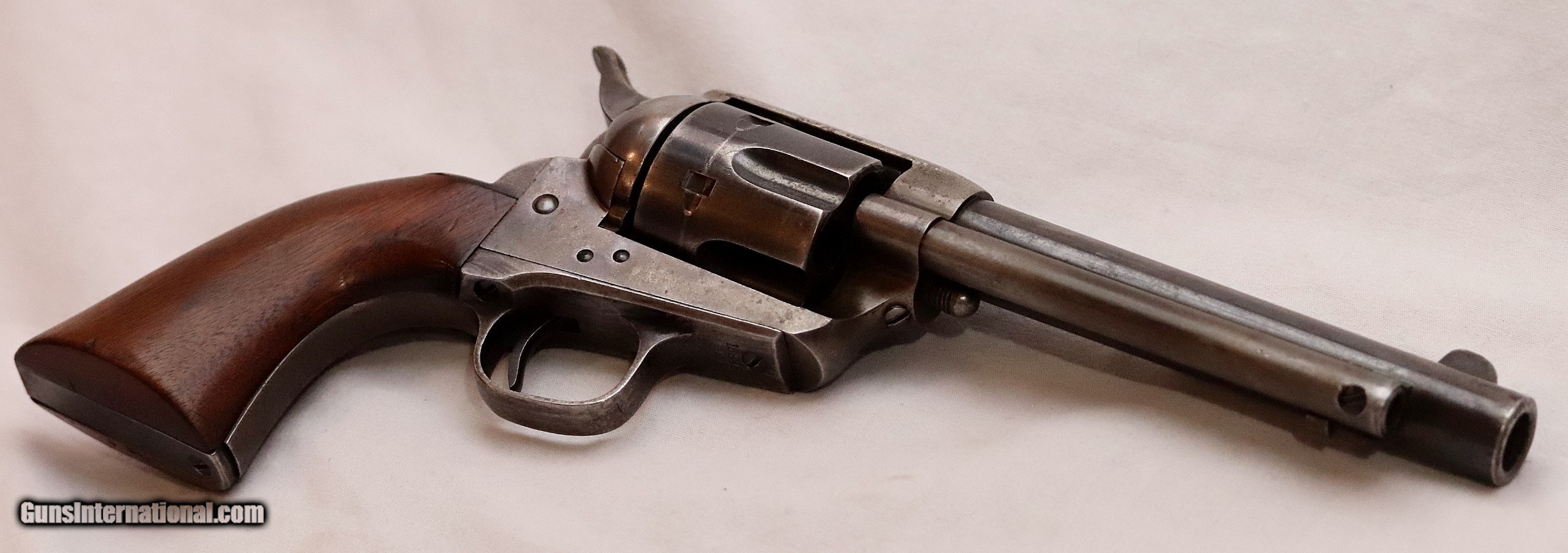 Description: This Colt Artillery Single Action Army Revolver retains much of it’s period finish with only a few spots of corrosion. The frame has nicely faded color case hardening still visible. The bore is mostly clean and un-pitted with the exception of one corrosion spot mid-way. It has sharp deep rifling and shows little use. Kopec reports that the inside chambers of the cylinders retain all of their originally applied blue finish indicating that this revolver had not been appreciably fired at all. The rear of the cylinder is marked R.A.C. The grips are excellent with just a bit of age showing and R.A.C. marked on the bottom. The action is smooth and strong with good lock up. Controversy arises when you review the two Letters. The Colt Letter must have been based upon a verbal request because it provides information on the only serial number,16848 marked on the trigger guard. It shows it to be Shipped to U.S. Commanding Officer, Manila P.I. in 1901. Colt’s records are based upon the number marked on the frame. As we know these revolvers had all of their parts mixed during refurbishing. This frame has no serial number and the Patent dates are listed on 3 lines rather than the more common 2 line format. This Three Line frame is one of 104 manufactured from 1878 to 1889. These “No-Number” frames did NOT have the U.S. stamped on them. After studying both letters I’ve come to the conclusion that this is either assembled from parts as Kopec suggests or a “No-Number” artillery that has had some up-grades over the years. In either case, it presents as an excellent example of a Colt Artillery. This is a great addition to any Colt or Military Collection or a fantastic accent piece for your office or den. Serial number 16848. Cal. .45 Colt with a 5 ½” barrel. It will be shipped with both letters and the custom presentation case as shown. Antique Firearm. Antique firearms, pre 1899 do not require a Federal License. For purchase, a copy of a Government Issued Identification (Drivers License, Etc), showing date of birth and current address will be required. Beaver Creek Arms TERMS & CONDITIONS Objective: As a collector of 35 years and Licensed Firearms Dealer since 1989 I have a clear definition of a satisfactory transaction. I will be paid as we agreed to, and you will be satisfied with your purchase. My goal is to establish a client list of satisfied repeat customers who will recommend me to other collectors. It’s just that simple. Exiled Saudi princes with secret funds needing change from an over paid purchase need not apply. Notice: ALL Federal, State, & Local firearms laws will be followed. I will take NO shortcuts in the process of a legal sale or transfer, so please don’t ask. SHIPPING: Shipments are made via U.S.P.S. Priority Mail, Insured, with a return receipt. Packing, Shipping and Insurance cost for a handgun is $40.00. Checks are to be made out to: Steve Clark Mailed to: 380 Beaver Creek Rd, Dillsburg PA 17019 Availability: All items are in stock and available for immediate shipment. Please call or email and an Item will be held up to a week with your Name, Address, & Phone Number. Items marked Reserved are being held for awaiting payment or on layaway. If you are interested in a reserved item, please call or E-Mail to be placed on a backup list. FIREARMS: Antique firearms, pre 1899 do not require a Federal License. For purchase, a copy of a Government Issued Identification (Drivers License, Etc), showing date of birth and current address will be required. GUARANTEE: Your complete satisfaction is assured, see objective above. If you are not satisfied, please contact me within 3 days of receipt. Please don’t fire the weapon, safety, function and accuracy are NOT Guaranteed. Any weapon offered by Beaver Creek Arms is never test fired nor is there any representation the gun is functional and safe to fire. These guns are sold for collectors and only represented as used firearms that must be checked by a competent person, observe all the necessary safety precautions prior to attempting to load and fire one of these weapons RETURNS: Returns must be made within 3 days of receipt. They must be received in exactly the same condition with no parts exchanged. If it has been altered, damaged, or fired, a refund will not be made. Packing, shipping and insurance cost will not be refunded. All layaway purchases are returnable for merchandise credit only. PAYMENT: Bank check, Personal check, and Money Orders are preferred. Visa and MasterCard are accepted with a 3% processing fee. For Visa and MasterCard orders please provide the account number, code number, expiration date, name on card, phone number and card billing address. This information can be phoned in, or E-Mailed. All orders must be paid in advance, C.O.D. orders are not accepted. Checks, both Bank and Personal must clear before the order will be shipped, usually a 2 week delay. LAYAWAYS: A 20% deposit is required. Balance is due in 60 days. Deposits are non-refundable and are forfeited after 60 days. Layaway sales are returnable for merchandise credit only. SALES TAX: Pennsylvania state sales tax is 6% for in state purchases. The payment of other states sales tax, if applicable, for shipped items is the buyers responsibility. DISCREET: Client information will remain Confidential. Your privacy is protected. SOLD Antique: Yes |