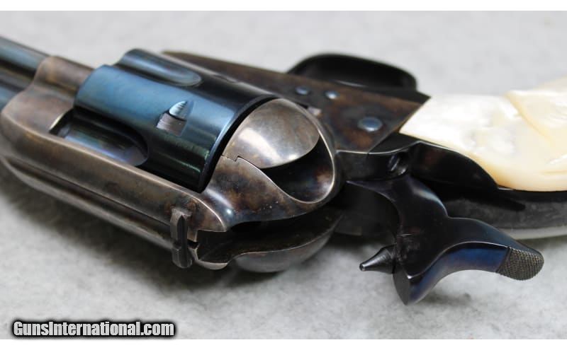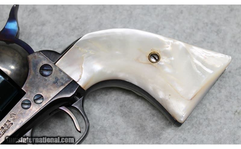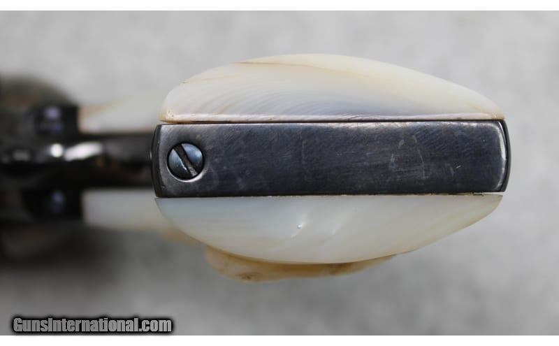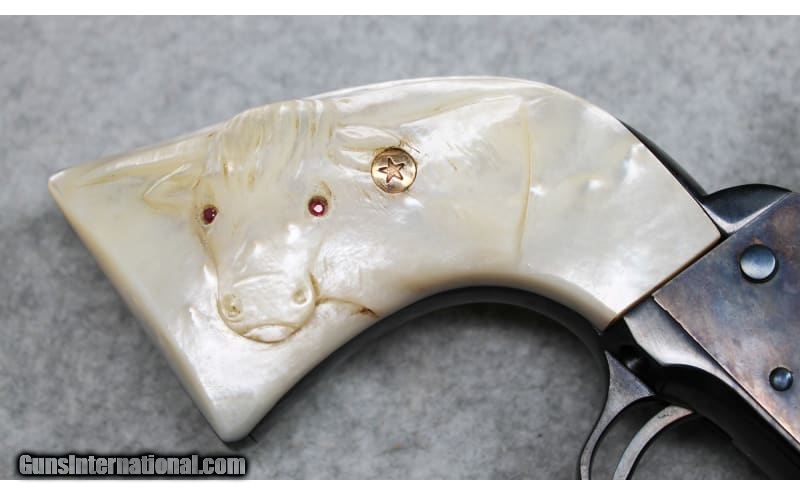 Description: Colt Single Action Army revolver chambered in .45 Colt. The serial number indicates that the revolver was produced in 1927. Customized by a previous owner to add custom sights, cylinder pin and hammer canted to the left for a right-handed shooter. Includes an extra cylinder, possibly chambered in .45 Auto Rim. .45 Long Colt SOLD Curio/Relic: Yes Metal Condition: Very Good with Minor Handling Marks Bore Condition: Bright and Clear with Good Rifling Barrels: 5 inch Butt Pad: Pearl grips with steerhead carving Weight: 2 lb 8 oz Sights: Front bladed sight Item Location: Fort Worth, TX |