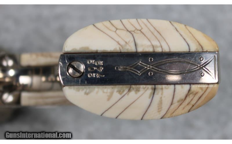 Description: Engraved Colt Single Action Army revolver chambered in .4h WCF (.44-40 Winchester). The serial number (202742) indicates that the revolver was manufactured in 1900. Features include a 5-1/2 inch nickel-plated barrel and frame with checkered grips. In overall very good condition, the revolver appears to have been professionally restored and engraved at some point. .44-40 Winchester SOLD Curio/Relic: Yes Metal Condition: Excellent with Minor Handling Marks Wood Condition: Good with Handling Marks and Wear Bore Condition: Clear with Light Pitting and Frosting Barrels: 5.5 inch Butt Pad: Checkered Weight: 2 lbs 4 oz Item Location: Fort Worth, TX |