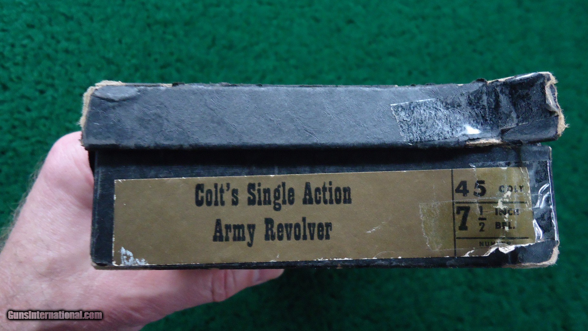 Description: 7-1/2 inch barrel marked "38 W.C.F." on the left side. Bright shiny bore. Matching numbers on the frame and under grips on the right side of the trigger guard. Left Side of the trigger guard has a "1" and a Colt factory proof triangle. Barrel has a good amount of thinning blue. Good case color on the hammer and frame. Cylinder is a replacement as well as the checkered walnut grips with Colt medallion. Excellent mechanics. Nice looking Colt SAA that was made in 1929. Comes with a black Colt box that is not numbered to the gun. Leroy Merz Antique Firearms specializes in antique and vintage Winchesters and other fine American firearms. Since 1965 Mr. Merz has taken part in the world of firearms and has been a contributor to many well known reference books. We have hundreds of additional guns in every price range at our home online. Search for Merz Antiques in google. SOLD Curio/Relic: Yes Rifle Caliber: .38-40 Winchester |