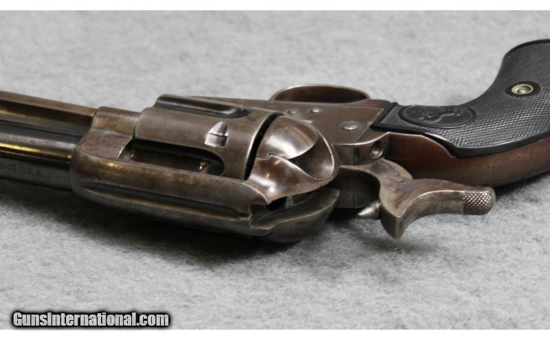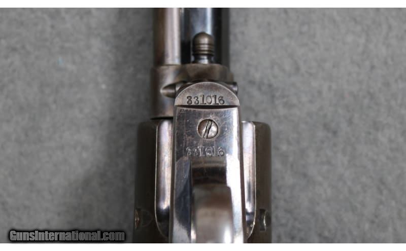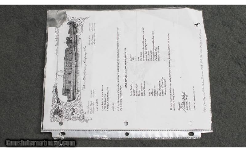 Description: Colt First Generation Single Action Army revolver chambered in .45 Colt. Rare variant fitted with a double action long flute cylinder of which Colt only assembled 1,478 total between 1913 and 1915. Matching serial numbers on frame, trigger guard, and butt. Includes a factory letter confirming configuration and shipment to George Worthington Hardware Company in Cleveland, Ohio on 21 October 1914. Barrel appears to be slightly bulged ahead of the ejector housing. .45 Colt SOLD Curio/Relic: Yes Metal Condition: Good with Handling Marks and Finish Wear; Refinished Cylinder; Dings on Butt Wood Condition: Very Good with Minor Handling Marks Bore Condition: Bright And Clear with No Pitting Barrels: 7.5 inch Item Location: Fort Worth, TX |
