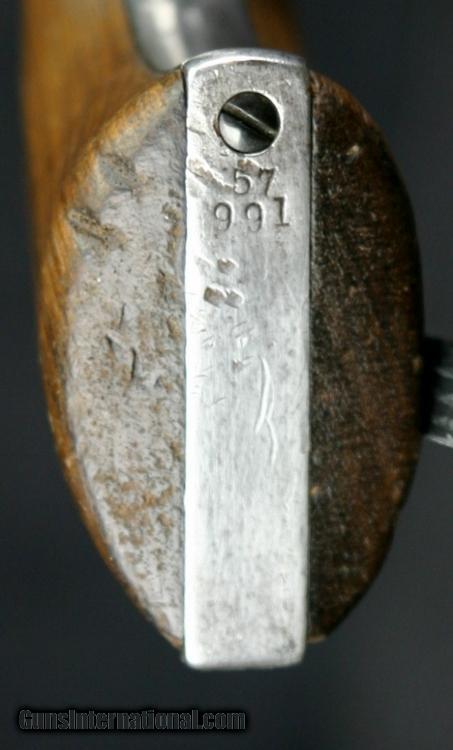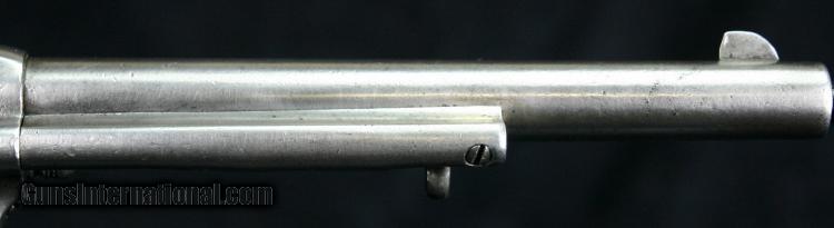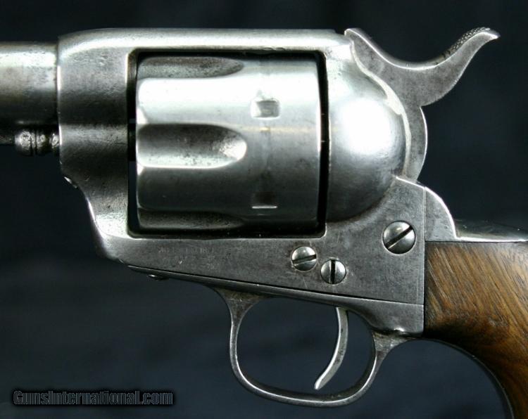 Description: .44-40, 7 1/2 inch barrel, very good bore with black powder oxidation, silvery gray over all with the usual amount of oxidation near cylinder/barrel junction, very light but un-molested etched pannel, grips are slightly under sized, mechanically tight, markings light, 1879. SOLD Antique: Yes |