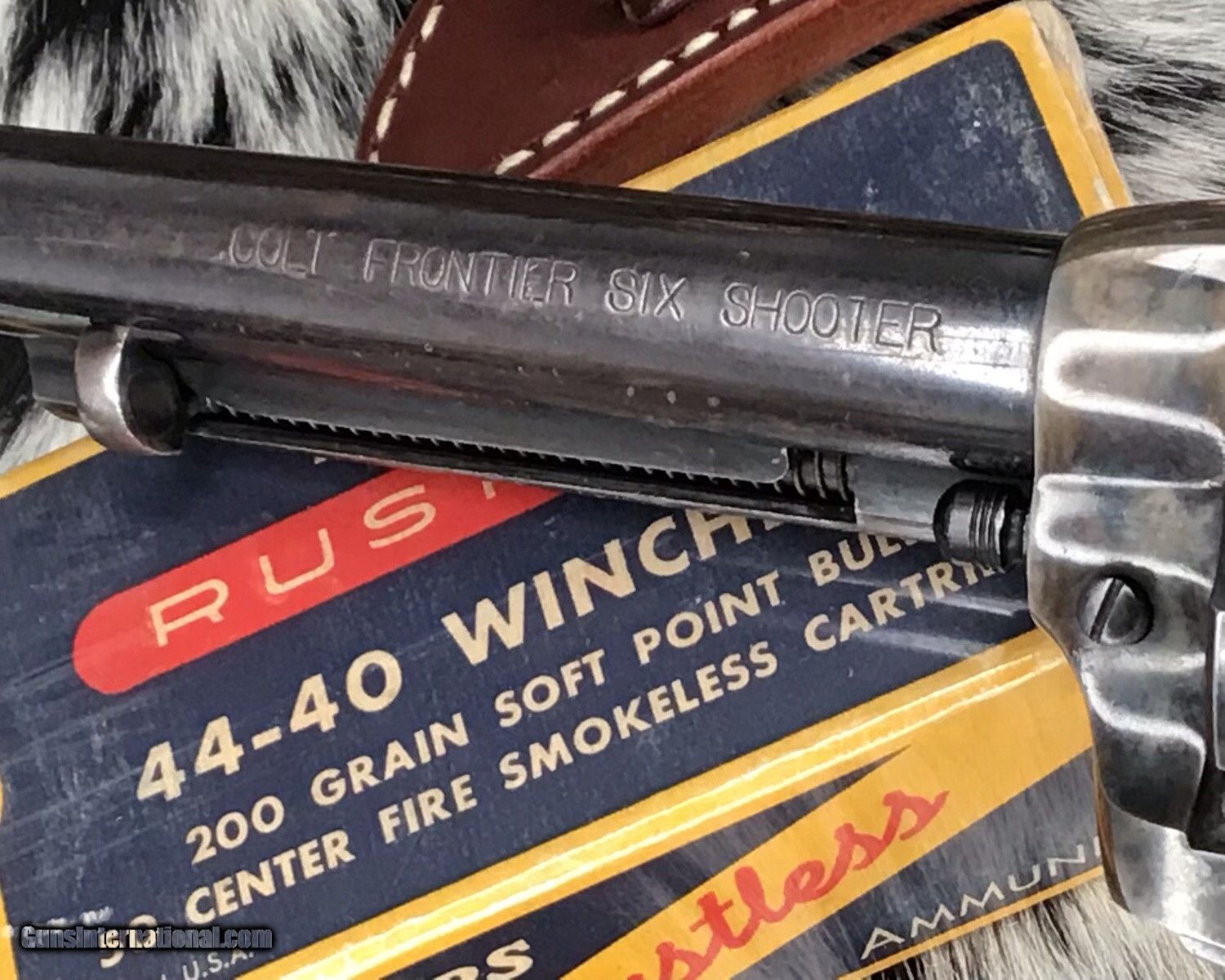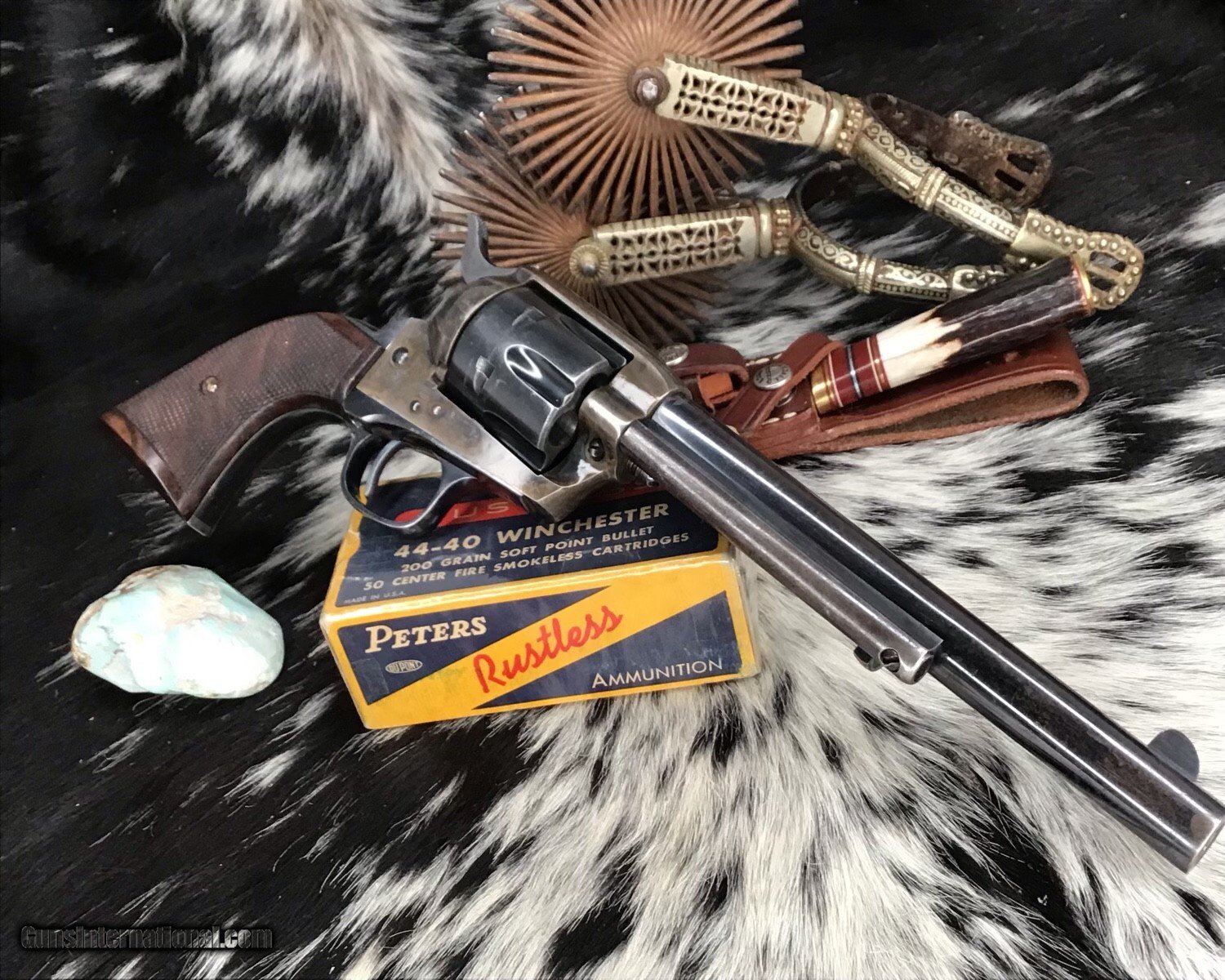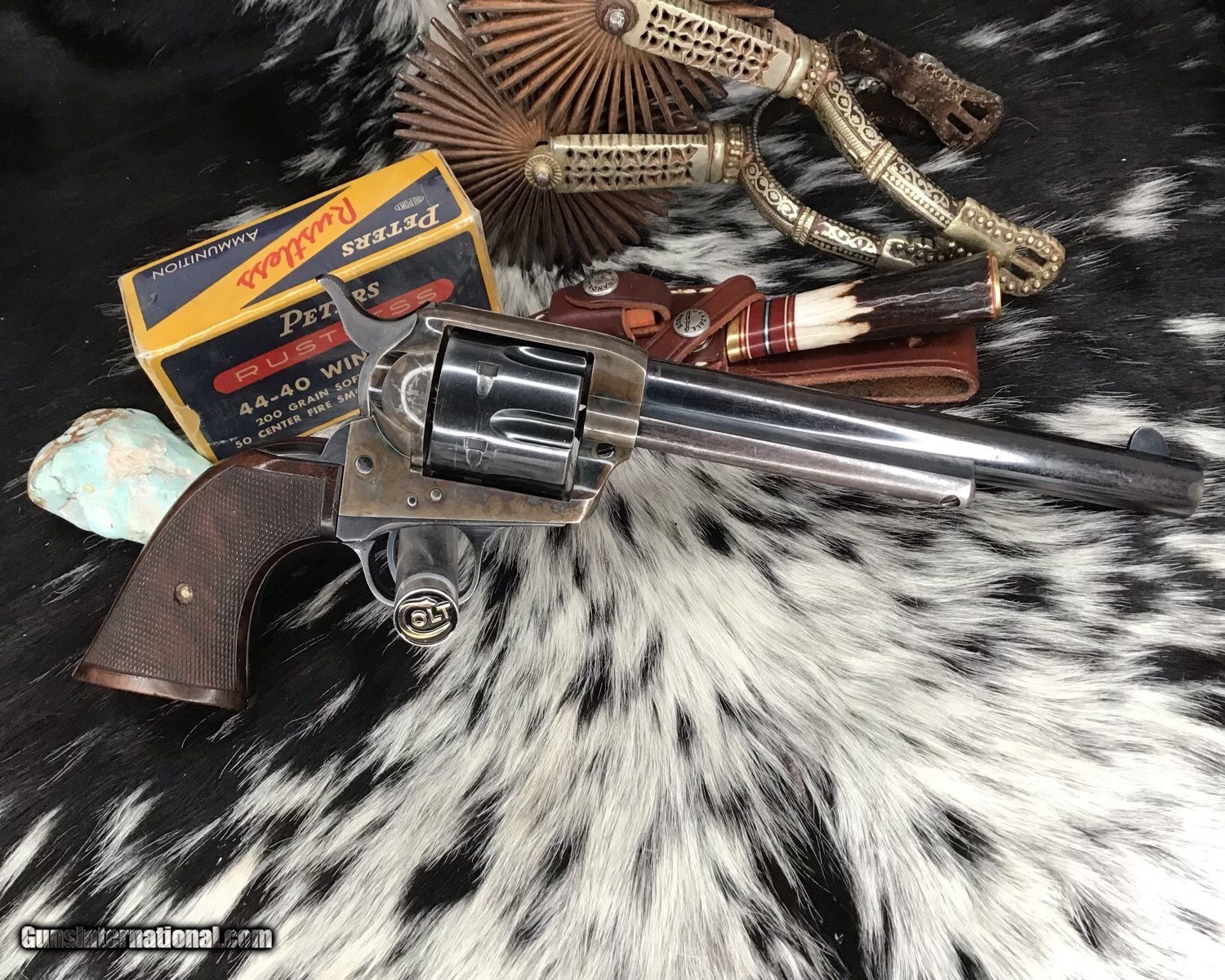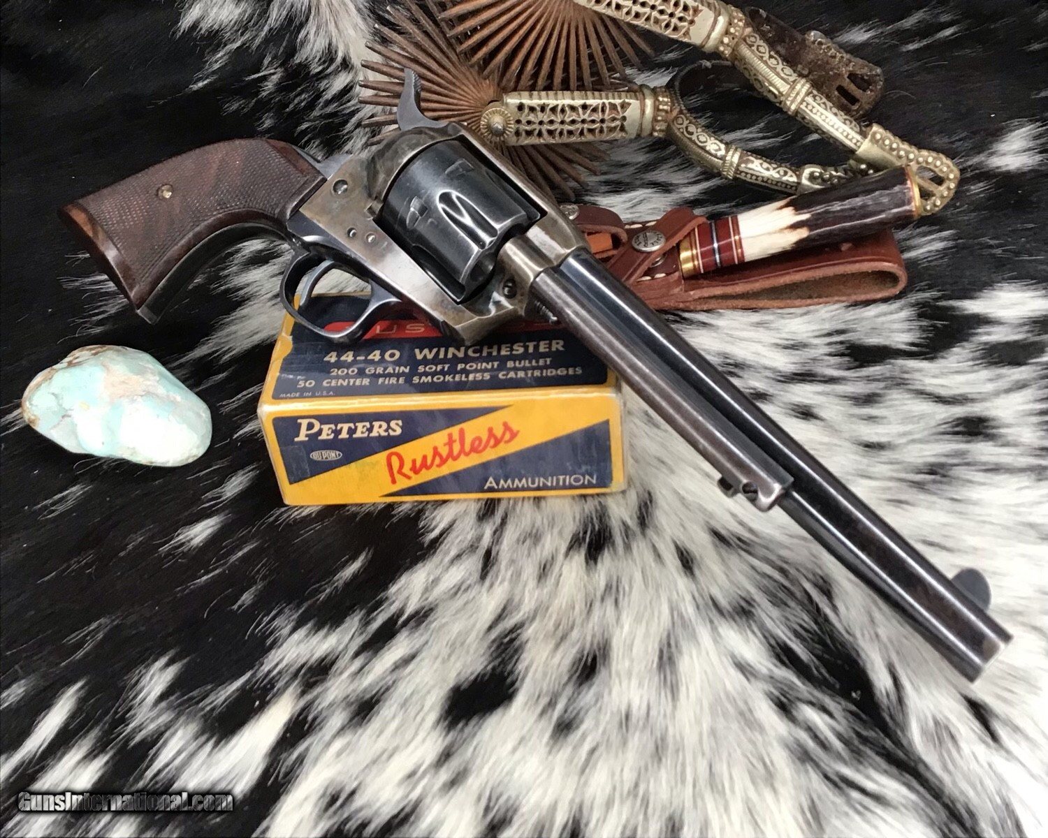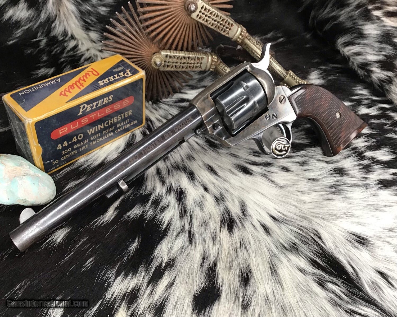 Description: 1921 first generation vintage Colt Frontier Six Shooter single action revolver, serial number 337659. 7 - 1/2" round barrel chambered in .44-40 WCF , single line Colt Hartford, CT barrel address. 2 piece vintage checkered walnut grips. Screws are in good condition and not buggered. Accompanied by a factory letter indicating shipment as a blue .44-40 7 - 1/2" gun with wood grips sent to J.A. Johnston, 529 Smithfield Street, Pittsburgh, Pennsylvania, C/O George P. riggs, in a shipment of 1 sent February 23rd, 1921.Barrel has turned to a blue brown patina with scattered handling marks. Frame has good case colors remaining. cylinder retains a vast majority of its original blue. Action works well with strong lockup and four clicks. Numbers match and comes with Colt factory archives letter shown in photos. Good bore with strong rifling. A very good looking and functioning Colt Single Action Army first generation revolver in the desirable old west 44/40 chambering. This Colt will give years of shooting enjoyment, or find a nest in your safe. Add 3% if paying with credit card. God Bless America from a proud American, and a Viet Nam Vet , thankful for our freedoms.. paid for by the Blood ,Sweat and Tears of our brave men and women in uniform. Ten Below Firearms is a Veteran owned and operated business. We specialize in out of production models of high quality firearms. We love to ship! If you are out of state or can't make it to our store, just give us a call! Handguns normally ship for $30 and Long guns for $40 to $55 for extra length long guns. That's 2-3 day USPS Priority shipping, Delivery conformation and with tracking number. Optional Postal insurance is additional $1.50 per $100 and highly recommended. We are OPEN BY APPOINTMENT ONLY FOR SHOP VISITS. SOLD Curio/Relic: Yes Handgun Caliber: .44-40 Winchester (.44 WCF) Manufacturer: Colt Model: SAA Serial Number: 337659 Barrel Length: 7.5 inch Condition: Very good Metal Condition: Very good Wood Condition: Very good Bore Condition: Very good Action: Single action Finish: Blued/case colored Manufacture Date: 1921 |