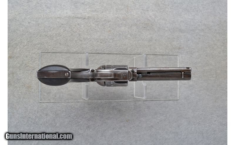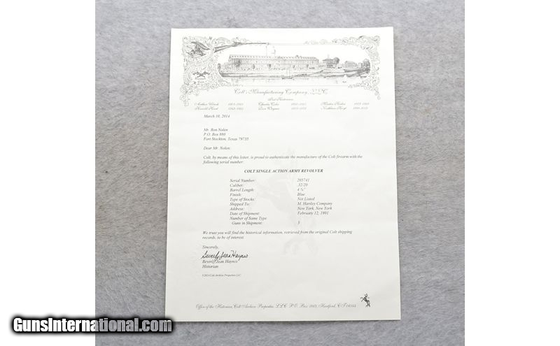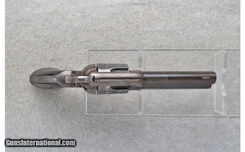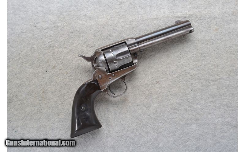 Description: This Colt Single Action Revolver model is a 6 shot handgun in .32 WCF Cal. It has a 4.75 inch barrel. A blade front sight and an integral notch rear sight. The grip is a worn checkered dark brown Bakelite with an Eagle and the Colt horse logo. The hammer spur is checkered. Serial Number 205741. It comes with a Colt's Manufacturing letter. .32 WCF SOLD Chambers: 6 shot fluted cylinder. Metal Condition: Fair. Has patina. No bluing left. Some light handling marks and light pitting. Freckling. Bore Condition: Good. Barrels: 4.75 inch barrel. Triggers: Single Action. Weight: 42 oz. Sights: Blade front. Integral notch rear. Item Location: Richfield, WI |
