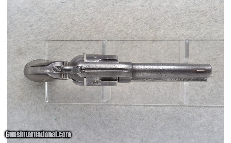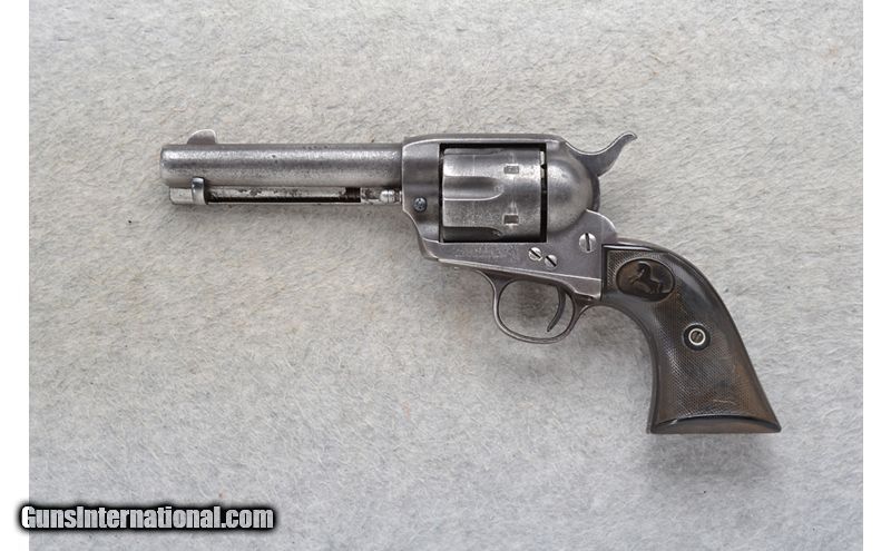 Description: This Colt single action revolver model is a 6 shot pistol in .38-40 WCF Black Powder Cal. It has a 4 5/8 inch barrel. A blade front sight and an integral notch rear sight. The grip is a checkered dark brown Bakelite with the Colt horse logo and shows some wear. The hammer spur is checkered. Serial Number 311953. .38-40 WCF SOLD Chambers: 6 shot fluted cylinder. Cylinder is a little loose. Metal Condition: Fair. Has some light pitting. No bluing left. Bore Condition: Fair. Light pitting. Barrels: 4 5/8 inch. Triggers: Single Action. Weight: 38 oz. Sights: Blade front. Integral notch rear. Item Location: Gonzales, LA |