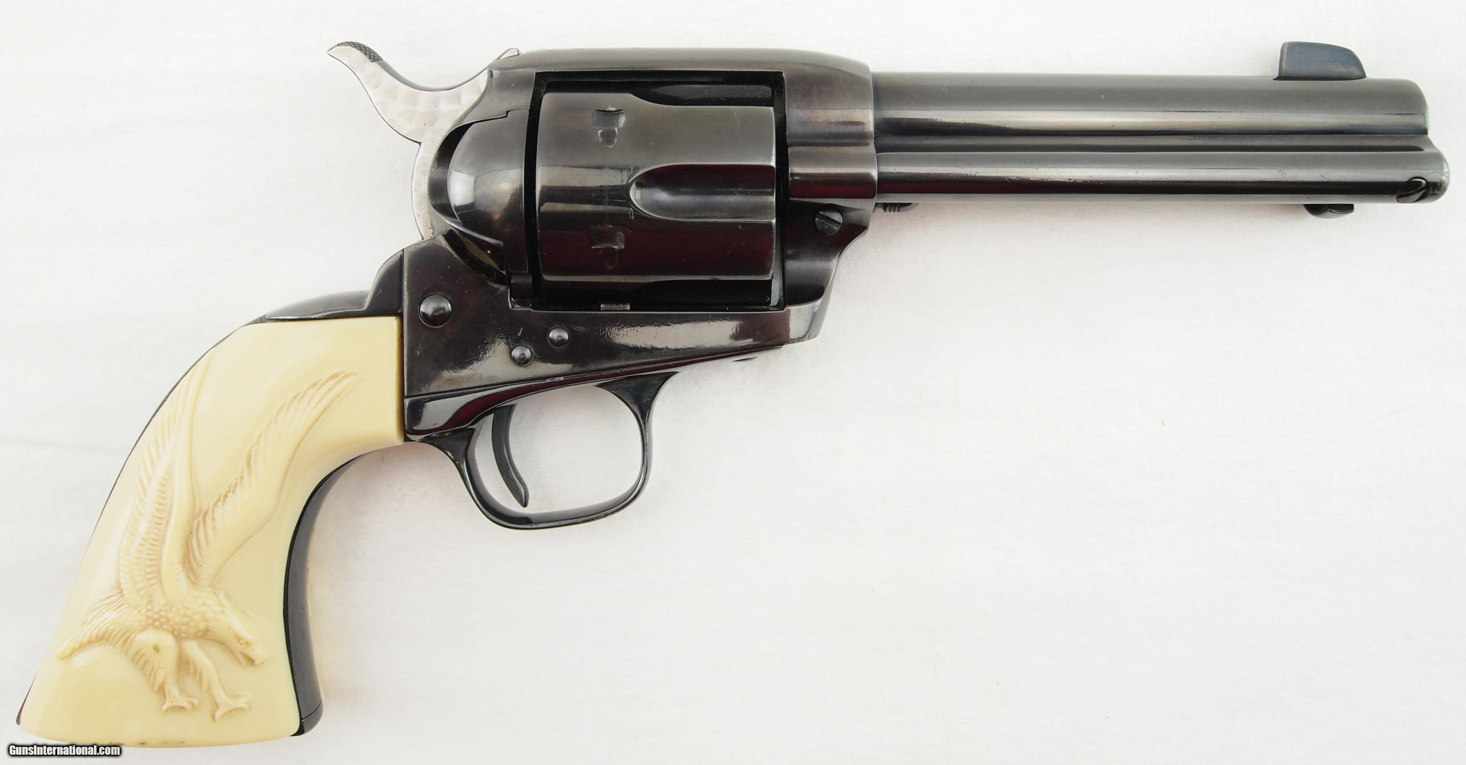 Description: Colt, SAA 1873 MFG 1920, .38 WCF, 4 3/4" bbl, shiny bore, good rifling, has been professionally refinished, jeweled hammer, matching numbers, and has simulated ivory grips with an eagle on each. Add 3% for Credit Card Shipping $25.00 SOLD |