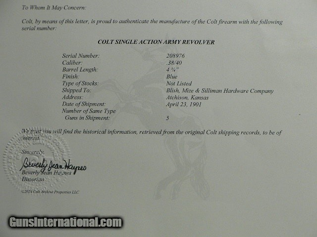 Description: ---------------SOLD----------------- Colt SAA 1901 Colt Single Action Army 38 WCF 4 ¾” Barrel, this is a gray patina gun, Manufactured in Hartford Connecticut in 1901 it has colt two line barrel address and on the right side of the barrel is 38 WCF roll on the frame is two line patent address with horse in a circle all matching serial number. The screws are in excellent condition in excellent working condition comes with original one piece Ivory are nice old yellow grips that has HC carved into the grips just think this could stand for Hopalong Cassidy don’t know. The bore is good 8+ out of a 1 – 10 and 10 being the best with a little erosion. Comes with a factory letter shipped to Blish, Mize & Silliman hardware Company in Atchison Kansas April 23, 1901. Serial number 2089XX Shipping $50.00 SOLD Curio/Relic: Yes Handgun Caliber: .38-40 Winchester (.38 WCF) Manufacturer: Colt Model: SAA Barrel Length: 4 3/4 Chambers: 38 WCF Condition: Good |
