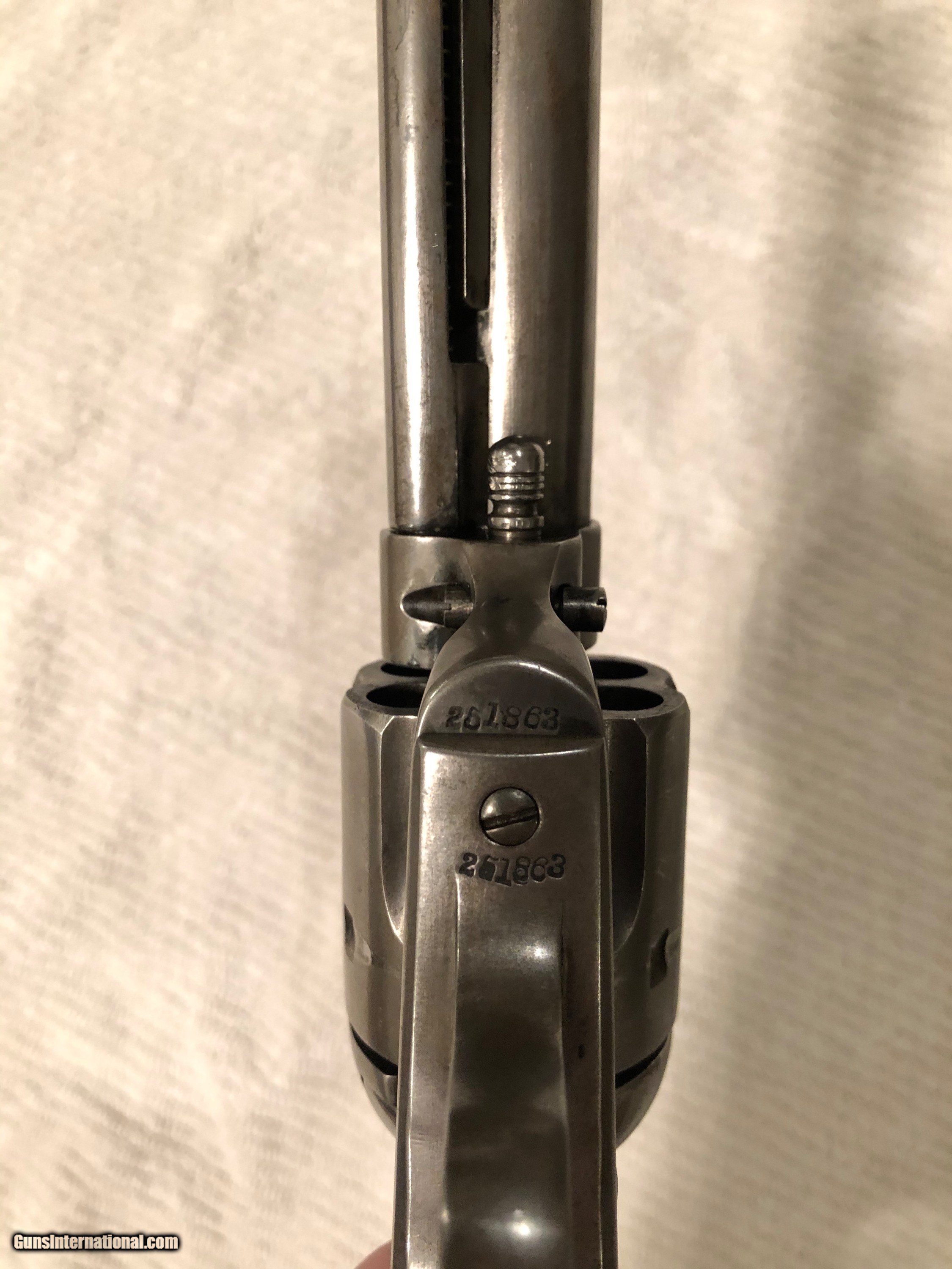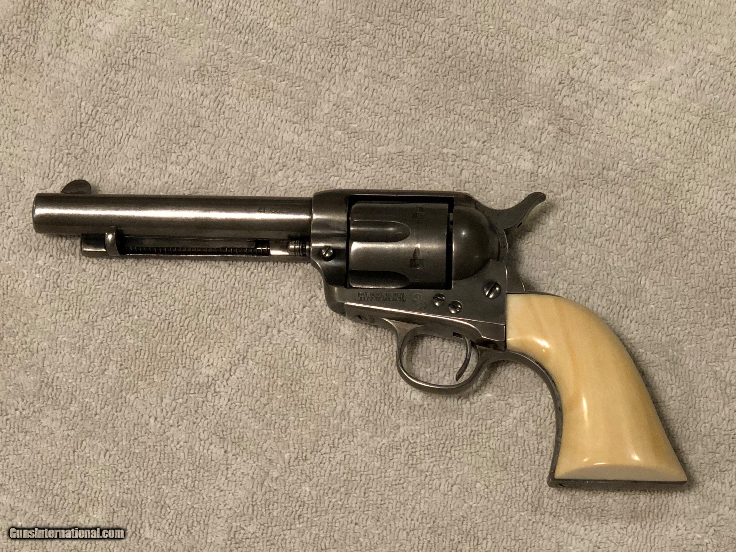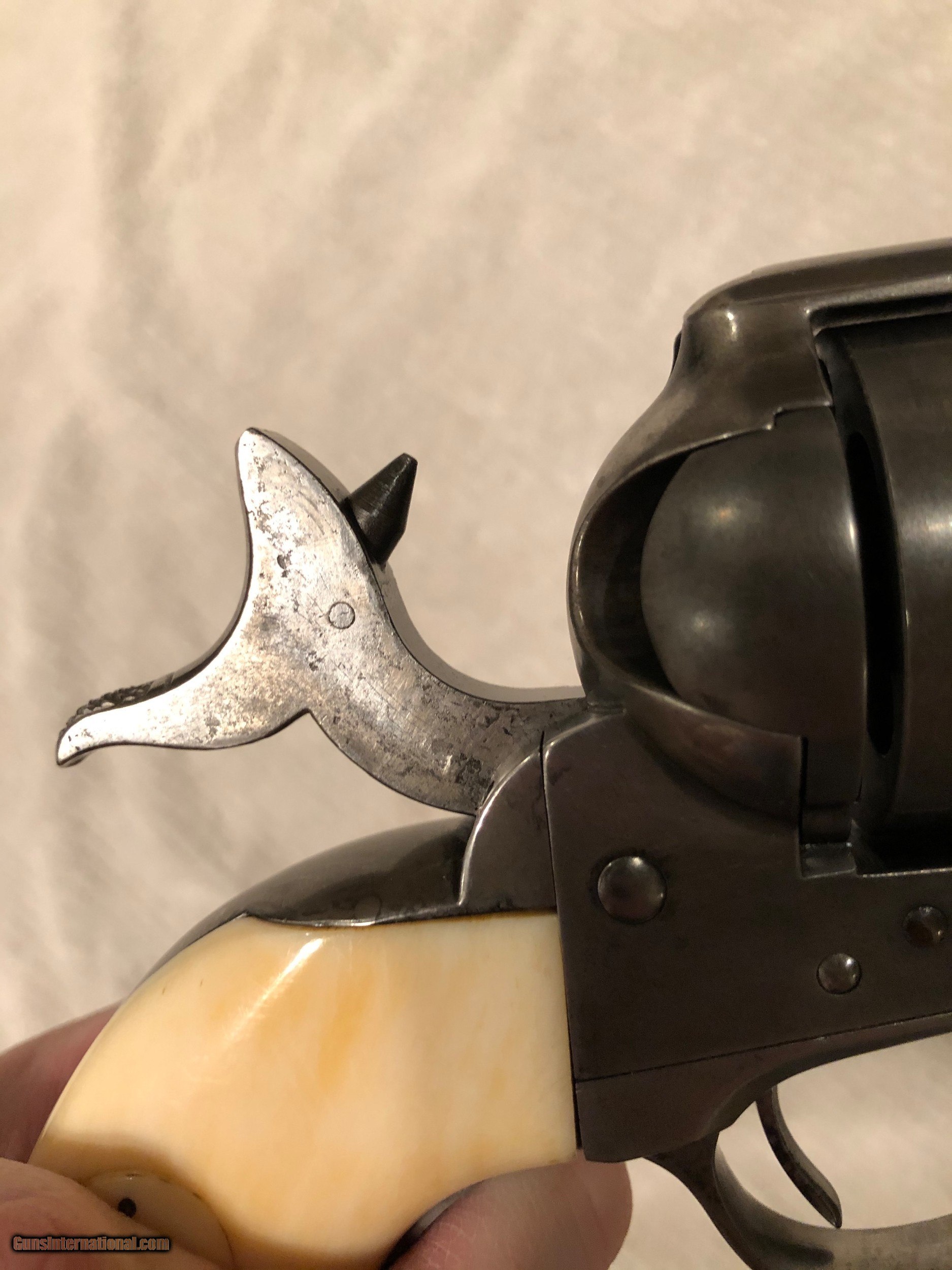 Description: 1904 Colt Single Action Army, 41 Colt, 5.5”, Original Blue/Case-Hardened --This SAA is up for sale from my personal collection. The Colt archive letter confirms this SAA as a 1904 41 long colt blue/case-hardened model with 5.5” barrel. The serial stamped on the frame is 251863, which matches the serial on the trigger guard strap and backstrap. The gun's original blue/case-hardened finish is essentially gone, but in its place is a nice consistent patina. There are no major gashes. The cylinder does have a turn line. The gun is fitted with 1-piece ivory grips. The left side has a few very small chips on the bottom. The right side has a rattlesnake/cactus design. The ivory grips probably need to be fitted a little better. The original black rubber grips (now brown) are included, but they are well worn. I’m not a competent gunsmith, but the action does need a little work. The sear engages the 3rd notch prior to the cylinder locking up. You will hear five clicks instead of four if you slowly cock the hammer. The bore is quite good. I noticed very slight frosting in the barrel bore. The screw heads are in overall good shape. It looks like some of the trigger guard and backstrap screws were replaced at some point. With that said, this Colt would make a fine addition to any collection. The ivory grips add to the presentation of the gun. Everyone should own a Colt SAA! --$2500 O.B.O. Shipping is included in the price. Cashier’s check or USPS money order are the only acceptable payment types. I am a private seller, not a FFL. I will need a copy of your FFL’s license to ship. I will ship with insurance. Please ensure this firearm is legal to own in your state. I will offer a 3-day inspection period after the firearm is received at your FFL. This guarantee does not cover disassembly and firing. If I misrepresent the gun, I will return your money in full. Please ask questions beforehand. I am easy to deal with. Please fire away with questions. SOLD Manufacturer: Colt Model: Single Action Army Serial Number: 251863 Barrel Length: 5.5” Caliber Info: 41 Long Colt Stock: Ivory Manufacture Date: 1904 |