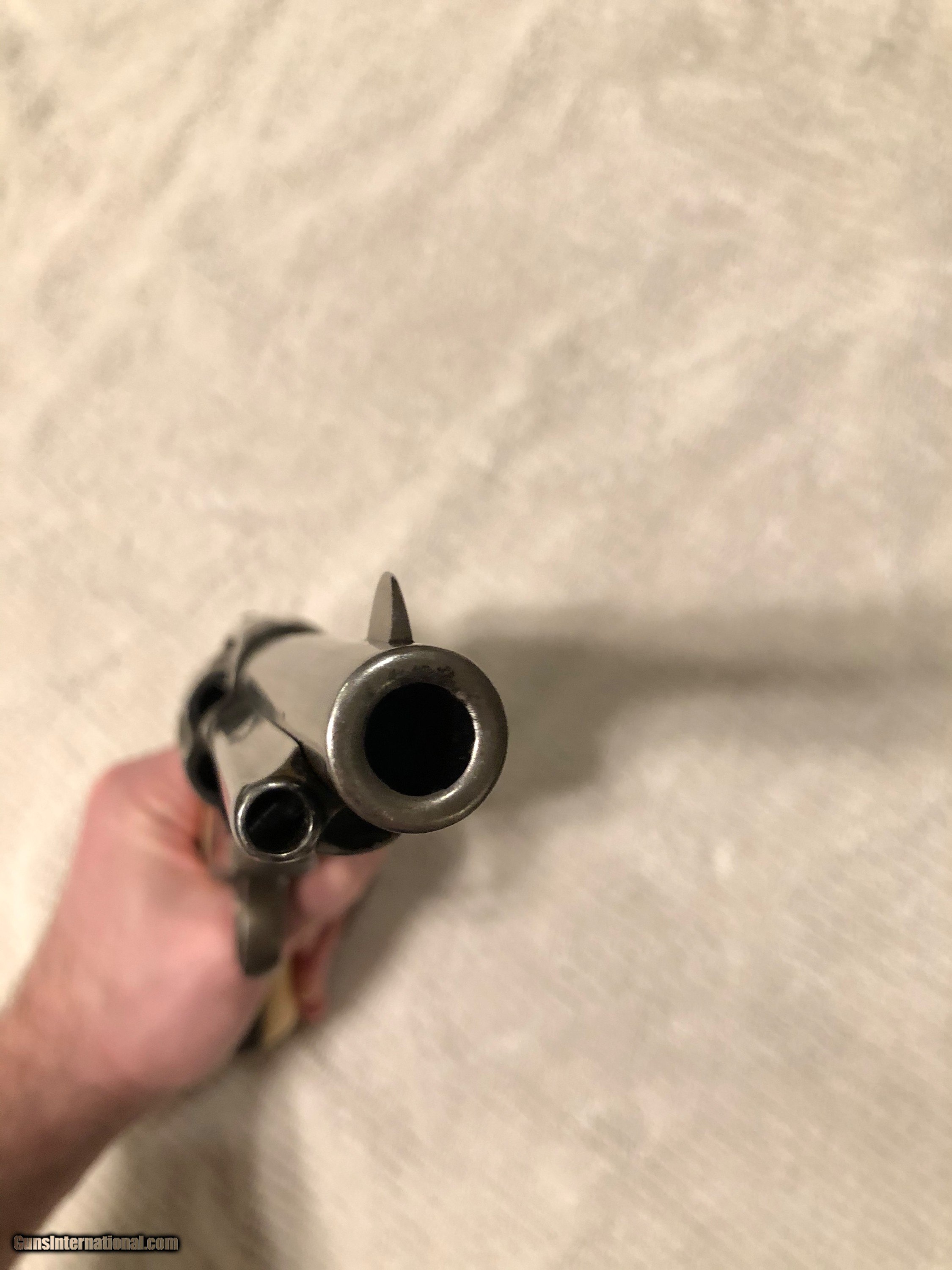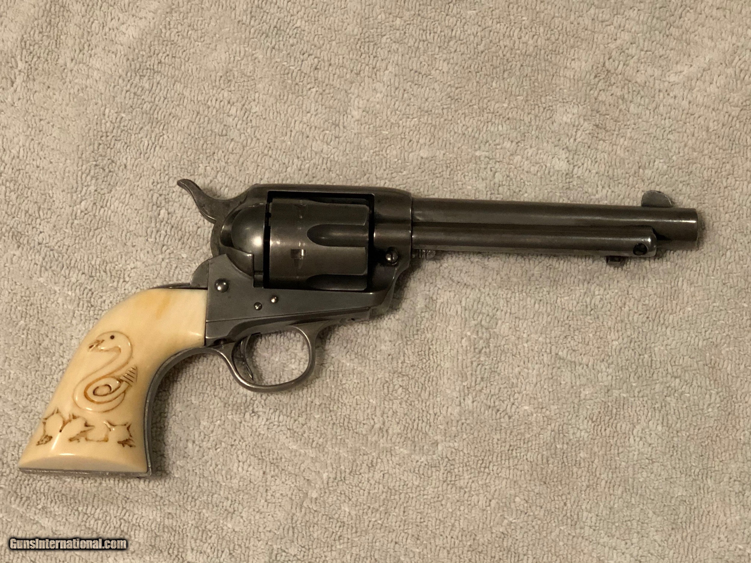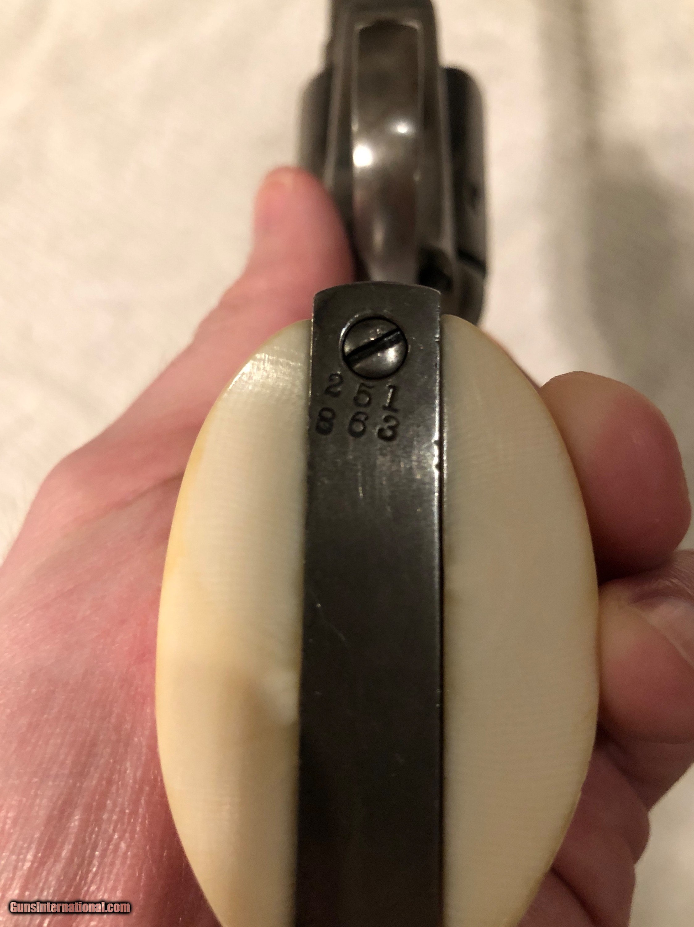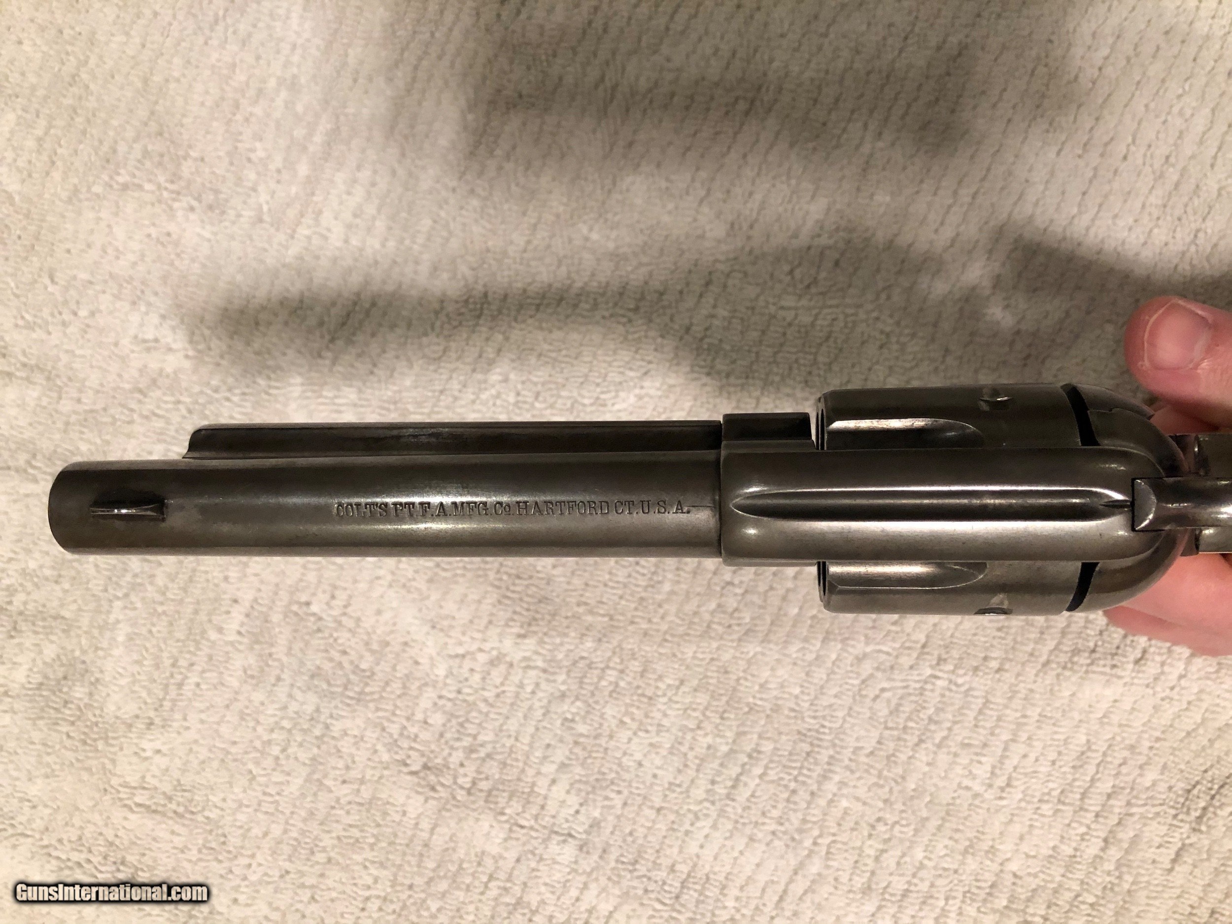 Description: 1904 Colt Single Action Army, 41 Colt, 5.5”, Original Blue/Case-Hardened --This SAA is up for sale from my personal collection. The Colt archive letter confirms this SAA as a 1904 41 long colt blue/case-hardened model with 5.5” barrel. The serial stamped on the frame is 251863, which matches the serial on the trigger guard strap and backstrap. The gun's original blue/case-hardened finish is essentially gone, but in its place is a nice consistent patina. There are no major gashes. The cylinder does have a turn line. The gun is fitted with 1-piece ivory grips. The left side has a few very small chips on the bottom. The right side has a rattlesnake/cactus design. The ivory grips probably need to be fitted a little better. The original black rubber grips (now brown) are included, but they are well worn. I’m not a competent gunsmith, but the action does need a little work. The sear engages the 3rd notch prior to the cylinder locking up. You will hear five clicks instead of four if you slowly cock the hammer. The bore is quite good. I noticed very slight frosting in the barrel bore. The screw heads are in overall good shape. It looks like some of the trigger guard and backstrap screws were replaced at some point. With that said, this Colt would make a fine addition to any collection. The ivory grips add to the presentation of the gun. Everyone should own a Colt SAA! --$2500 O.B.O. Shipping is included in the price. Cashier’s check or USPS money order are the only acceptable payment types. I am a private seller, not a FFL. I will need a copy of your FFL’s license to ship. I will ship with insurance. Please ensure this firearm is legal to own in your state. I will offer a 3-day inspection period after the firearm is received at your FFL. This guarantee does not cover disassembly and firing. If I misrepresent the gun, I will return your money in full. Please ask questions beforehand. I am easy to deal with. Please fire away with questions. SOLD Manufacturer: Colt Model: Single Action Army Serial Number: 251863 Barrel Length: 5.5” Caliber Info: 41 Long Colt Stock: Ivory Manufacture Date: 1904 |