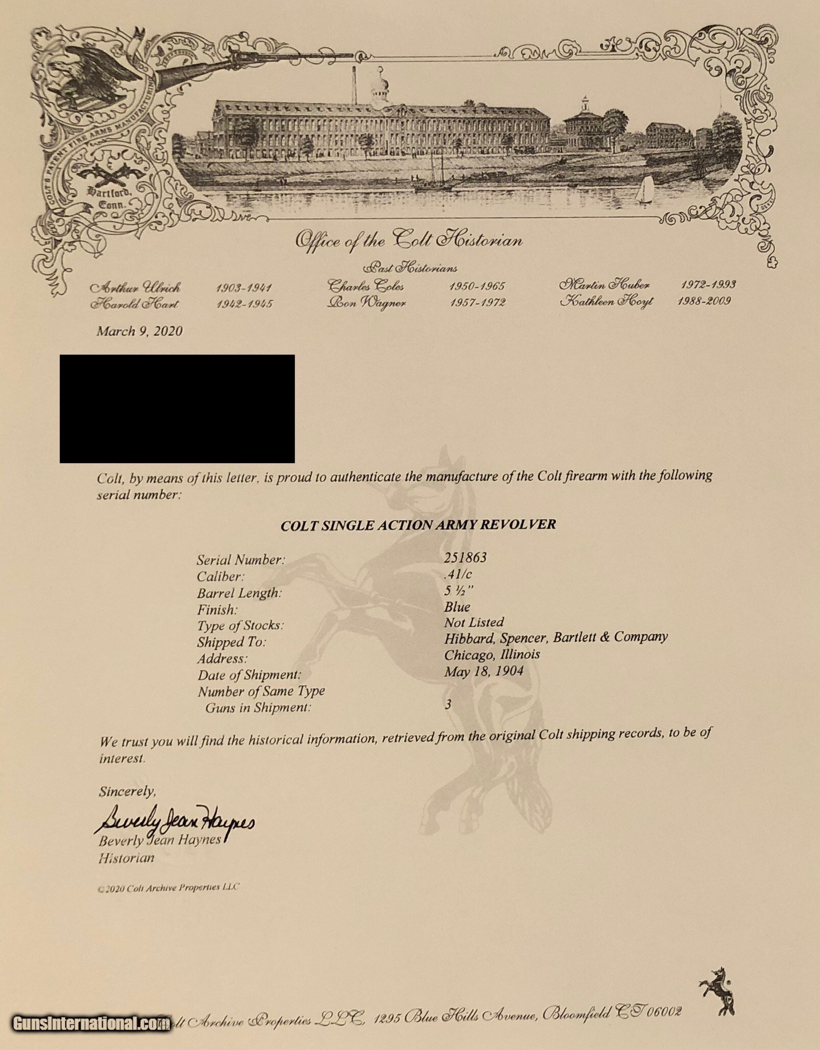 Colt SAA 1st Gen 1904 41 Colt 5.5” w/ Archive Letter