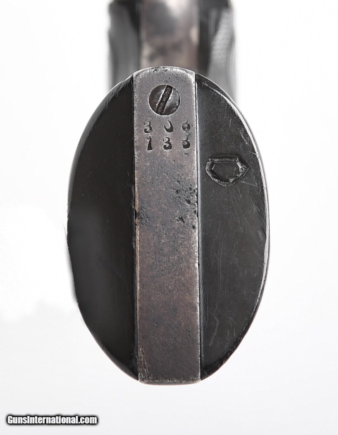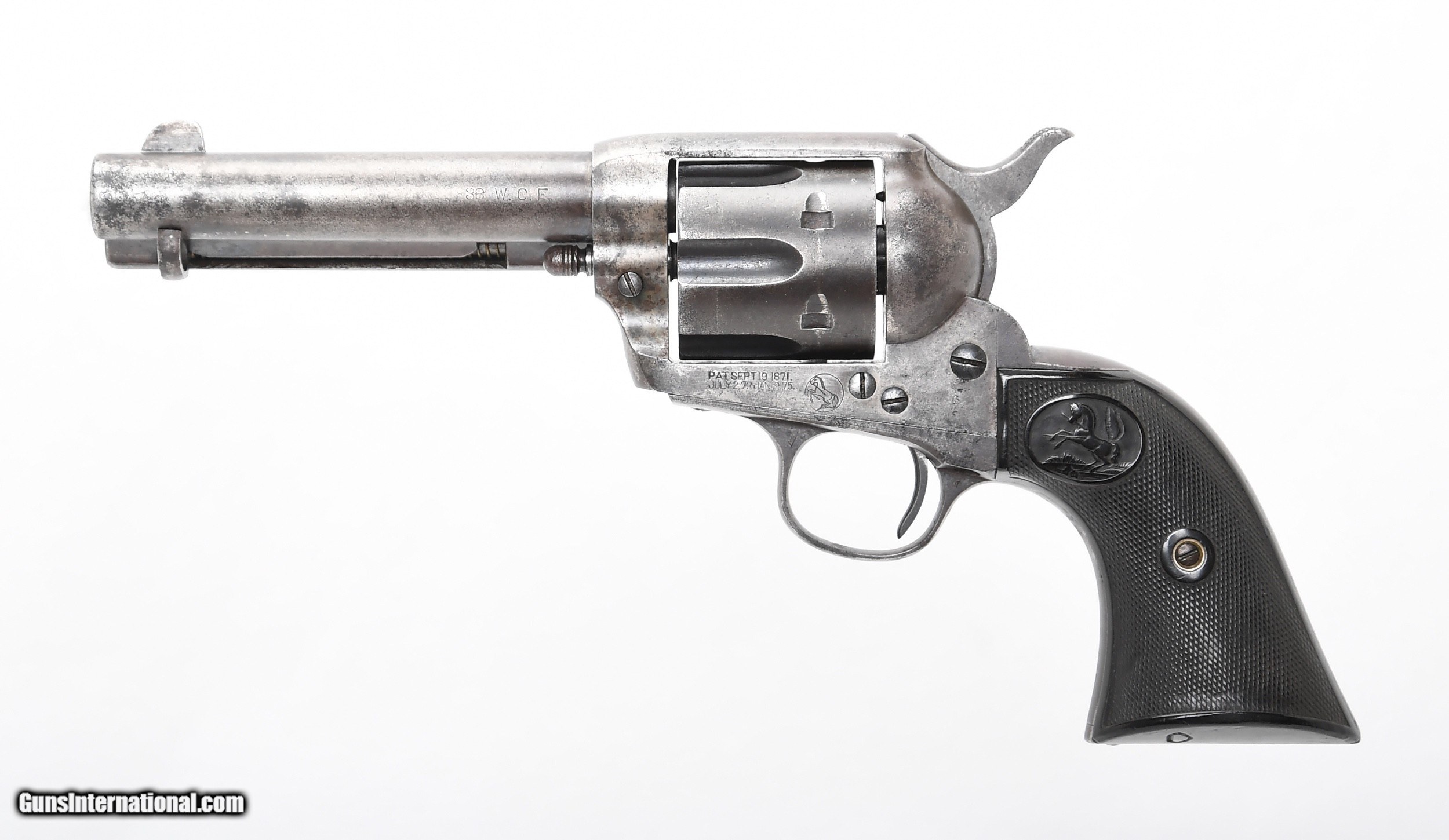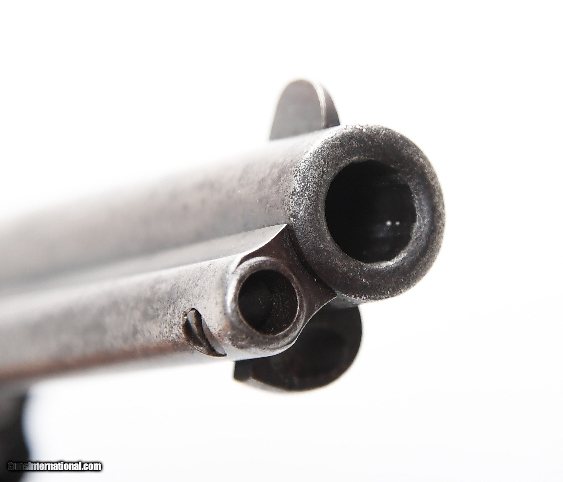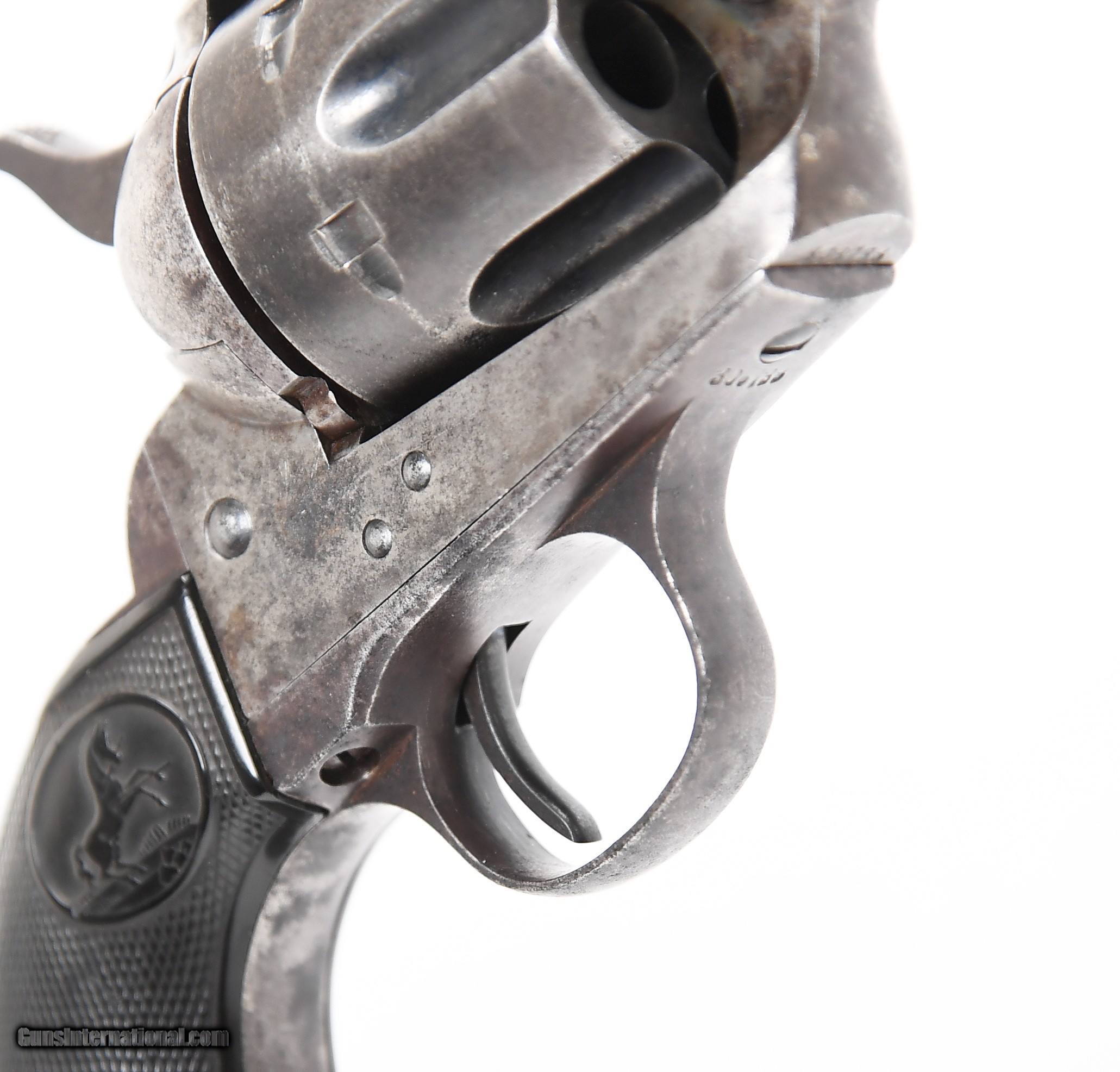 Description: Colt 1stgeneration Single Action Army, chambered for .38-40. 4 ¾” barrel. Made in 1909 this revolver is mechanically excellent. The bore has strong rifling, very shootable and just a few light spots of pitting. The frame and barrel have patina of dark grey. The two piece hard rubber Colt medallion grips appear to be original and they are very good and fit perfectly. This is nothing more or nothing less than a good example of 1stgen. SAA. SN: 308738 SOLD |