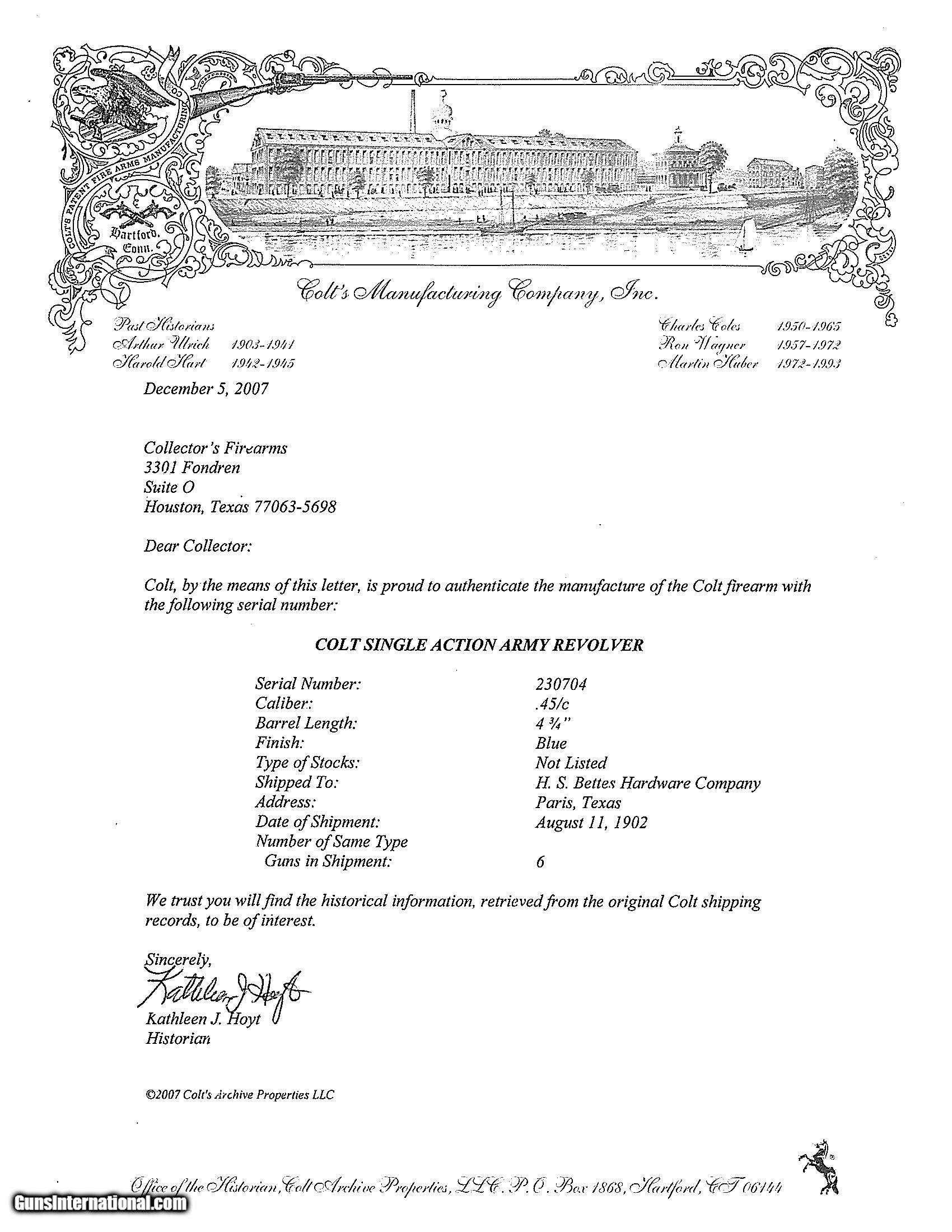 Description: Colt Single Action Army 1st Generation chambered in 45 Colt with a 4 3/4 inch barrel light pitting and strong lands & grooves. This firearm comes with a letter from Colt stating it was shipped to H.S. Bettes Hardware Company in Paris Texas on August 11 1902. The two-line Colt address markings on the top of the barrel were produced that way on most of Colts Single Action Army but were sometimes omitted on barrel lengths of 4 3/4 inches and less. The cylinder appears to be functional & in time and the hammer has all four Colt clicks. According to "The Book of Colt Firearms" the Single Action Army stamped with " PAT. SEPT. 19 1871 JULY 2 72 JAN 19 75 were serial numbered approximately from #135000 to #357859. This is a used firearm that is in fair condition and is covered by Dury's Lifetime Warranty.
