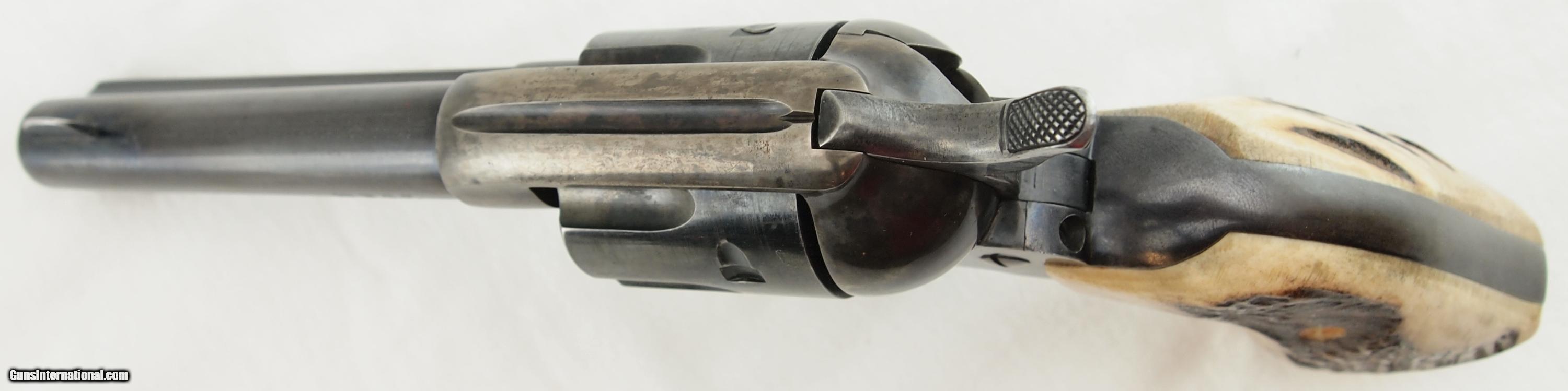 Description: Colt SAA, 1st GEN, MFG 1911, .38 WCF, matching numbers, 4 3/4" blued bbl, bright shiny bore, good rifling, case hardened frame, original case hardening color and blued finish significantly intact, solid action, light holster wear, and genuine stag grips. See pictures for an appreciation of this outstanding revolver. Add 3% for Credit Card Shipping $25.00 SOLD |
