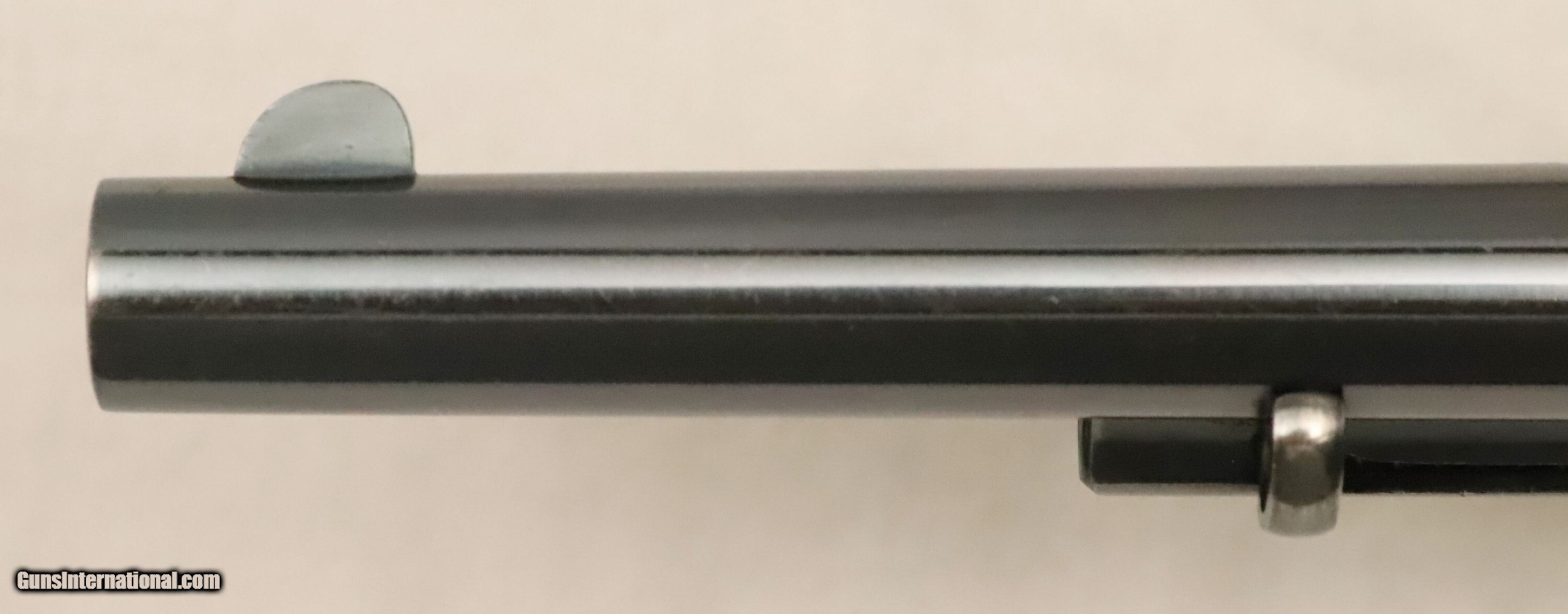 The original blue is excellent with just the slightest wear on the high edges of the muzzle and the leading edge of the loading gate tube. The leading edge of the outside of the trigger guard shows slight thinning. The front and backstrap show modest thinning but less than the trigger guard. The Cylinder shows a slight turn line with light thinning between flutes. This thinning / wear is more pronounced on two places as they were the “Downside” in storage. The case color looks new with only the slightest fading. All markings are sharp and clear. The un-numbered hard rubber grips are chip and crack free. They have slightly faded to brown; the color appears much more pronounced in the photos than in person. The bore is bright and sharp with the slightest roughness in the lands. The action is tight and smooth as you would expect.