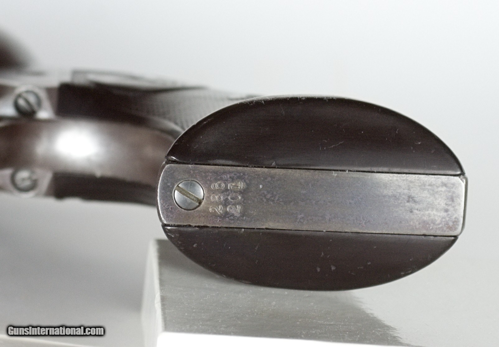 The bore has strong lands and grooves, with some shallow patches of pitting in the grooves. On a scale of 1 to 10, I would call this one a 7-bore condition. The front of the cylinder shows the expected light porosity, with a minimal gap between it and the rear of barrel. The rear of this cylinder is smooth gray. The chambers are smooth and clean (pictures show oil inside, after I cleaned them). The steel front sight remains in its original 0.52” x 0.29” tall configuration. The ejector head is perfectly straight and fits nicely to the underside of barrel. These ejector heads are often seen badly bent backwards (toward the cylinder), as results from ejecting tight cartridge cases. There are some minor dings on the barrel just ahead of the cylinder pin head (see in pictures, as magnified). The cylinder pin is a new replacement, and this part also promotes a tighter cylinder lock-up.