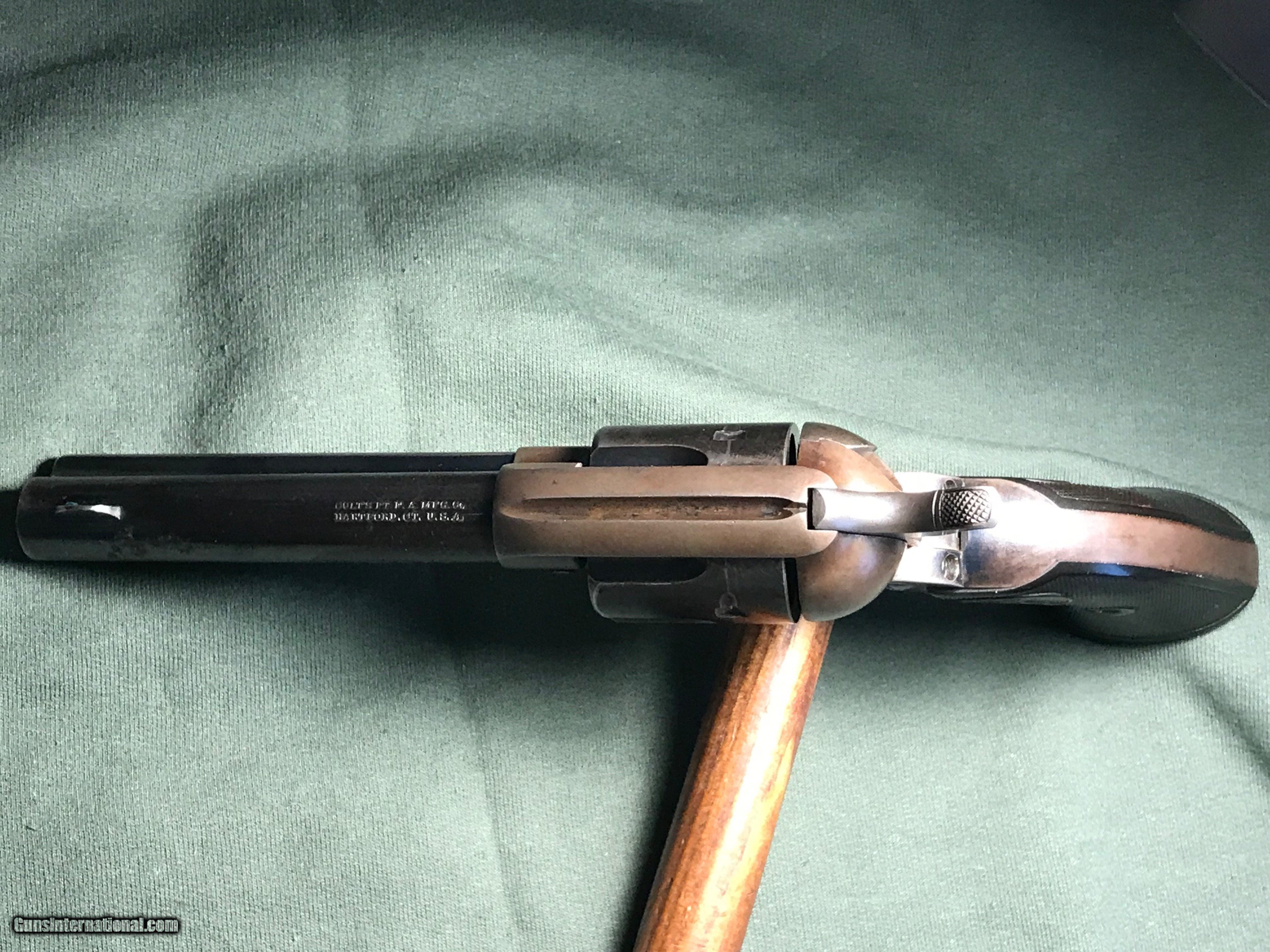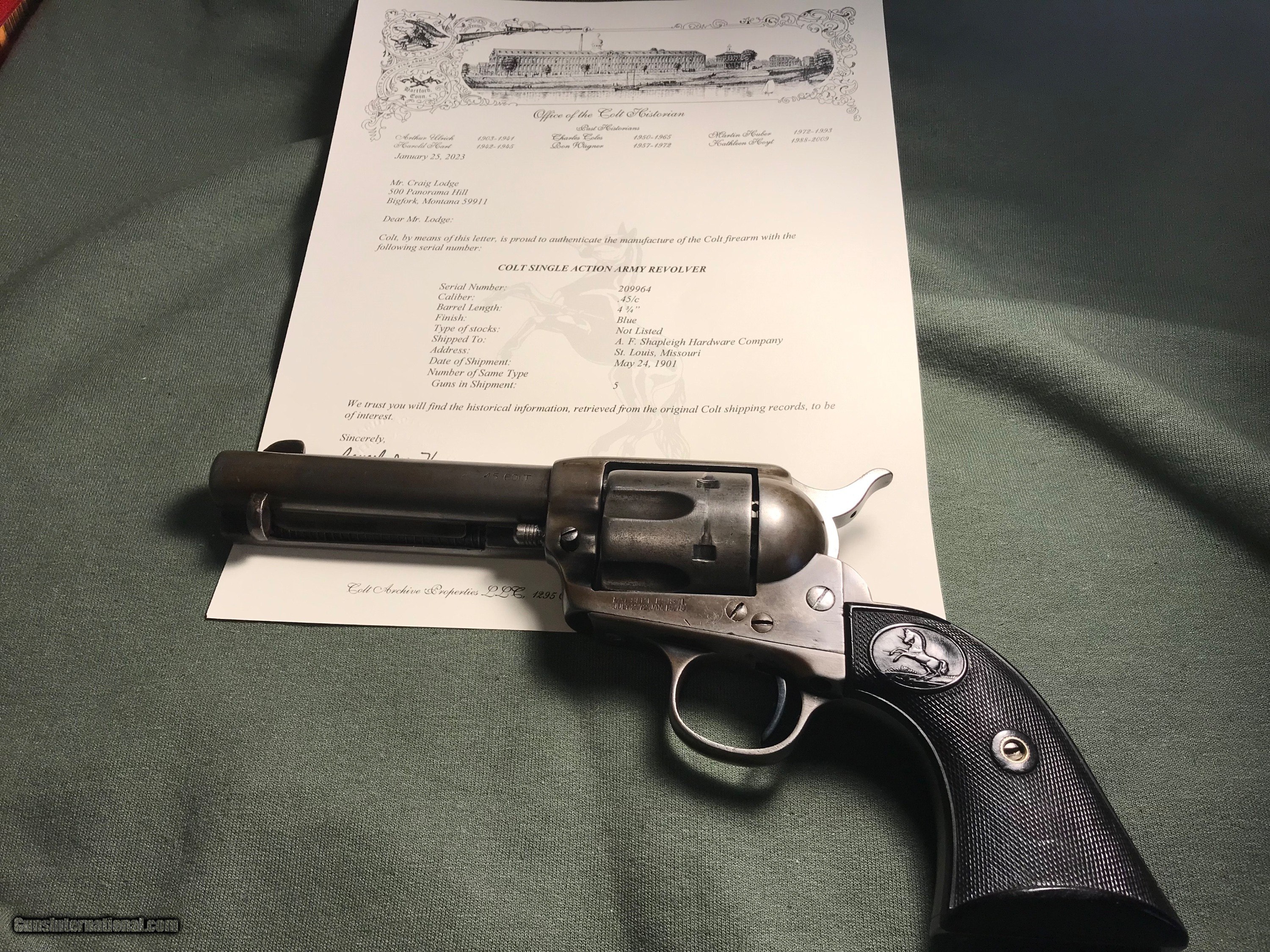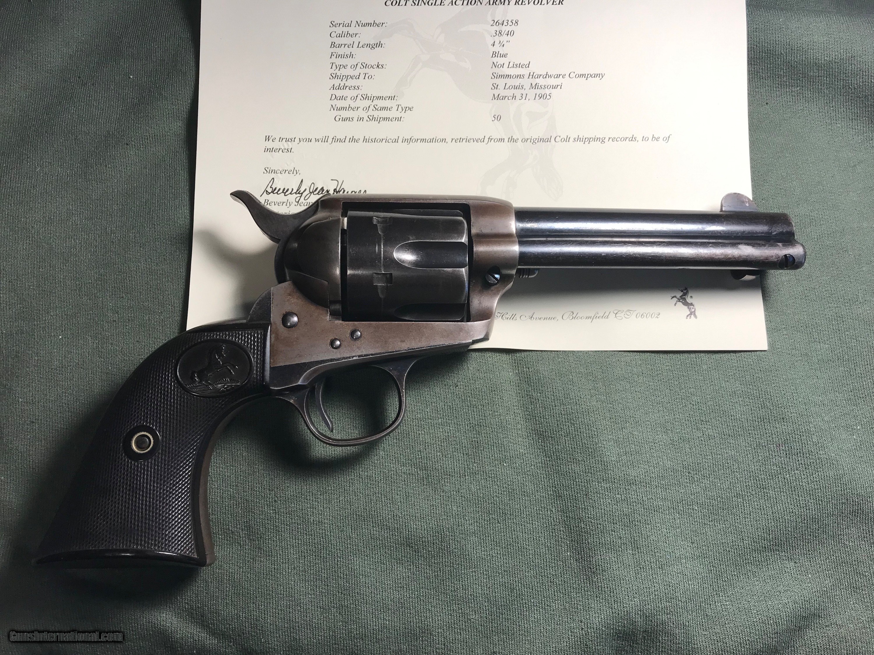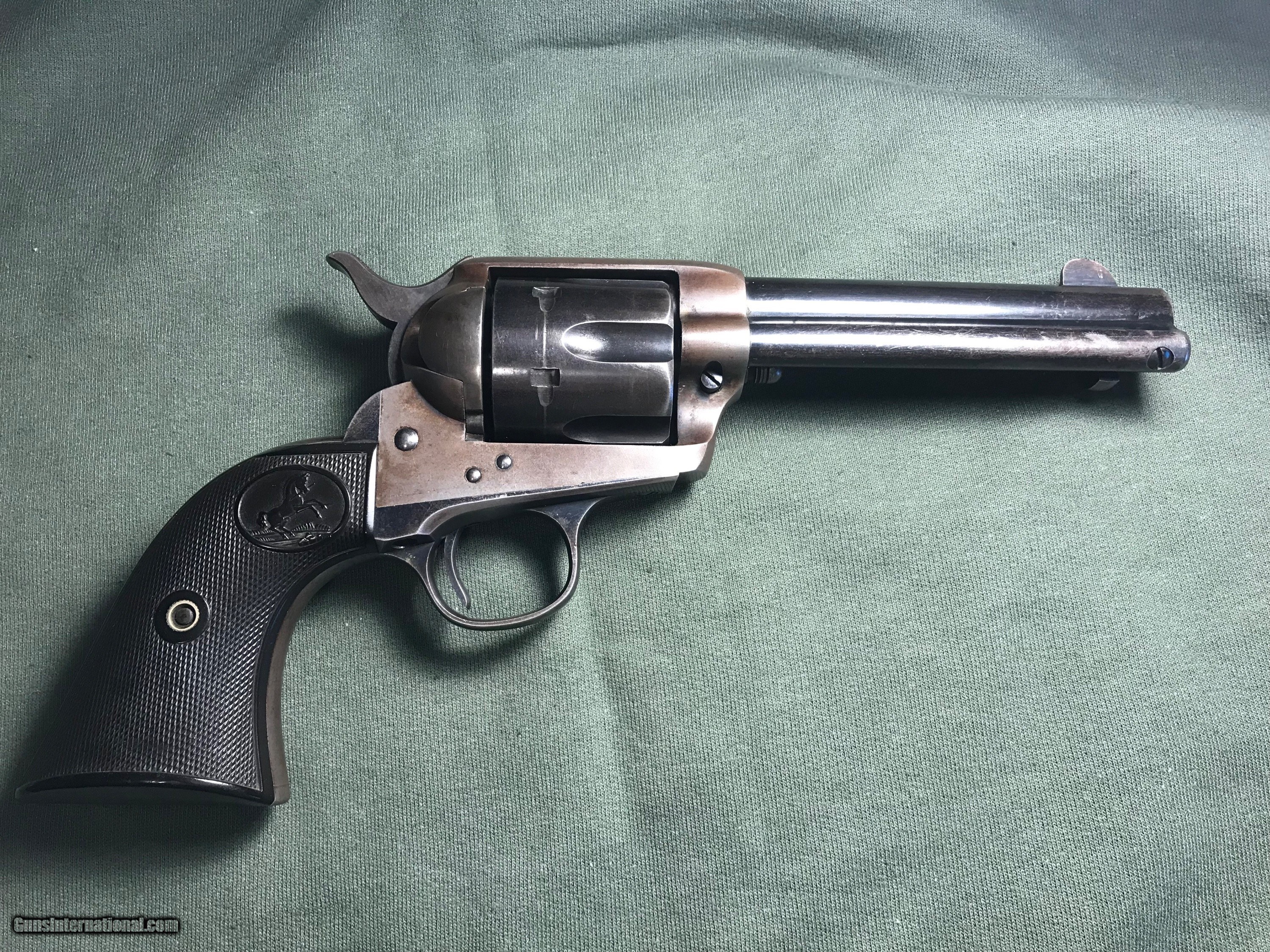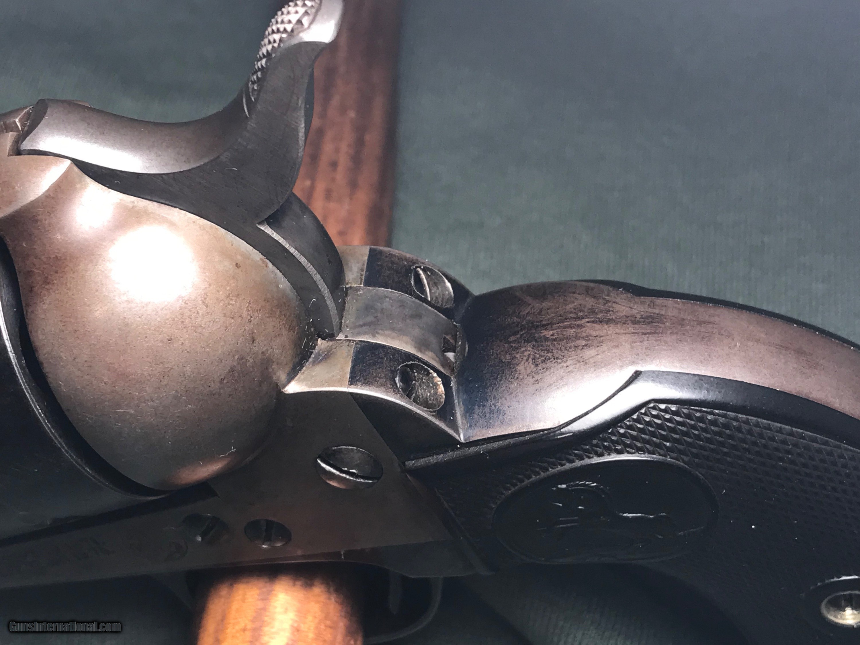 Description: This all original Colt SAA made in 1905 is very nice with Colt Letter. Locks up tight Nice case and bluing . Questions call Richard 406-407-0698 SOLD Curio/Relic: Yes Manufacturer: Colt Model: SAA Serial Number: 264xxx Barrel Length: 4 3/4 Condition: See pictures |