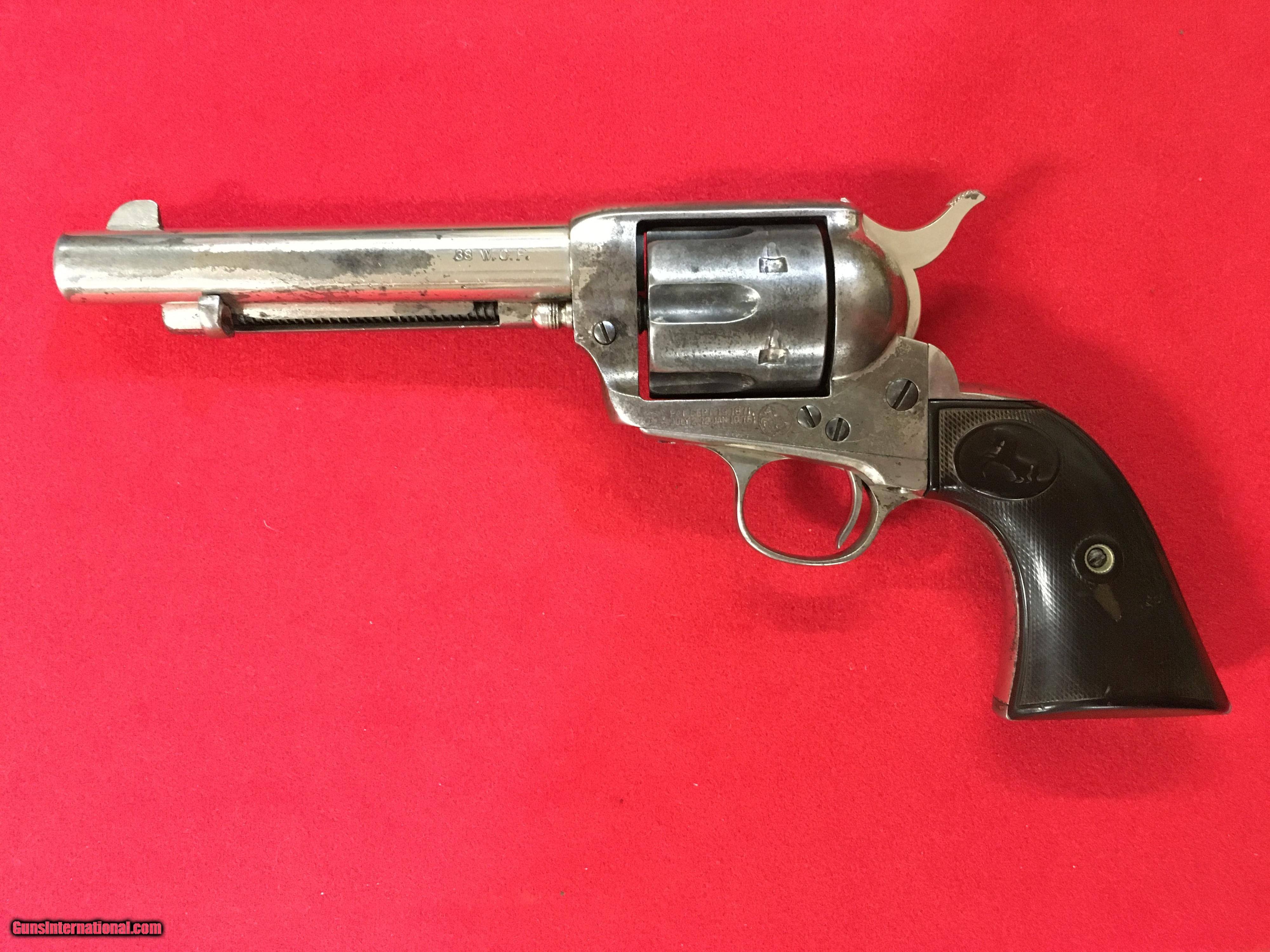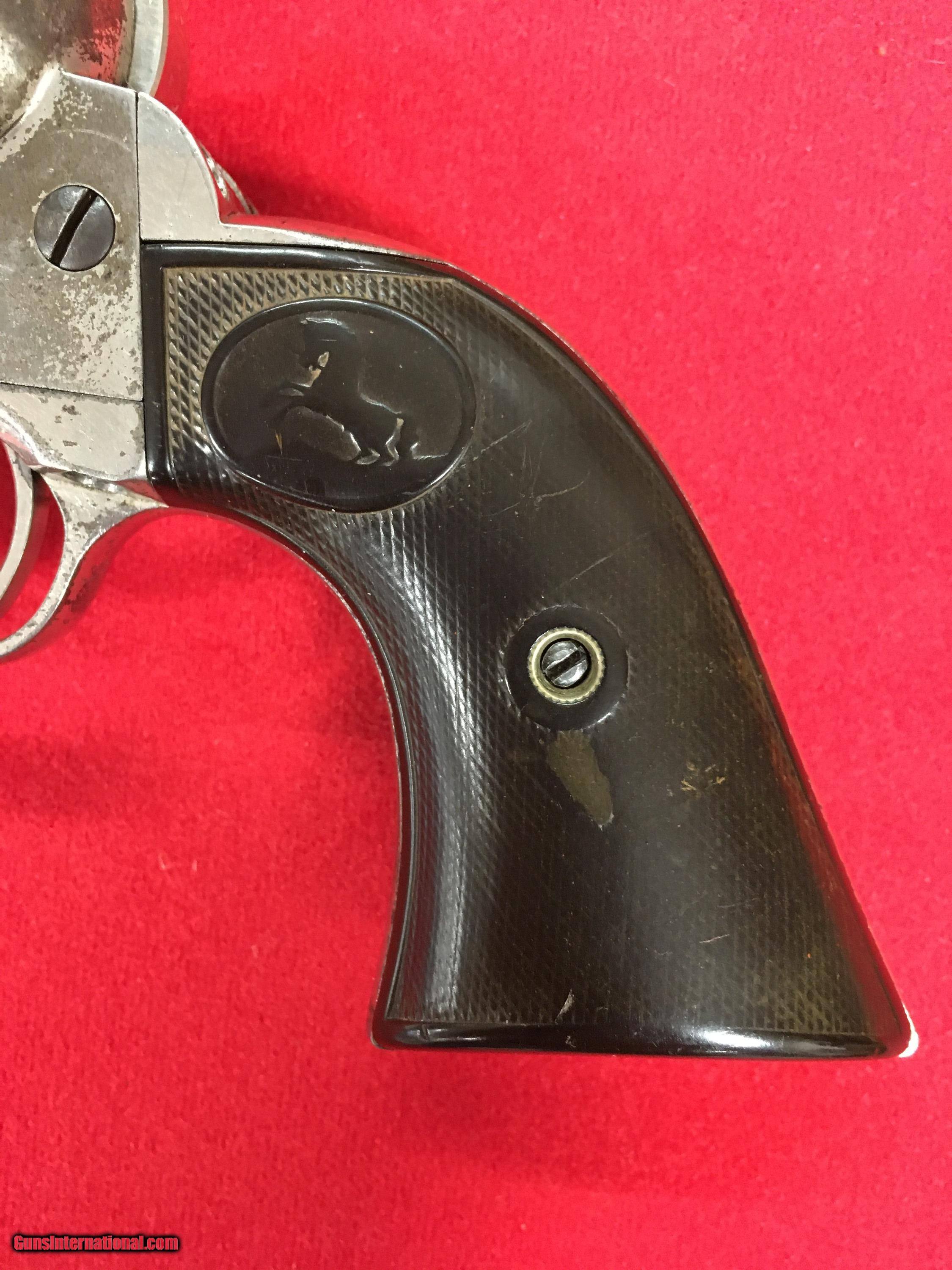Description: Colt SAA 38 W.C.F. 5-1/2 In. Nickel HR grips SN 242,631 Shipped to Montgomery Ward Chicago, Illinois Oct 26, 1903 - Colt letter incl. SOLD Curio/Relic: Yes Manufacturer: Colt Model: SAA Serial Number: 242,631 Barrel Length: 5-1/2 Caliber Info: 38 W.C.F. Condition: Good Metal Condition: 60% Orig Nickel Wood Condition: HR Grips Bore Condition: Dark-some pitting |