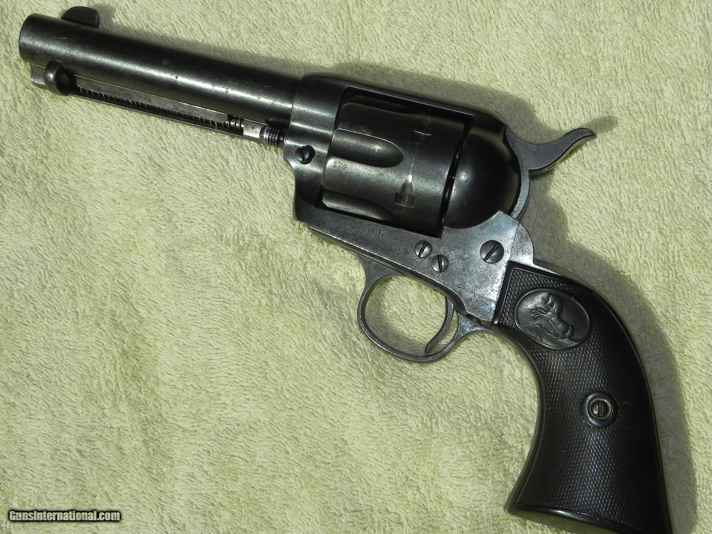 Description: COLT SAA 41 CAL , 4 3/4 , MFG 1902,NICE ORIGINAL OLD GUN. ALL 4 CLICKS, GOOD LOCK UP,DECENT BORE TURNED PLUM FROM AGE NEVER BUFFED OR REFINISHED. ALL LETTERS VERY CRISP AND LEGIBLE. MATCHING NUMBERS GUN, FRAME TRIGGER GUARD GRIP HANDLE .ALMOST 80 DONT WANT ANY GUNS SO NO TRADES. CASHIERS CHECK OR POSTAL MONEY ORDERS.I SHIP THE SAME DAY PAYMENT ARRIVES NOT A FFL BUT ALL LAWS MUST APPLY. GUN IS 118 YEARS OLD SO CR LICENCE IS FINE CALL BOB LADD 651 492 7218 $2325 SOLD Curio/Relic: Yes Manufacturer: Colt Model: SAA Barrel Length: 4 3/4 Caliber Info: 41 Condition: good Metal Condition: good Bore Condition: decent |