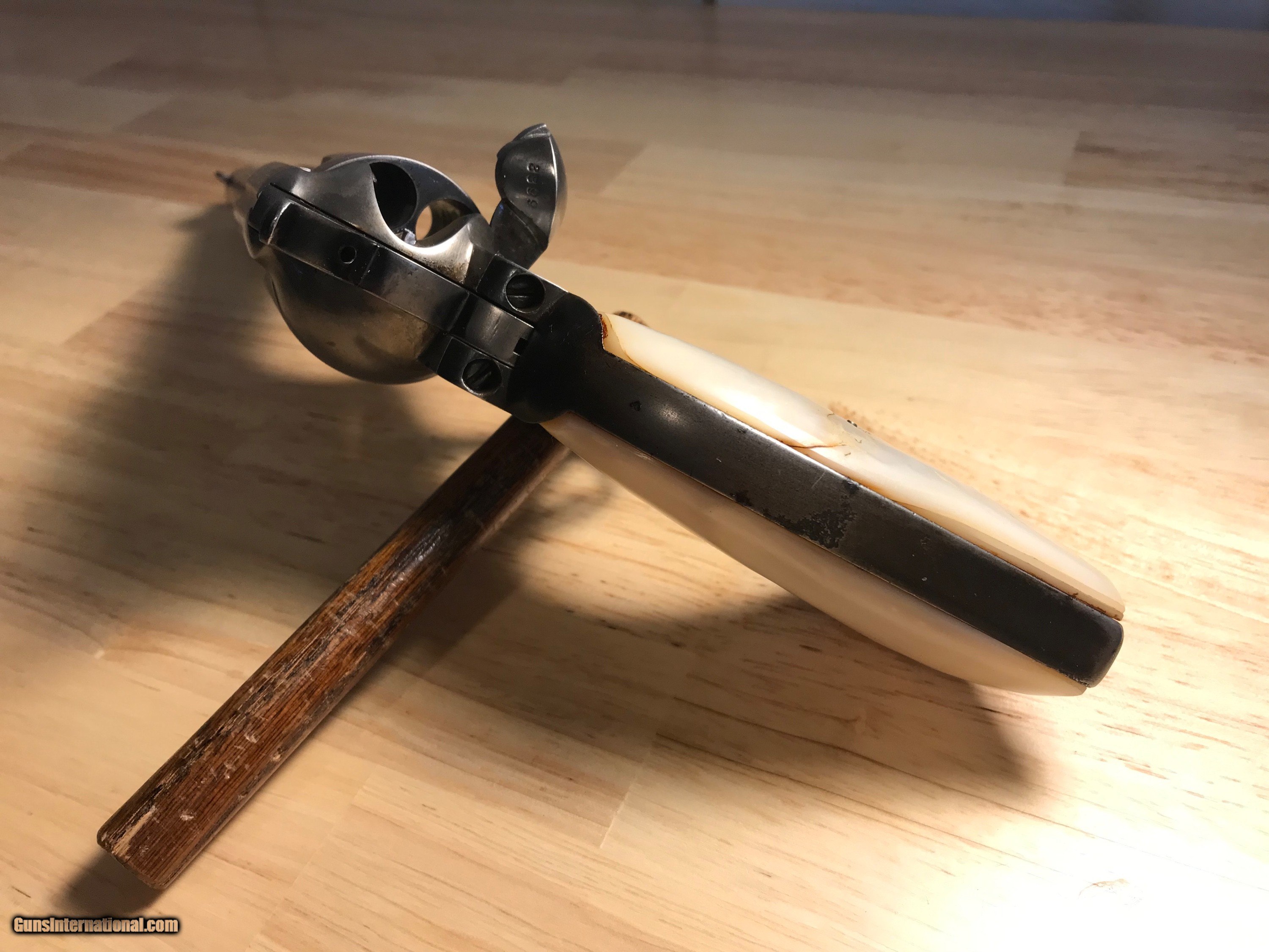 Description: This Colt 44-40 was made in 1883 , works perfectly, All original 44-40 Colt Frontier Six Shooter , good shiny bore. Old pearl grips , Colt found in Montana Questions Call Richard 406-407-0698 SOLD Antique: Yes Manufacturer: Colt Model: SAA Serial Number: 85xxx Barrel Length: 5 1/2 |