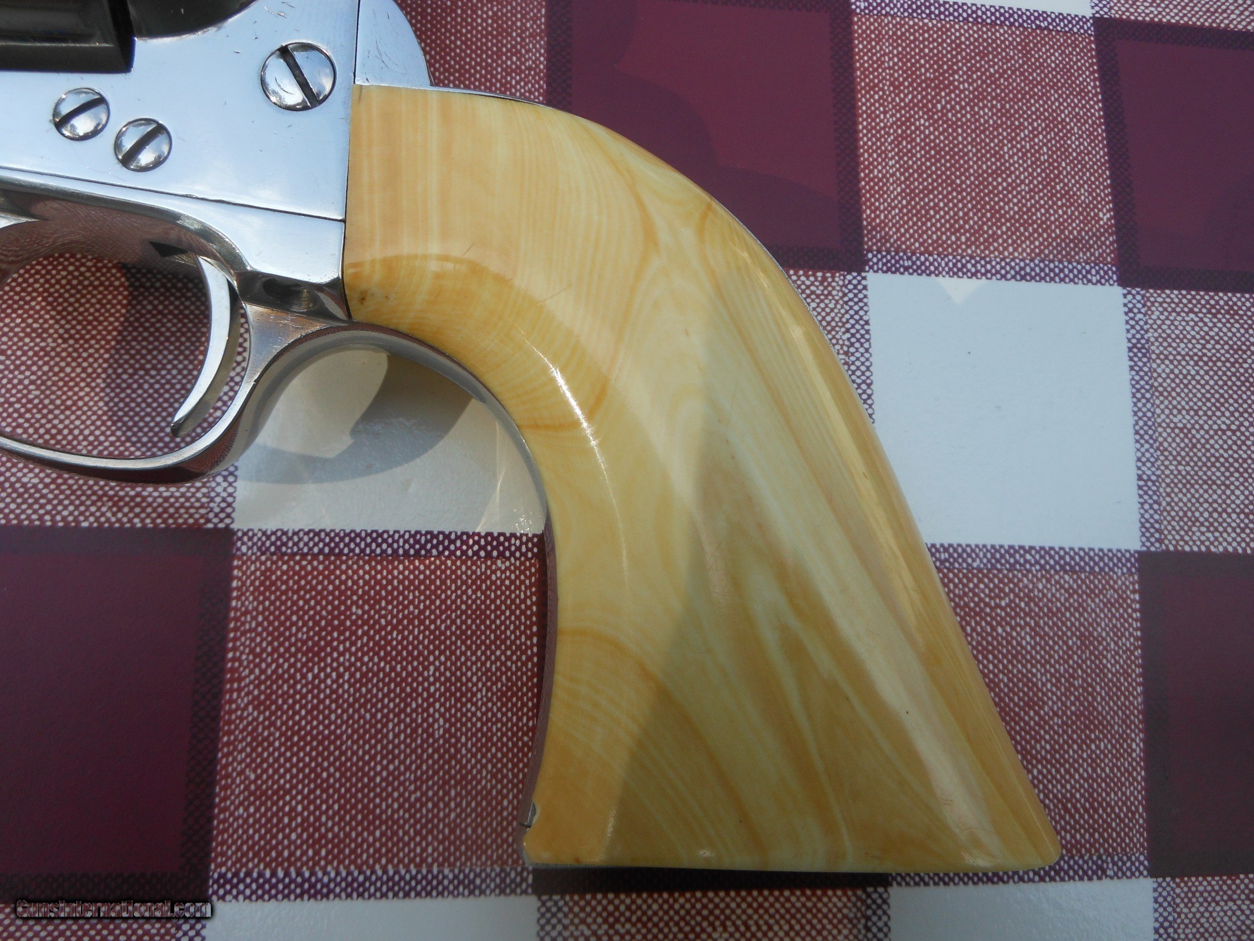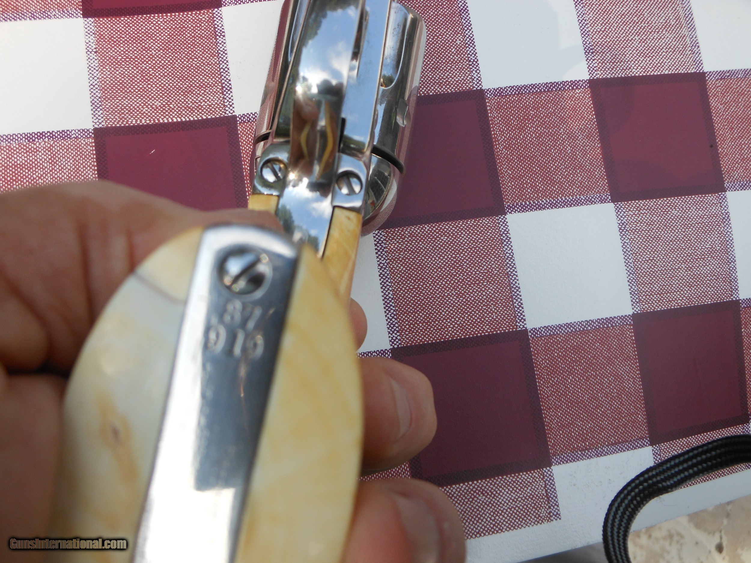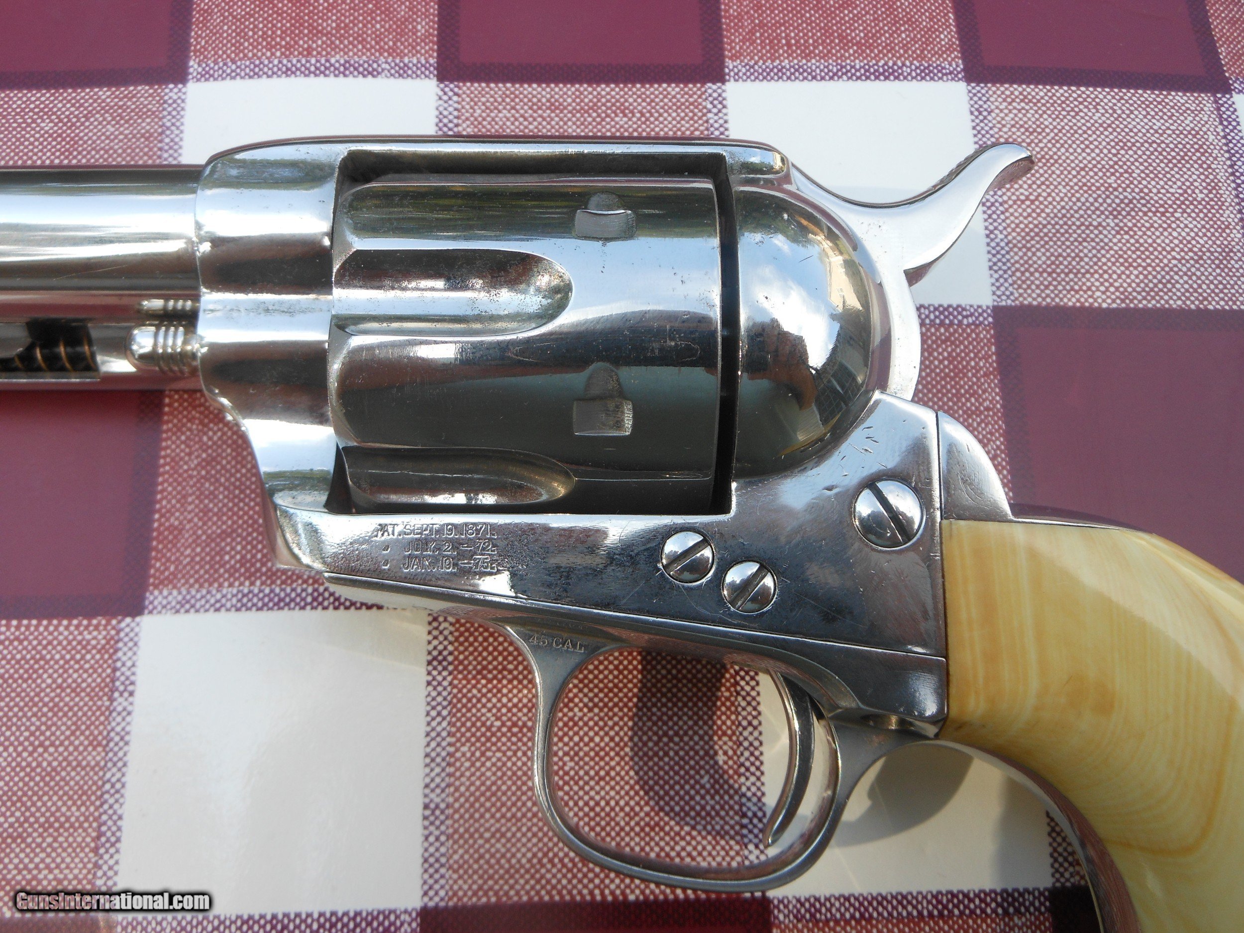 Description: Wow, Wow, Wow. This guns is NICE. Very Early(1883) 4.75 inch .45. Nickel is old style and the grips are gorgeous. As you see, it is lettered just as it sets to E. C. Meacham. All marks are very strong and I believe original. You don't see them like this too often. Buyer pays $35 shipping and Ins. No FFL required. Return only if not as described. SOLD Antique: Yes |