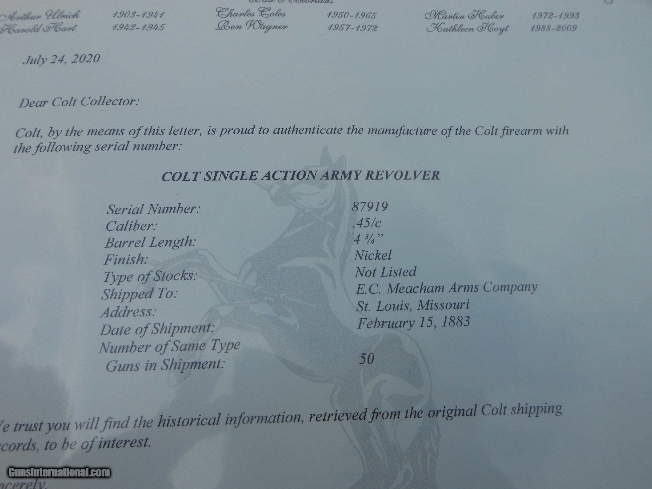 Colt SAA .45 4.75 inch 1883 Lettered to E C Meacham