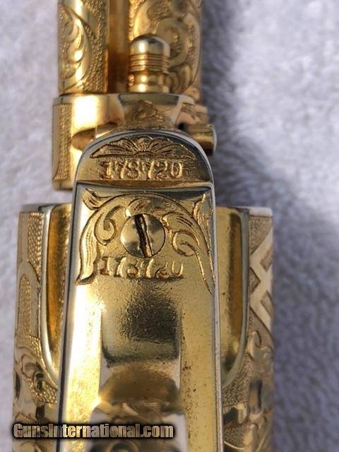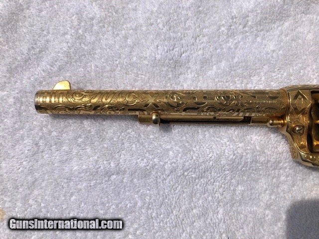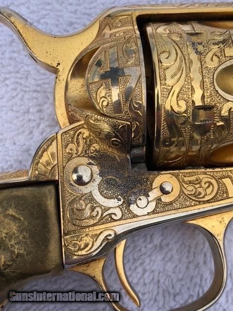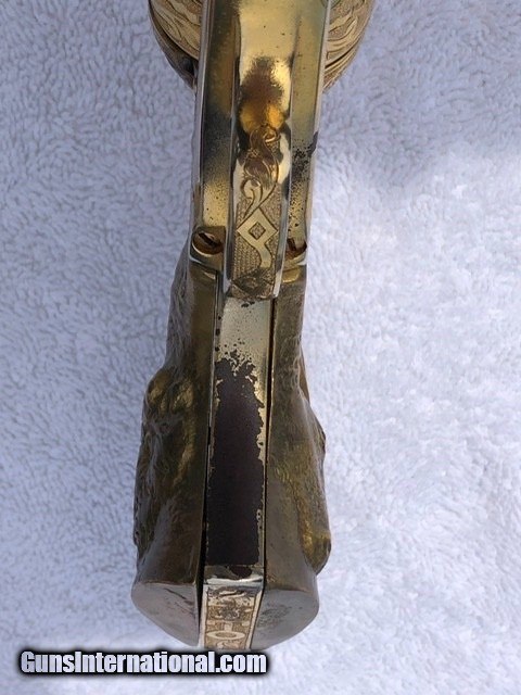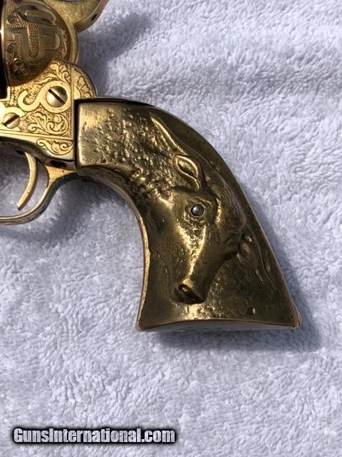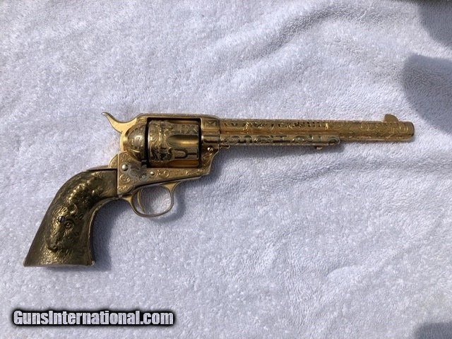Description: A very nice antique Colt Single Action in .45 7.5" cattle brand engraved by Weldon Bledsoe. This gun has a gold wash finish and carved grips. I can't tell if the grips are silver or another material but they have a steer head in one side and a buffalo on the other. This gun has some finish wear in a few places which are pictured. Comes with a colt letter and a kettle from master engraved David Harris verifying the engraving is Weldon Bledsoe's work. The bore looks good and functions as it should. $5375 SOLD Antique: Yes Manufacturer: Colt Model: SAA Barrel Length: 7.5” |