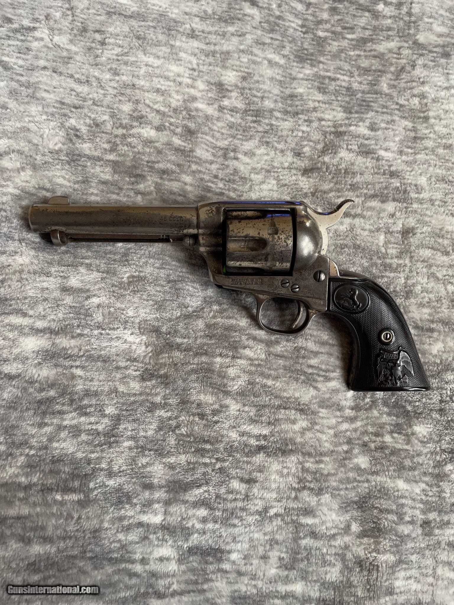 Description: “SOLD" This is a very nice example of a 4 3/4 barrel 1st gen, chambered in 45 colt. shipped in 1891 40-50 percent of the original nickel in tact. Rarely seen first gen eagle grips as well. Comes with a factory letter confirming configuration. Bore has strong rifling, but has a texture. Questions welcome. SOLD Antique: Yes |