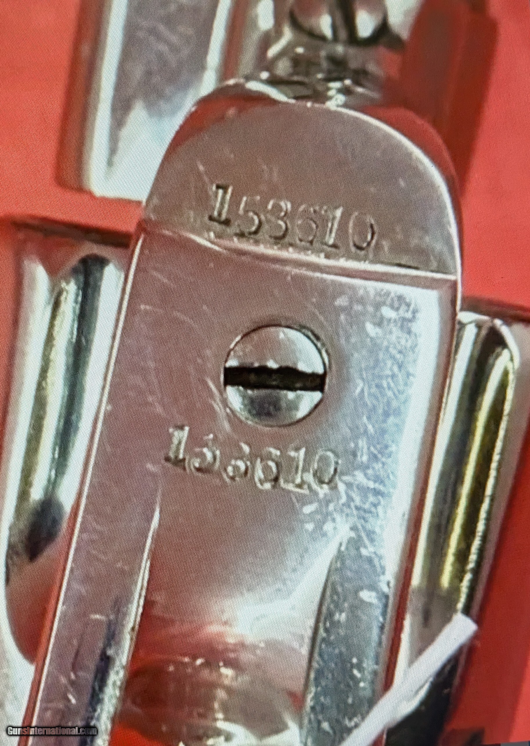 Description: Looks "MUCH'. better in hand than photos........beautful white looking nickel....Nice condition mfg 1893,nickel finish,4.75" barrel,excellent old pearl grips. Nickel is 100%, no flaking.Serial # 153610 Single Action Army RevolverNice 4 click action. All markings ledgible. Bore has visible rifling, but needs further cleaning. A nice looking Colt Single Action Army. ....2nd firearm ships FREE, with this one!....S/H $27..Thanks, Greg INSURANCE IS EXTRA...I AM NOT RESPONSIBLE FOR LOST or DAMAGED PACKAGES....Thanks Greg. Antique: Yes Handgun Caliber: .45 Colt Manufacturer: Colt Model: SAA Serial Number: 153610 Barrel Length: 4.75 Condition: Overall, about fine. Metal Condition: 100% Nickel Wood Condition: Pearl Excellent Bore Condition: Good Price: $4,099.00 Buy Now Contact Seller |