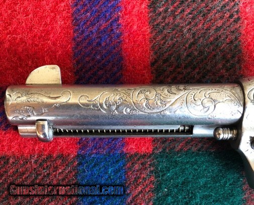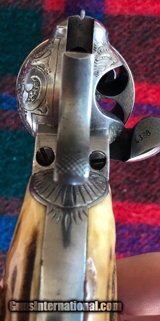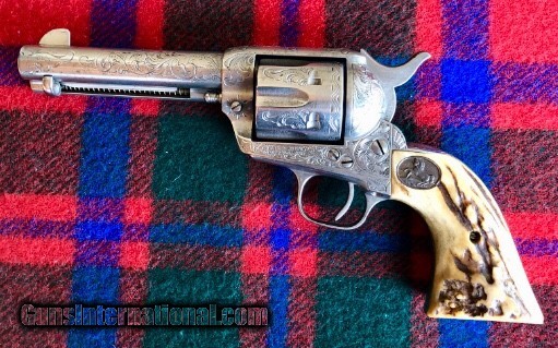 Description: Colt custom engraved SAA revolver, Model 1873, .45, 4 3/4 barrel Nickel finish, stag grips, serial# 346473 Manufacturing date 1924. SOLD Curio/Relic: Yes Manufacturer: Colt Model: .45 Revolver Serial Number: 346473 Caliber Info: .45 Bore: VERY GOOD Chambers: VERY GOOD Ejectors: Barrel Rod Condition: VERY GOOD Metal Condition: VERY GOOD Bore Condition: VERY GOOD Barrels: ONE Barrel Type: ROUND Action: SINGLE ACTION Triggers: ONE Stock: STAG Finish: NICKEL Sights: BARREL Manufacture Date: 1924 |