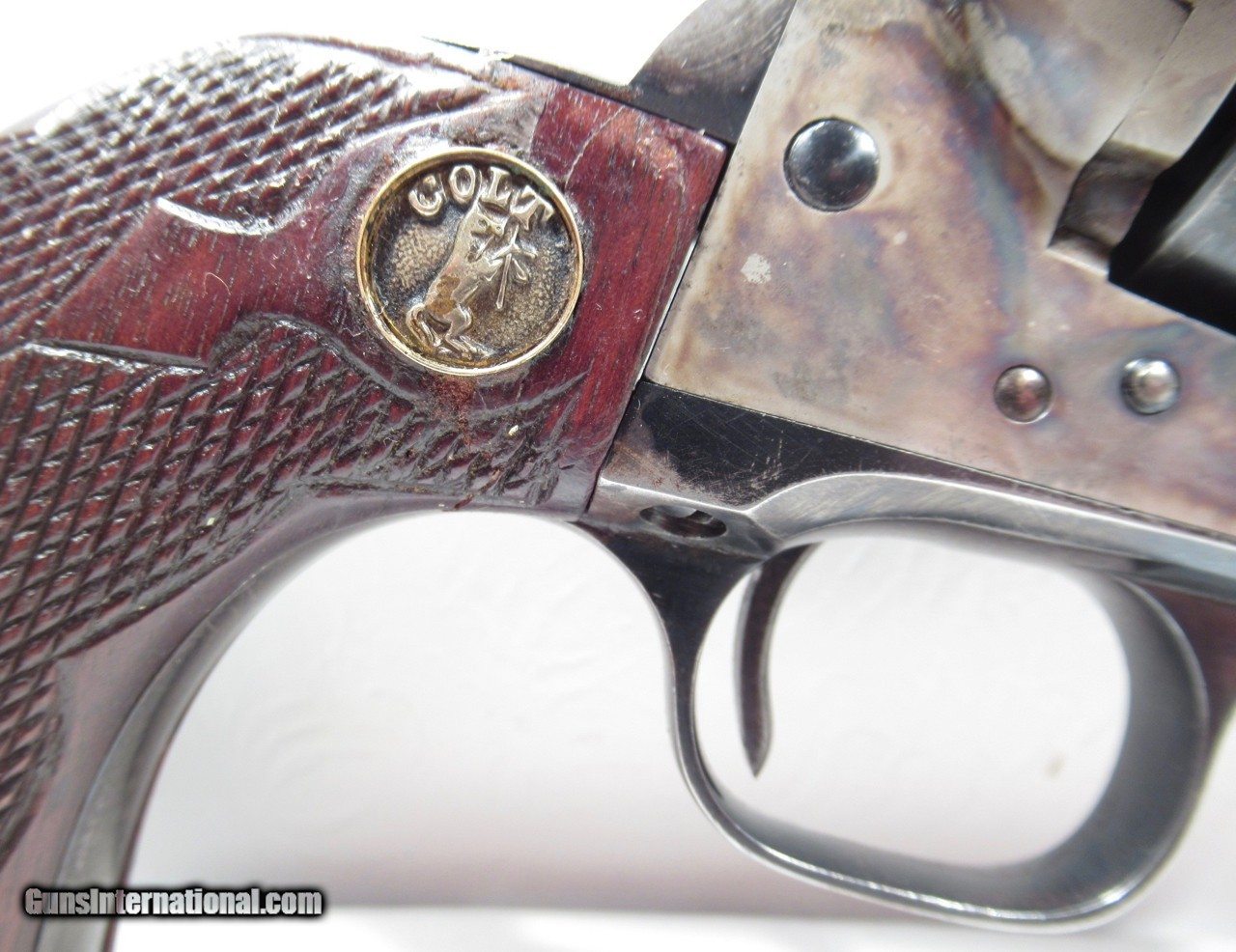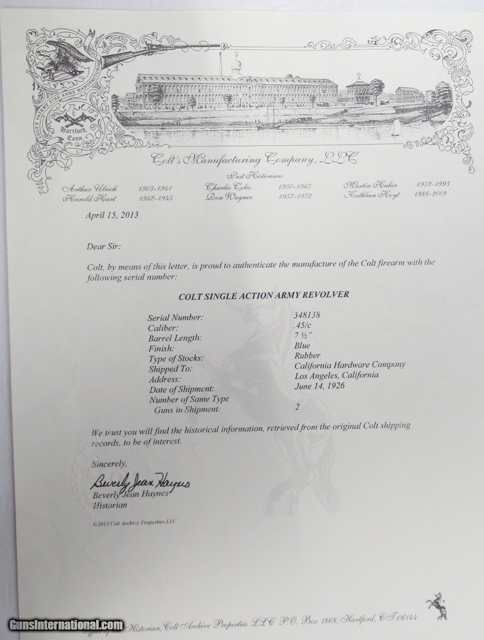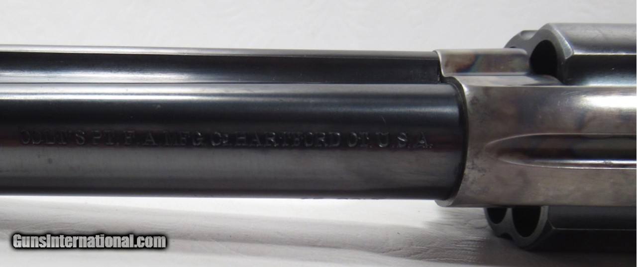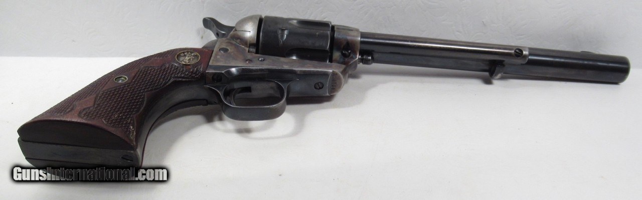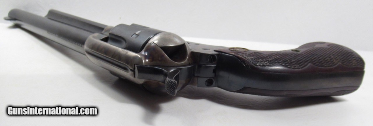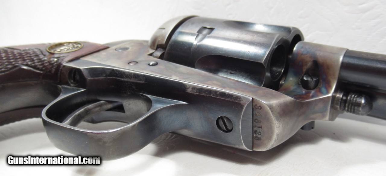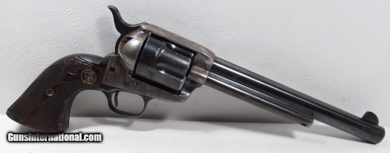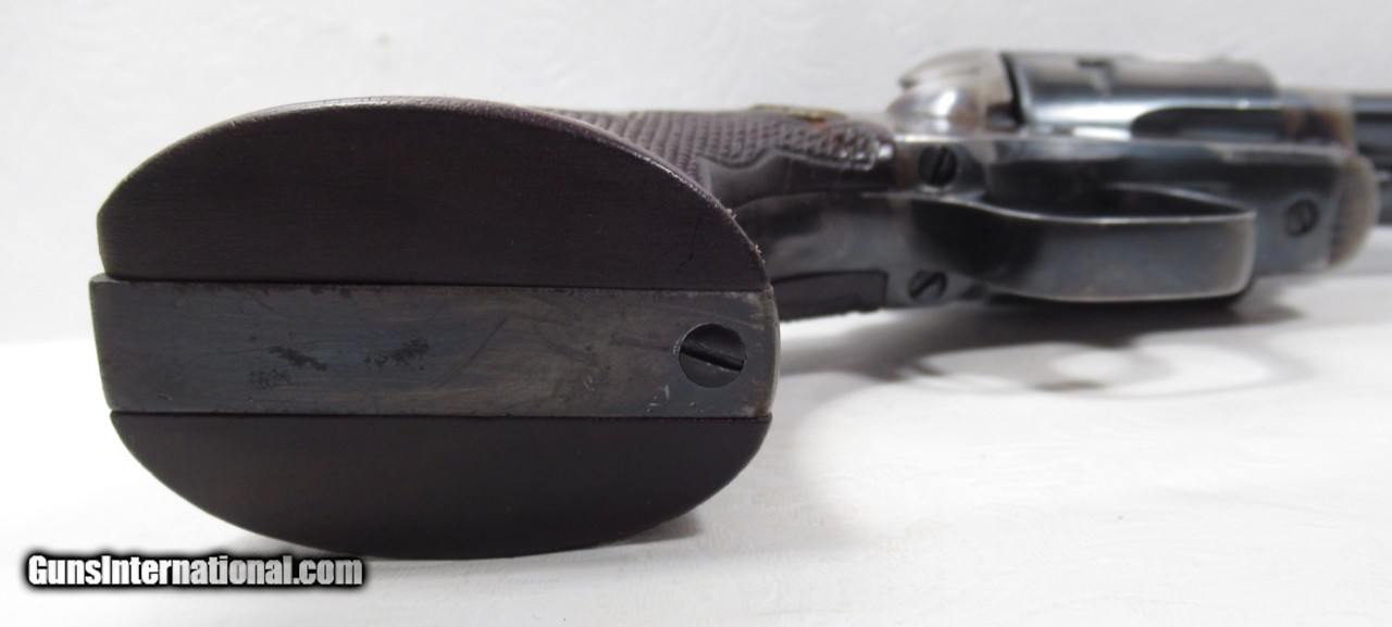 Description: Colt Single Action Army; Serial No. 348138; 45 Cal. – 7 ½” Barrel; Blue and Case Finish; Factory Letter Indicates a 1926 Shipping Date to Los Angeles Hardware Co.; Nearly All Original Metal Finish Remains; Hammer and Grips replaced; Perfect Action and Bore; Nice Fleur De Lies Walnut Grips; All Numbers Match with No. 38 on Back of Cylinder; See All Photos for Condition; No Texts. Call or Email Only; PERSONAL PROPERTY of Harold Wieser; Price: $5,900 + $45 S&H Via FedEx Express; Price includes insured shipping; return policy: three days inspection from the date the item is received; full refund of shipping both ways ONLY IF THE ITEM IS MISREPRESENTED. SOLD Manufacturer: Colt Model: 1873 Serial Number: 348138 |