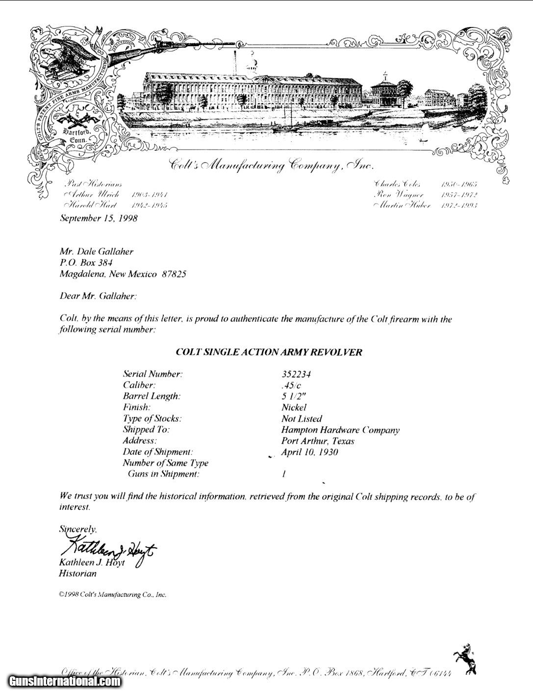 Description: Beautiful original nickel as shown in Colt Archive letter and in the highest condition. This is a 1930 Texas shipped gun. SOLD Curio/Relic: Yes Manufacturer: Colt Model: SAA Caliber Info: 45 Finish: Nickel |