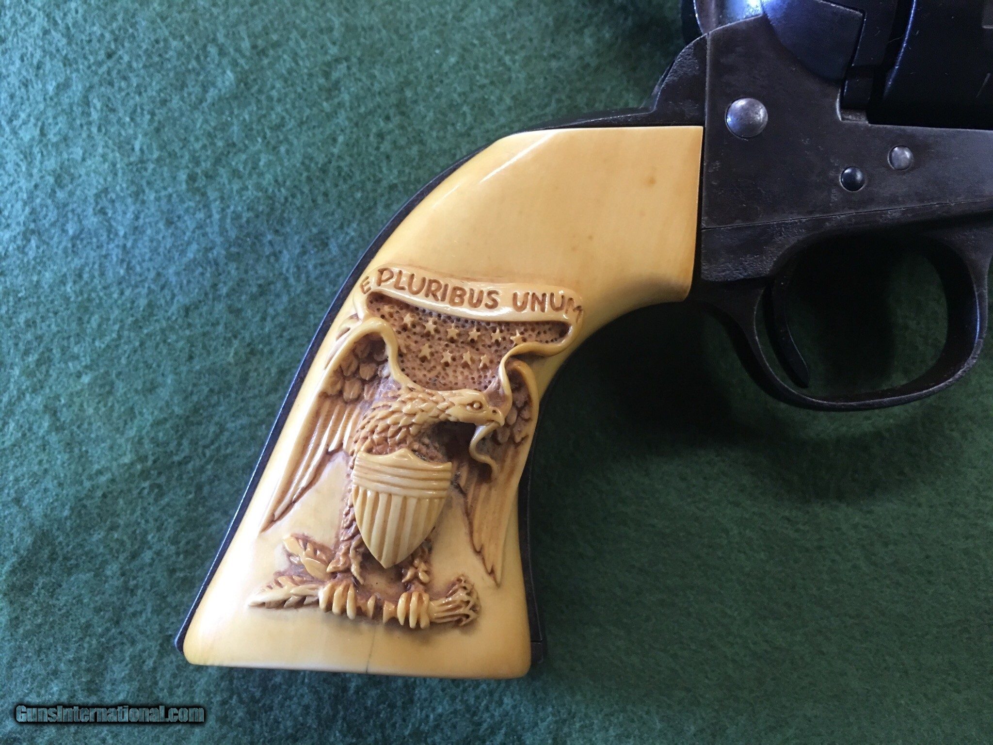Description: Nice Colt SA 7 1/2 45LC for sale. Serial # 169XXX (1897). Very nice piece with little finish left. Has small amount of little pitting on the frame. The action is tight and the metal is smooth. The grips are ivory with a carved Eagle and the famous “ E PLURIBUS UNUM” meaning “out of many, one”. The grips fit a little loose and are most likely not original to the this Colt. It also appears that the Colt has had some degree of restoration but quit a long time ago. Non the less still a beautiful and desirable piece of history. Im always open to trades. SOLD Antique: Yes Manufacturer: Colt Serial Number: 169XXX Caliber Info: 45LC Condition: Good Metal Condition: Good |