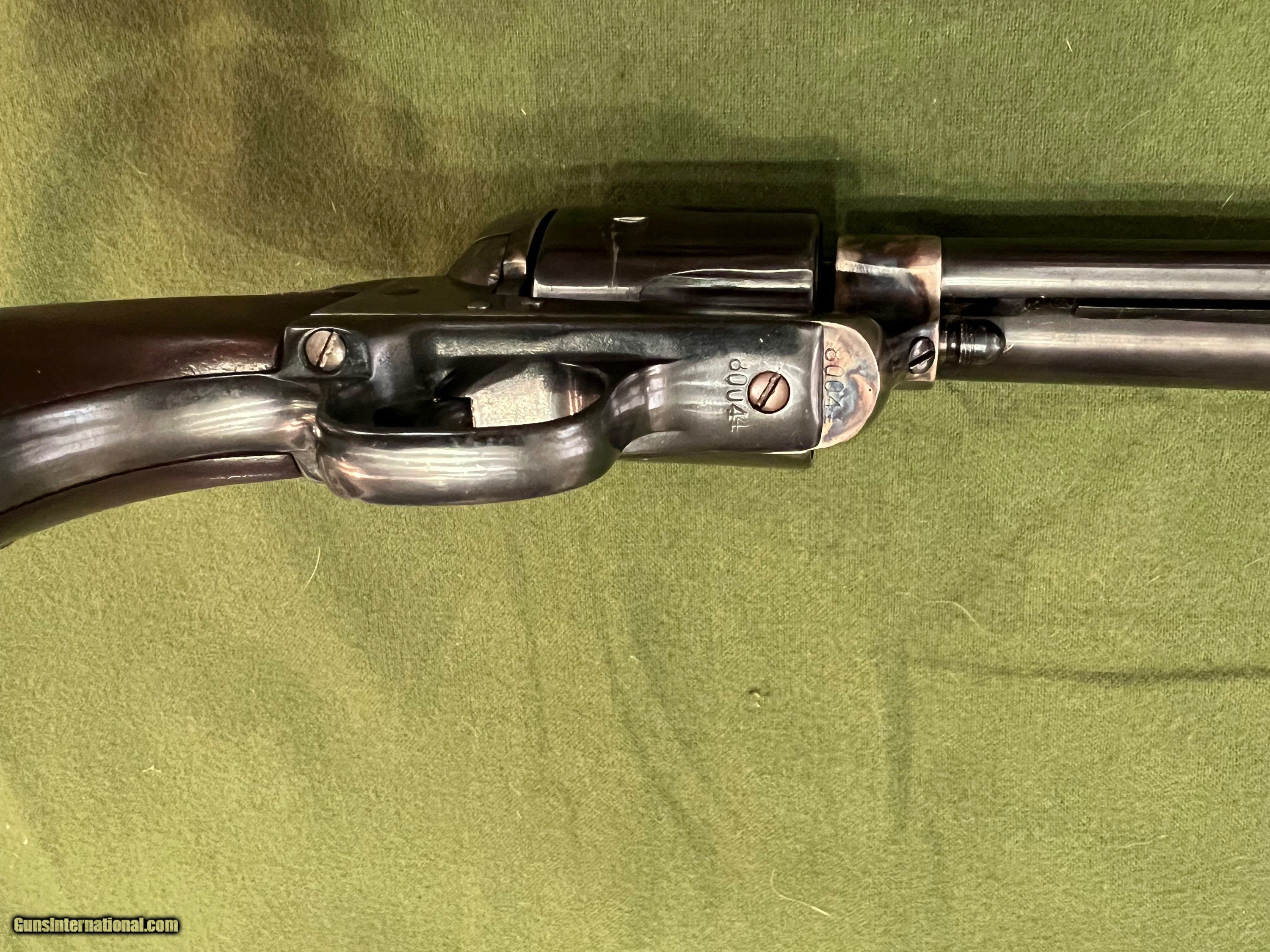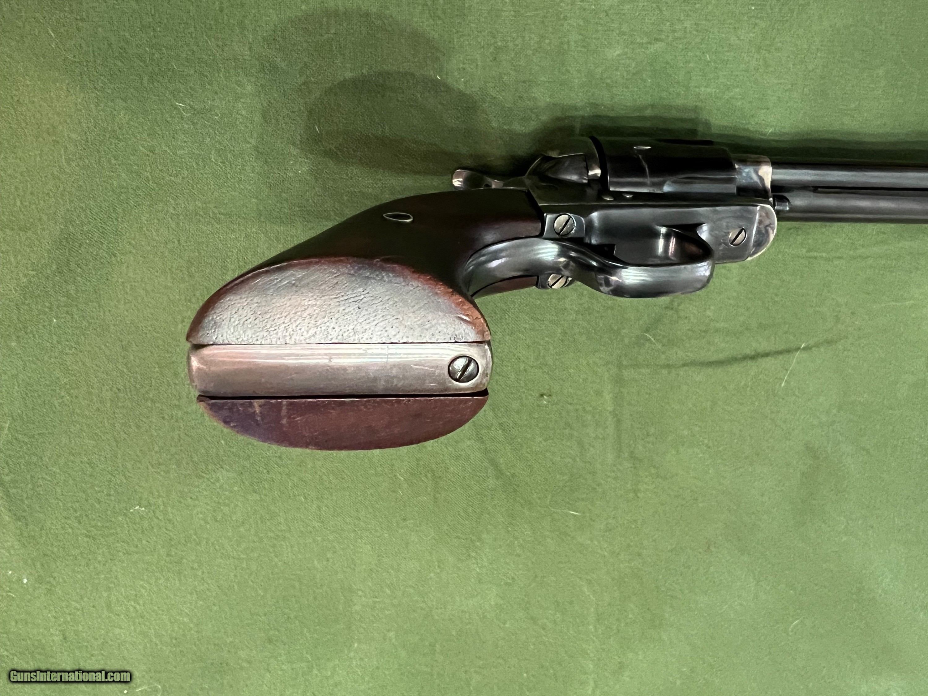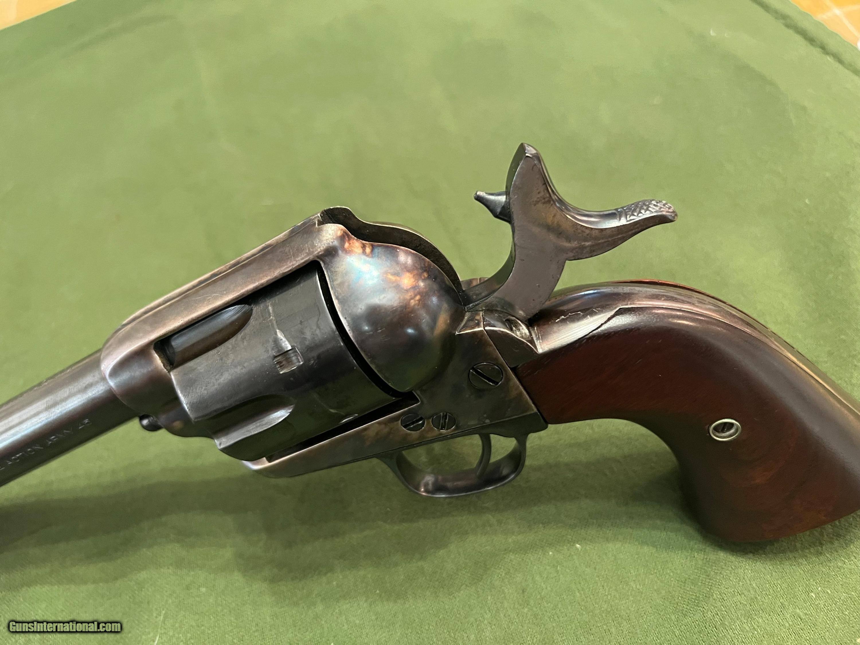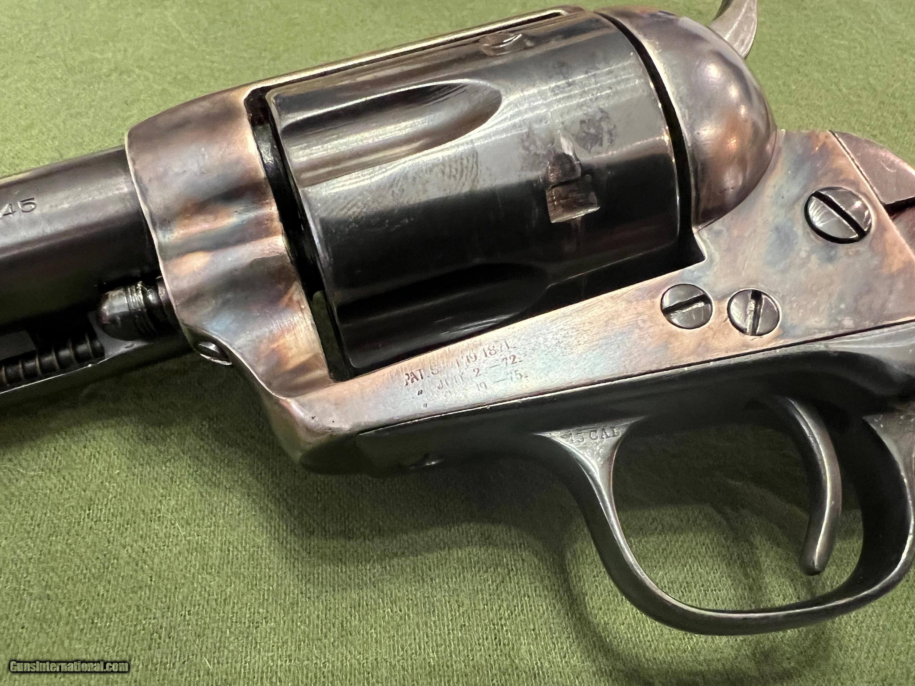 Description: Very nice Colt SAA 7 1/2 mfg in 1882. This Colt has had some restoration work done back in the 90's. Frame has been color case hardened and the barrel has been replaced with a 9/10 scale 2nd gen barrel. Originally it had rubber grips when shipped to Hibbard, Spencer, and Barrlett Co. back in July 27 1882. Now has beautiful walnut wood grips. Numbers match on frame and trigger guard, no numbers visible on cylinder or backstrap. Action is very smooth as it should be. SOLD Antique: Yes Manufacturer: Colt Model: SAA Serial Number: 80044 Barrel Length: 7.5 inches Condition: Excellent Metal Condition: Blue Wood Condition: New Bore Condition: 9/10 |