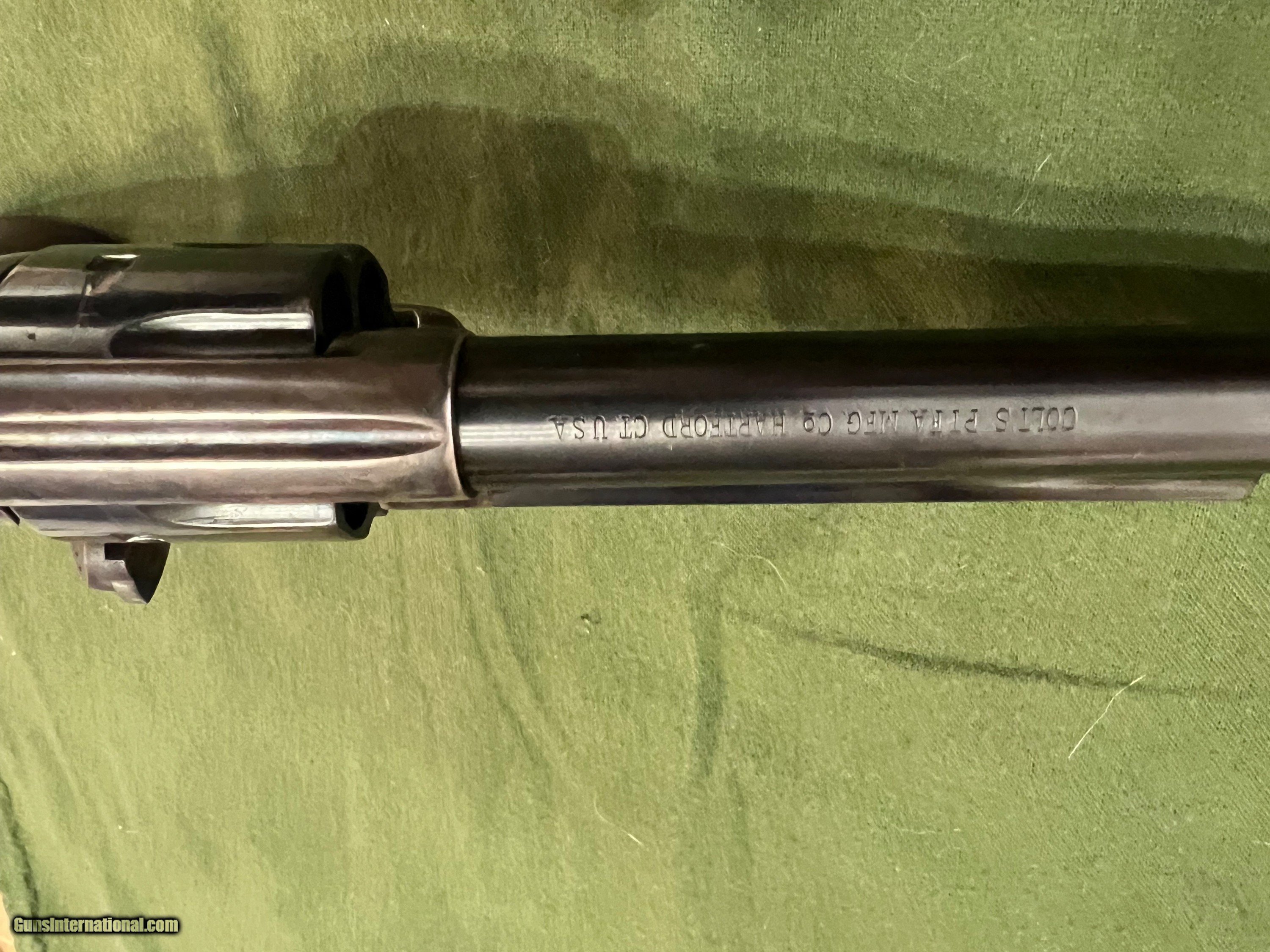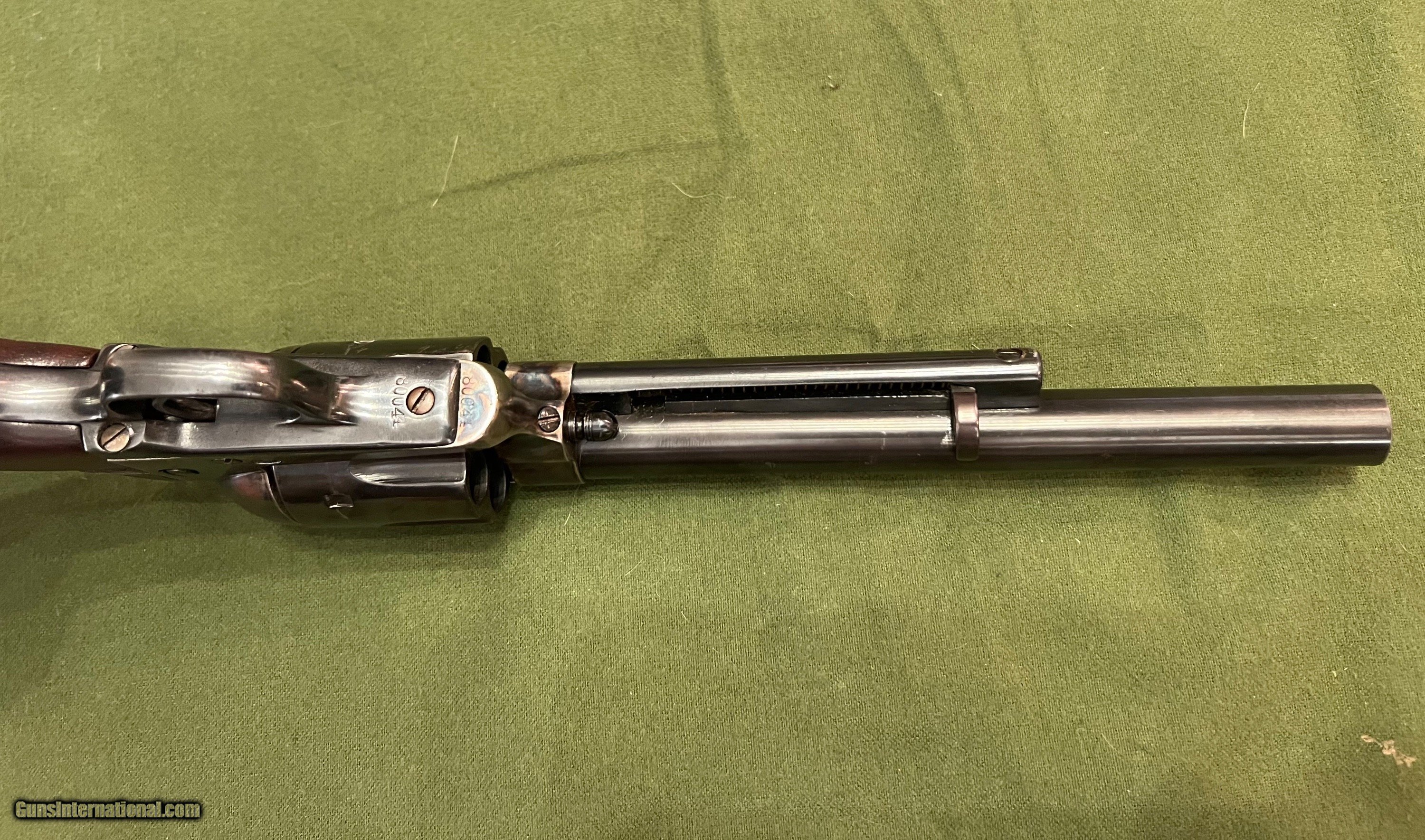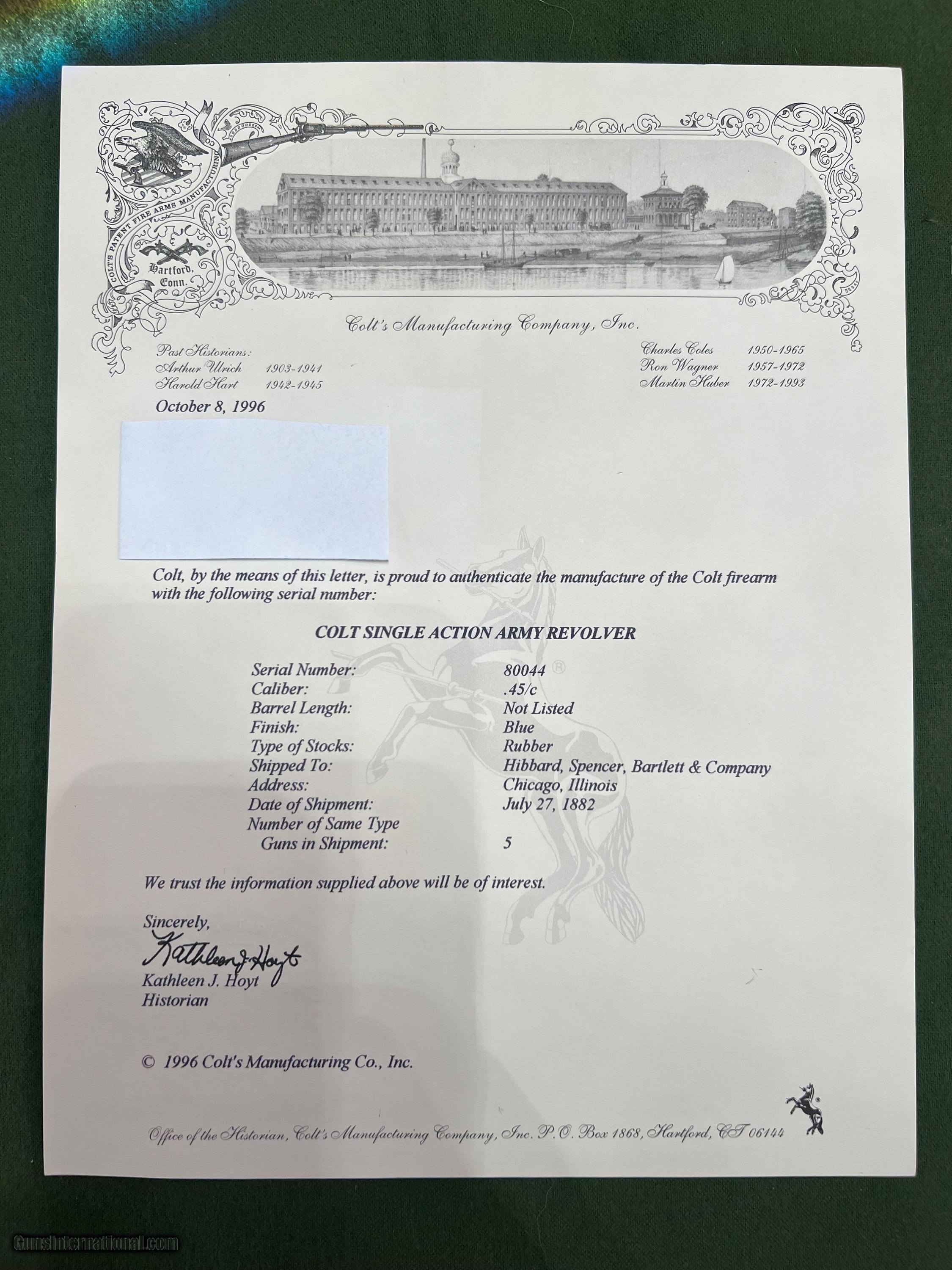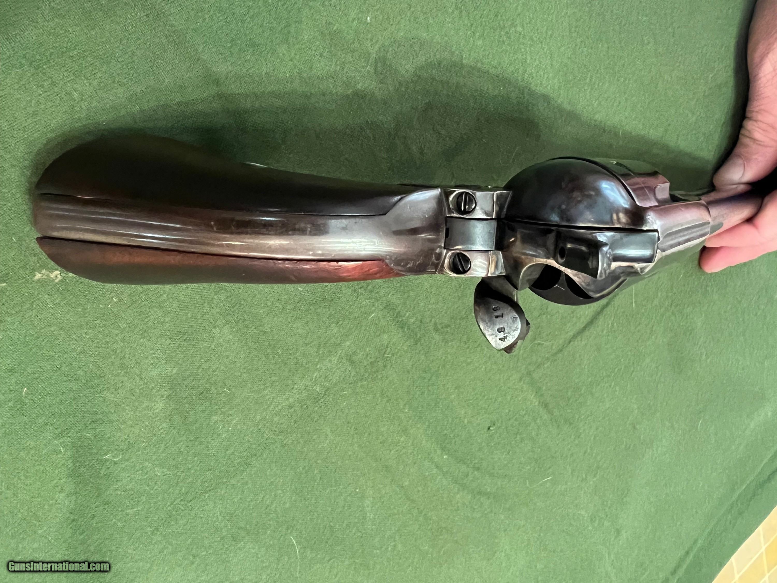 Description: Very nice Colt SAA 7 1/2 mfg in 1882. This Colt has had some restoration work done back in the 90's. Frame has been color case hardened and the barrel has been replaced with a 9/10 scale 2nd gen barrel. Originally it had rubber grips when shipped to Hibbard, Spencer, and Barrlett Co. back in July 27 1882. Now has beautiful walnut wood grips. Numbers match on frame and trigger guard, no numbers visible on cylinder or backstrap. Action is very smooth as it should be. SOLD Antique: Yes Manufacturer: Colt Model: SAA Serial Number: 80044 Barrel Length: 7.5 inches Condition: Excellent Metal Condition: Blue Wood Condition: New Bore Condition: 9/10 |
