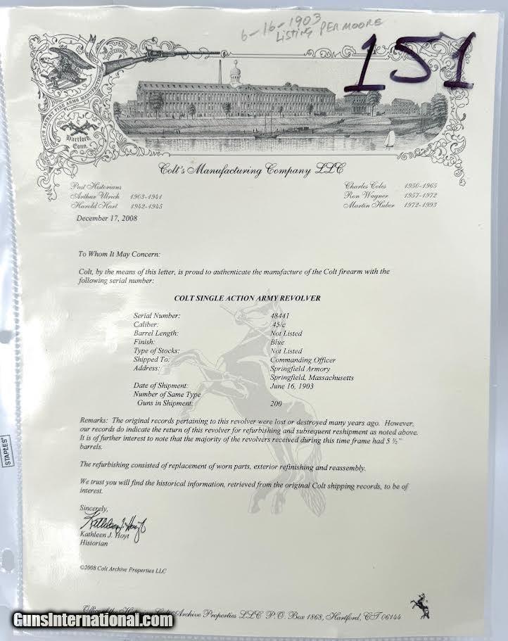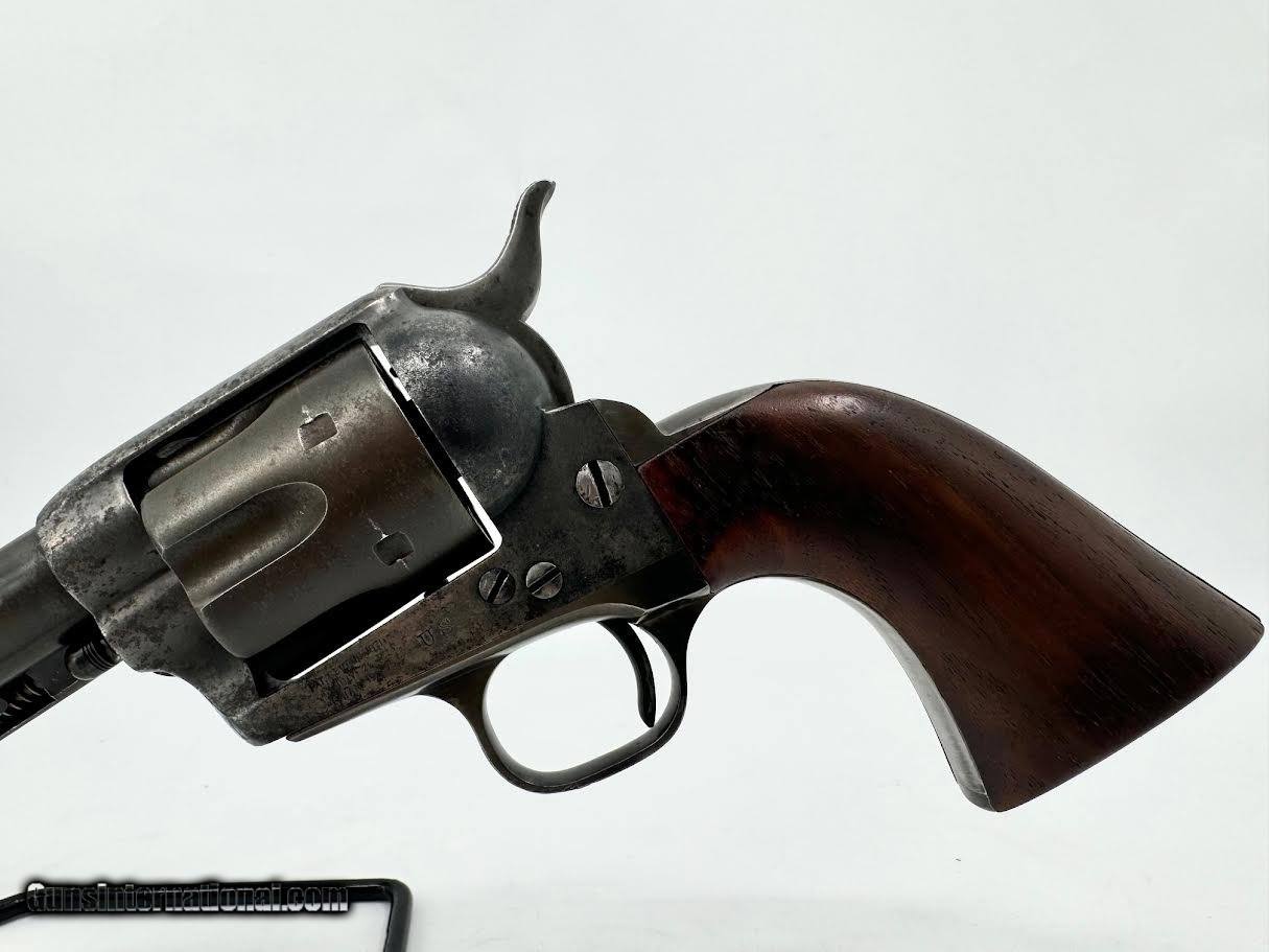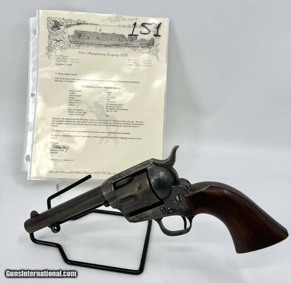 Description: Guns Listing ID: 1380711 Colt Single Action Army .45 colt revolver made in 1903 with Colt Historian Letter, Gun was shipped to the US ARMY Command on June 16, 1903. SOLD Manufacturer: COLT Model: SAA ARTILLERY 1ST GEN Caliber Info: .45 COLT/.45 ACP Condition: Used - Non-Certified Barrels: 5.5 BARREL Finish: BLUED |
